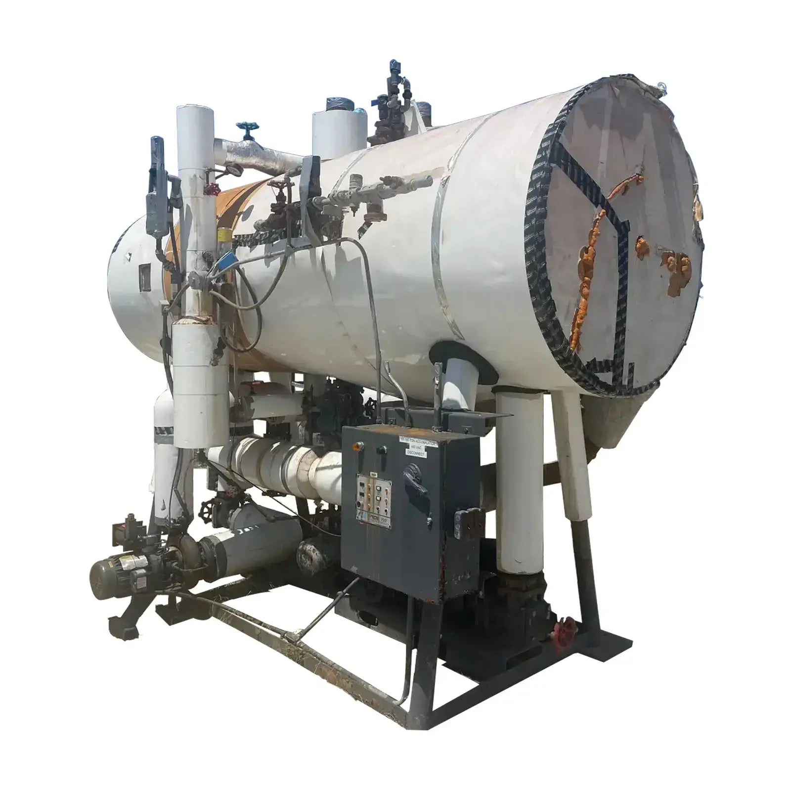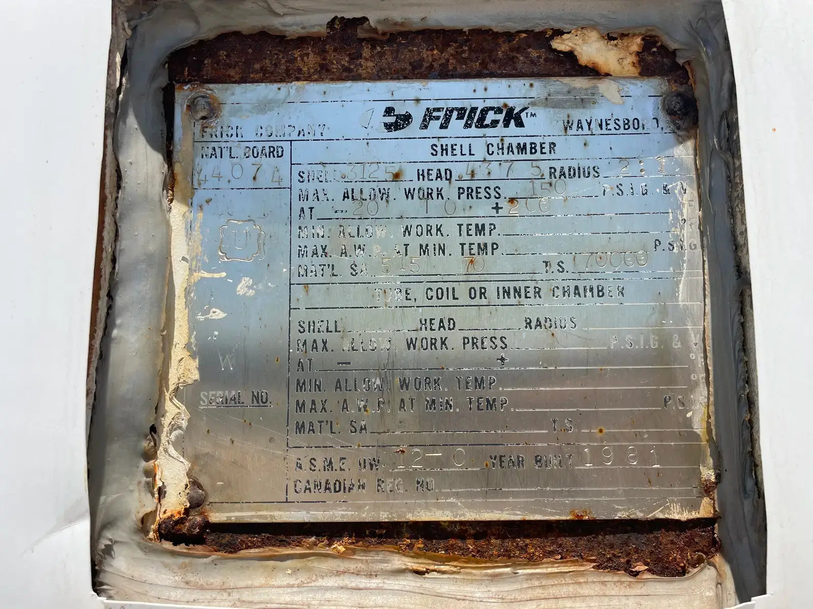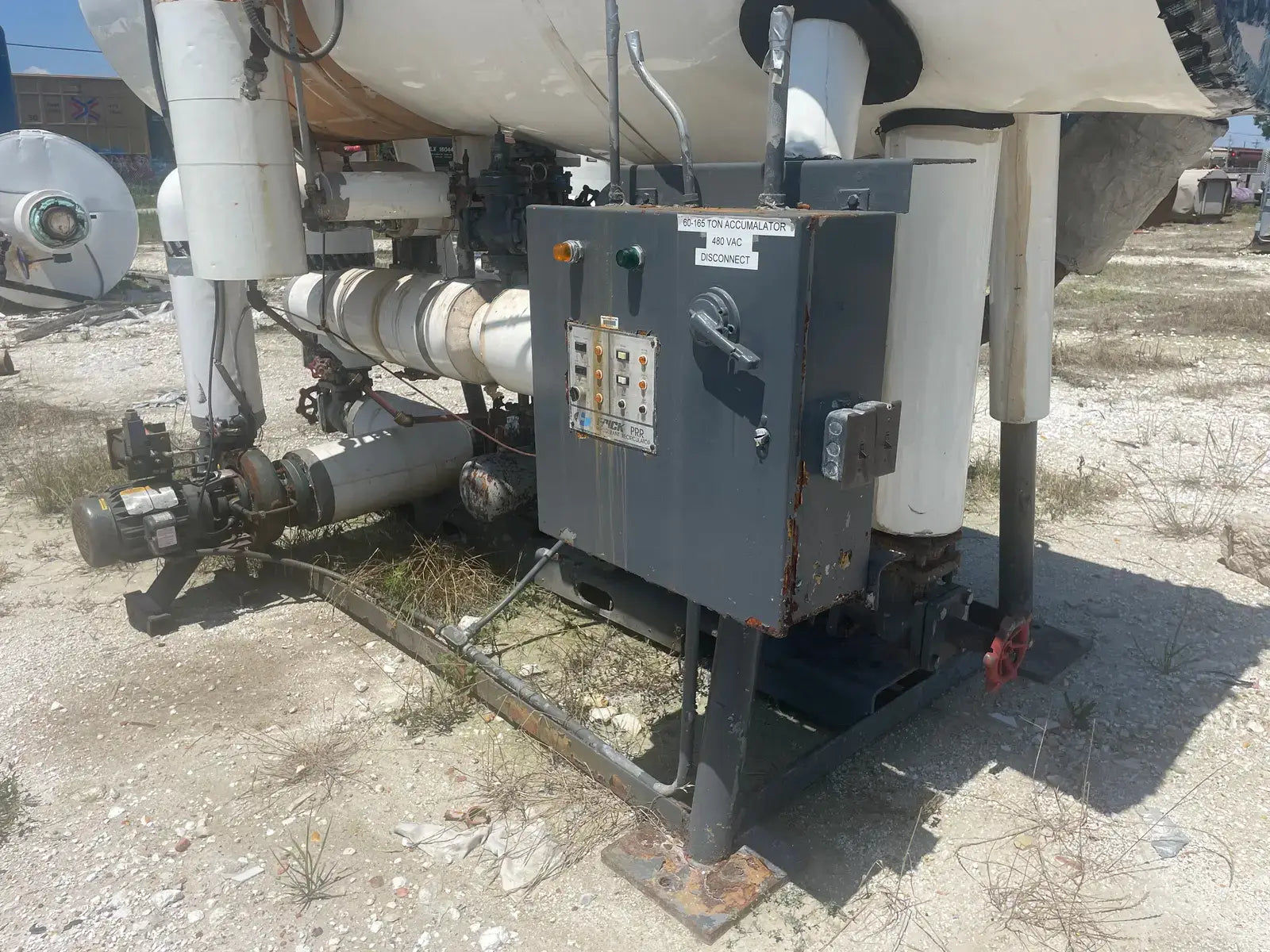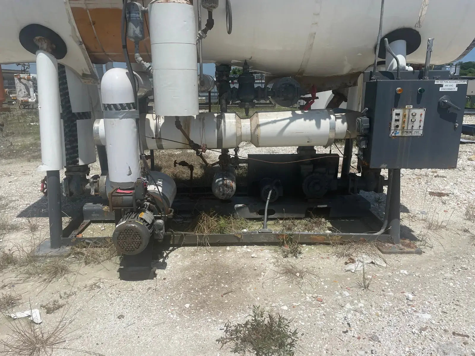 Frick PRR Horizontal Ammonia Recirculator. National Board: 44074. Shell Chamber: Max Allowable Working Pressure: 150 PSIG @ -20 F to 200 F. Capacity: 60-165 Ton. Mat'l SA: 515 70, Year Built: 1981. ASME OW: 12-C. Cornell Ammonia Pump (1): Model: 2CB-5-4. Serial No: 119352 10.19. Year Built: 2000. GPM 120. PSID: 30. Frick Oil Pot: Shell: .277. Head: 0.25. Max Allowable Pressure: 150 PSIG @ 200 F. Estimated Capacity: 700 Gallons. Overall Vessel Dimensions: 38dia X 132L