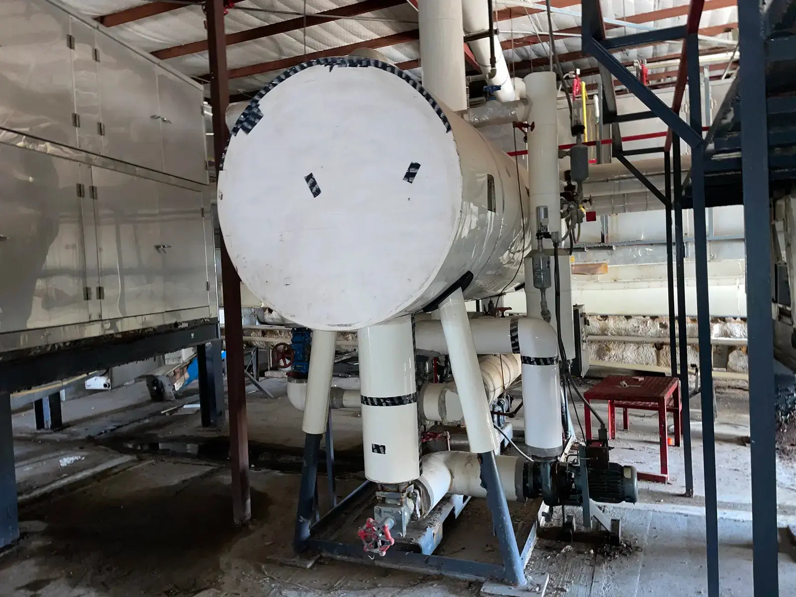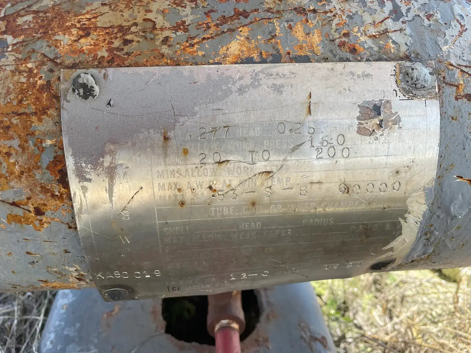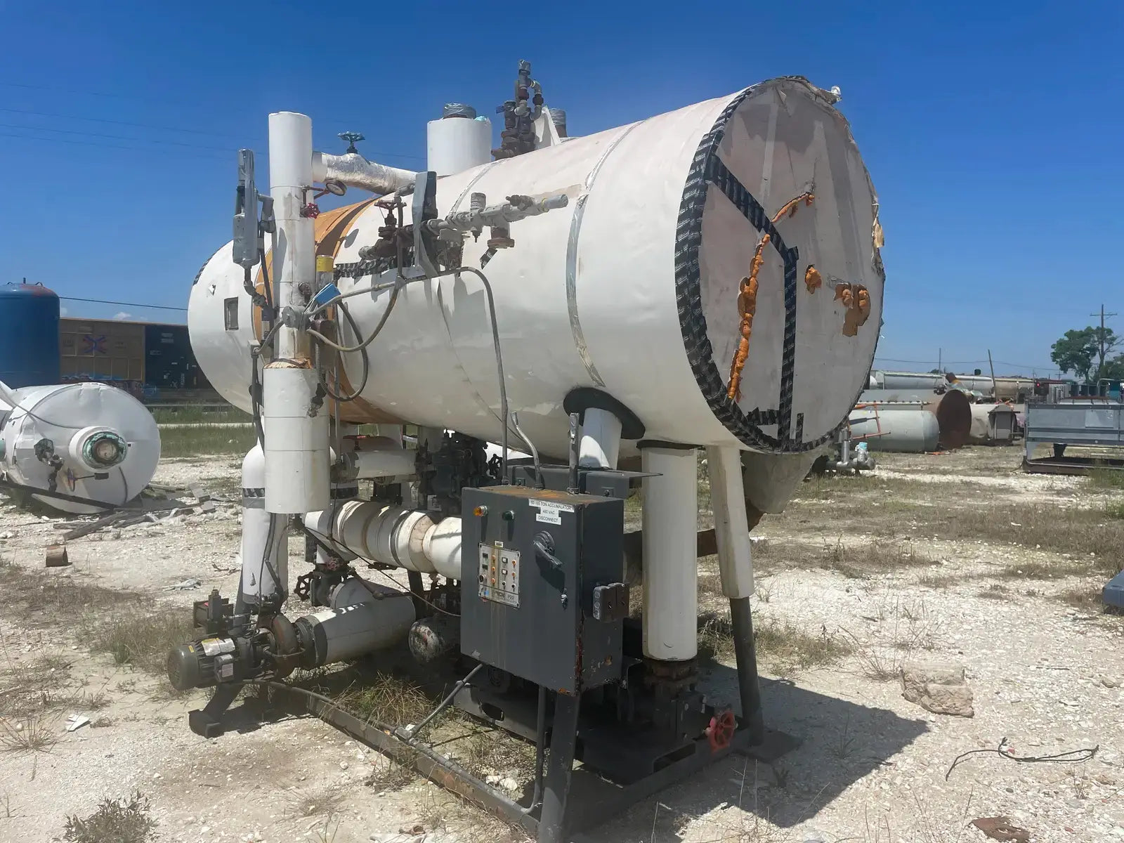 Frick PRR Horizontal Ammonia Recirculator. National Board: 44074. Shell Chamber: Max Allowable Working Pressure: 150 PSIG @ -20 F to 200 F. Capacity: 60-165 Ton. Mat'l SA: 515 70, Year Built: 1981. ASME OW: 12-C. Cornell Ammonia Pump (1): Model: 2CB-5-4. Serial No: 119352 10.19. Year Built: 2000. GPM 120. PSID: 30. Frick Oil Pot: Shell: .277. Head: 0.25. Max Allowable Pressure: 150 PSIG @ 200 F. Estimated Capacity: 700 Gallons. Overall Vessel Dimensions: 38dia X 132L