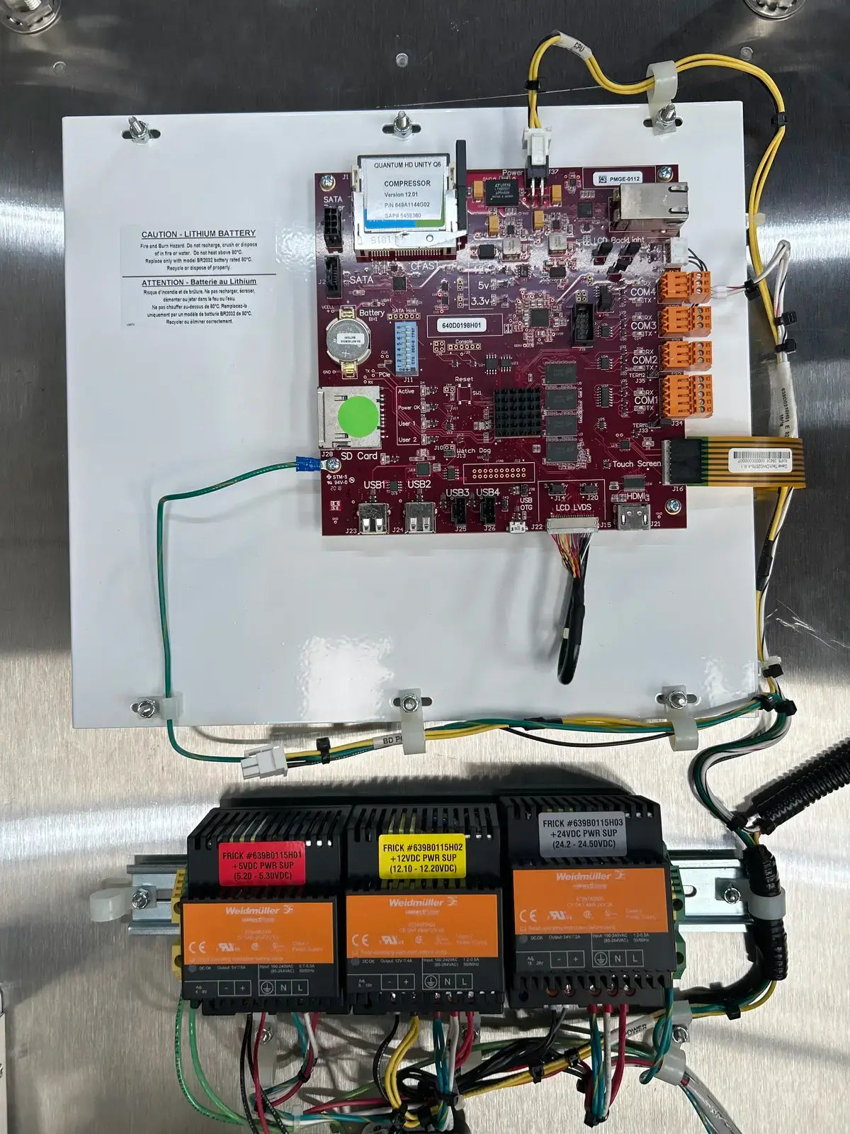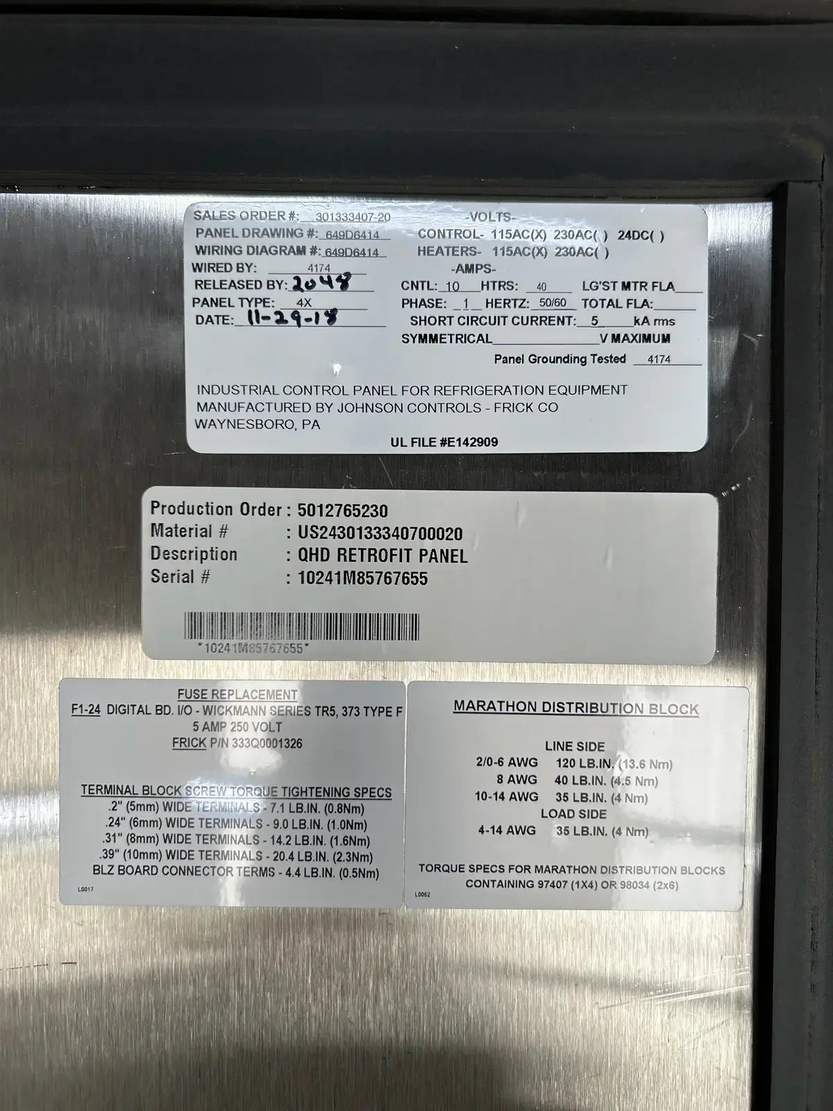Frick Quantum HD Screw Compressor Micro Control Panel. Type: Quantum HD Retrofit Panel. Serial No: 10241M85767655. Production Order: 5012765230. Sales Order: 301333407-20. Panel Drawing: 649D6414. Stainless Steel Type 4x Enclosure.