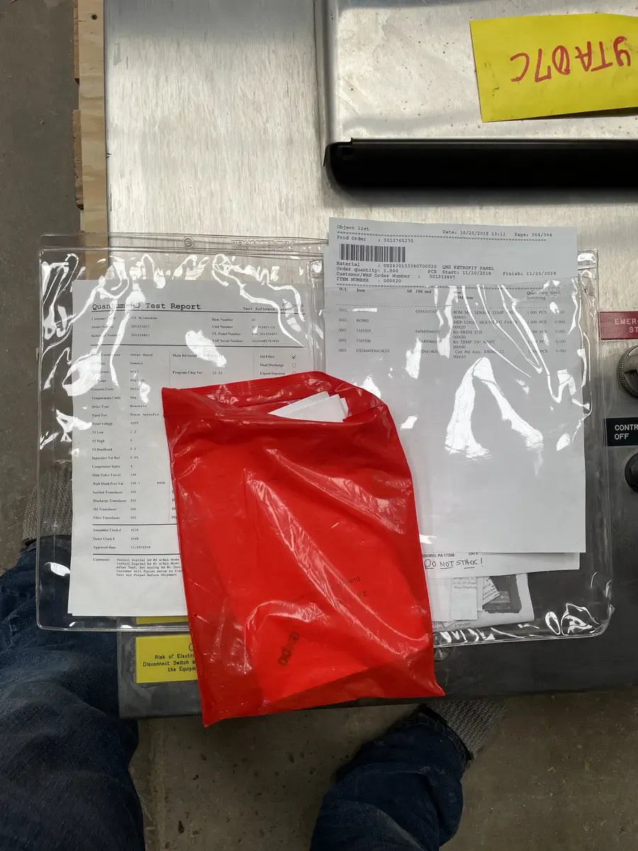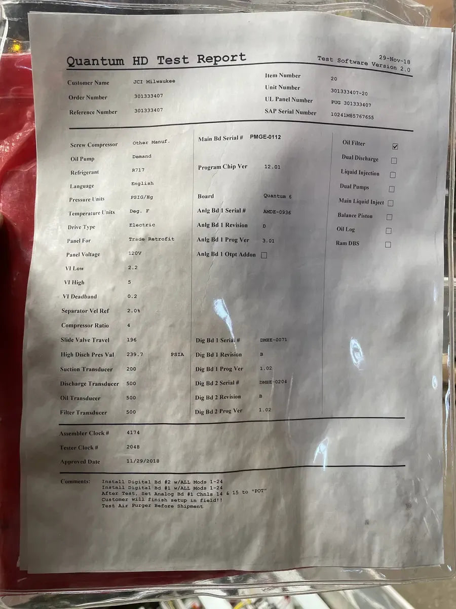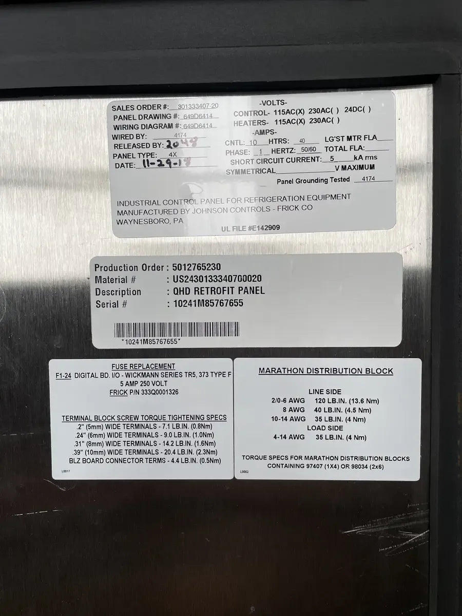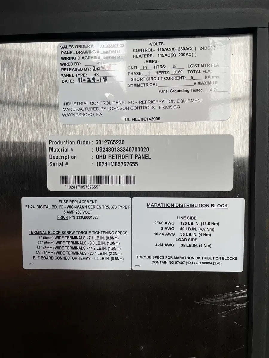 Frick Quantum HD Micro Panel - Model No: Q6-HD. Electric Rating: 120VAC. Order: 5012765230, Material No: US2430133340700020, Description: QHD Retrofit Panel, Serial No: 10241M85767655. Sales Order: 301333407, Panel Drawing: 649D6414, Wiring DiagRam Industries: 649D6414. Control Panel comes with a MiniPurge Control System. Model No: Q6-HD. Electric Rating: 120VAC. MiniPurge: Model No: 07 1ZLC/pm/IS, Sytem Type: Leakage Compensation, Serial No: 2018/ZM61547.