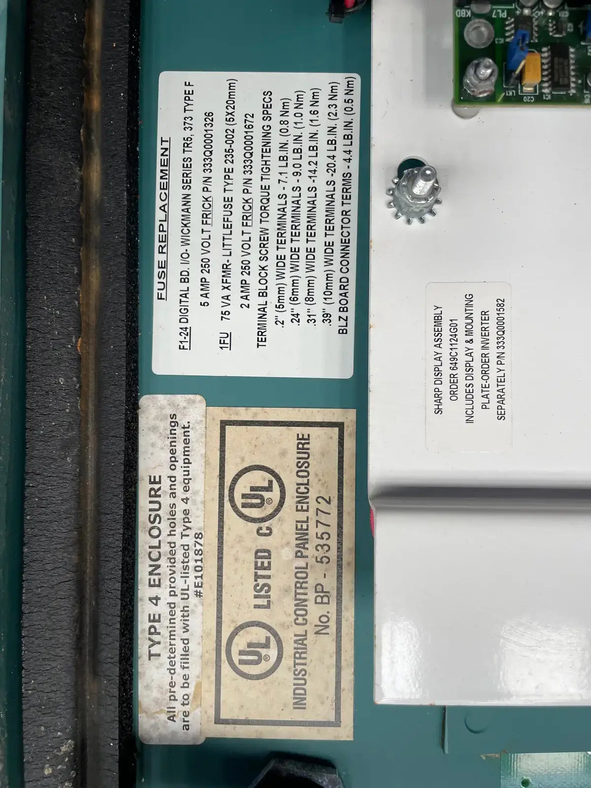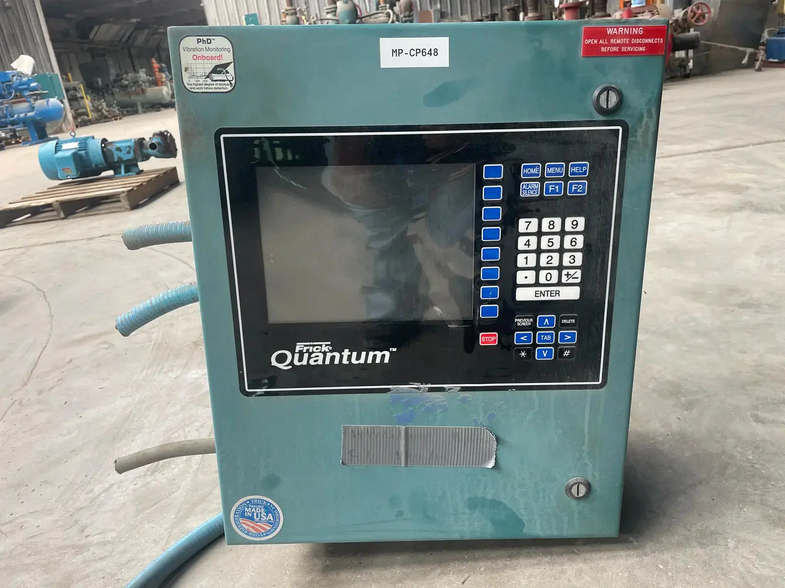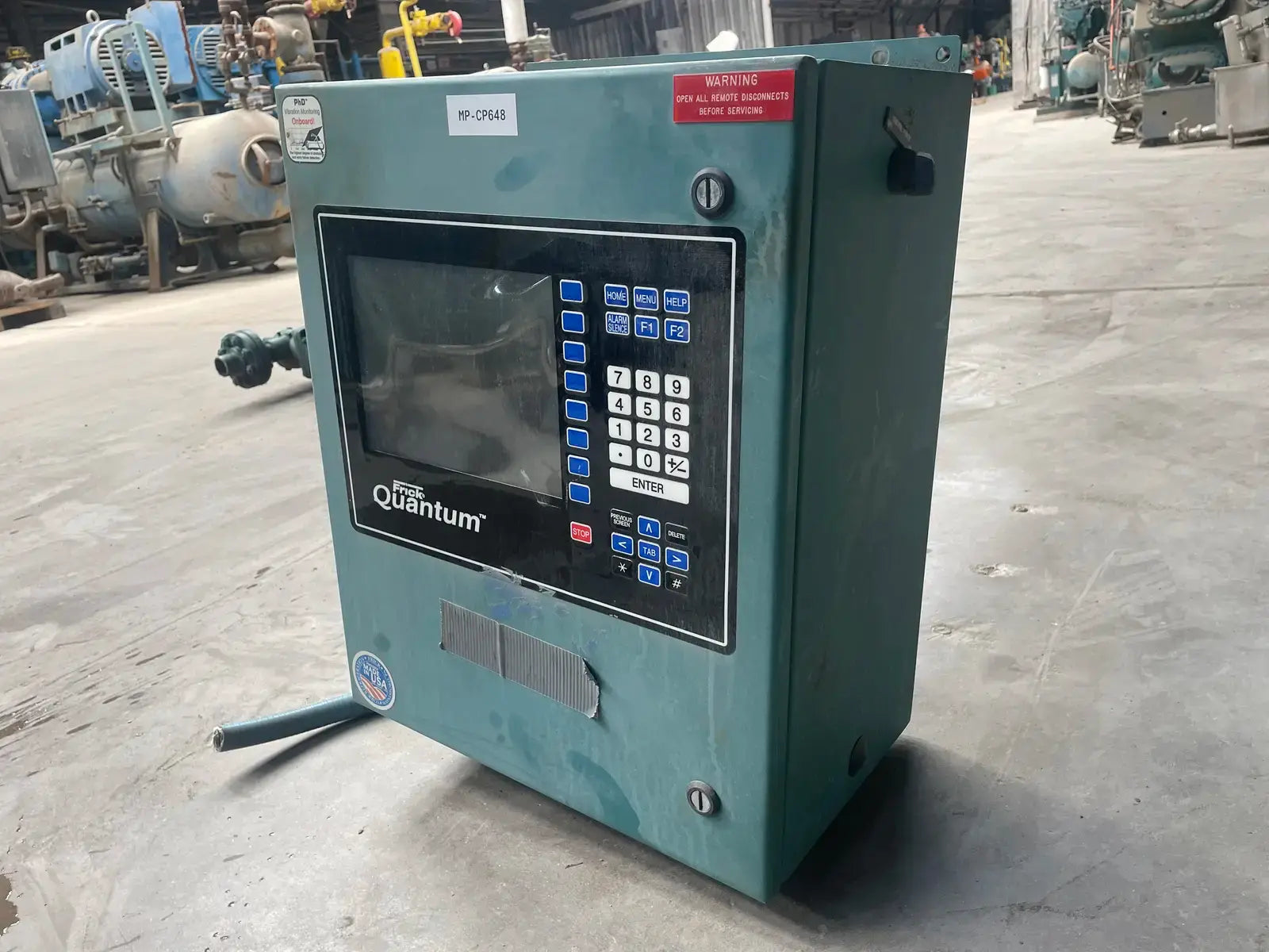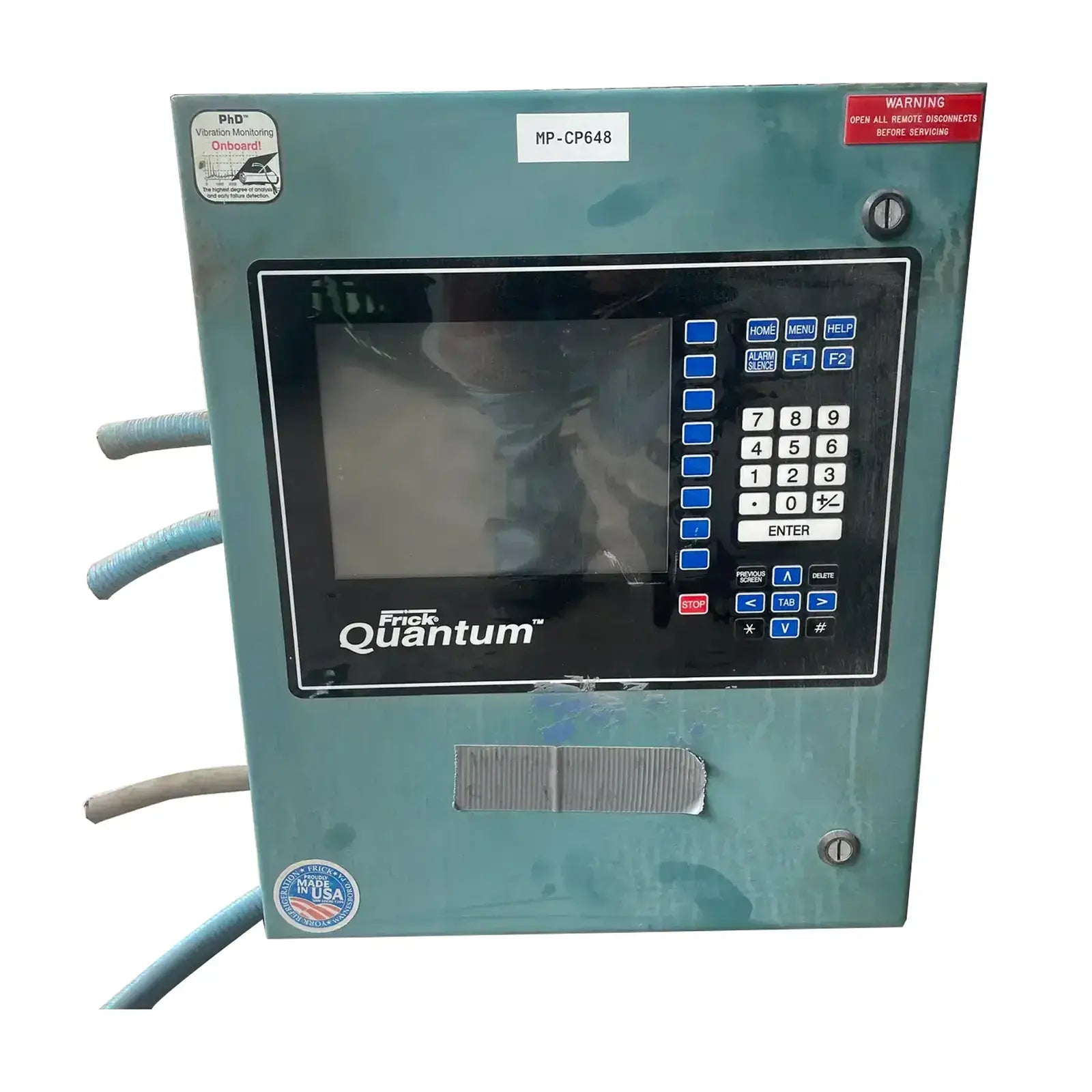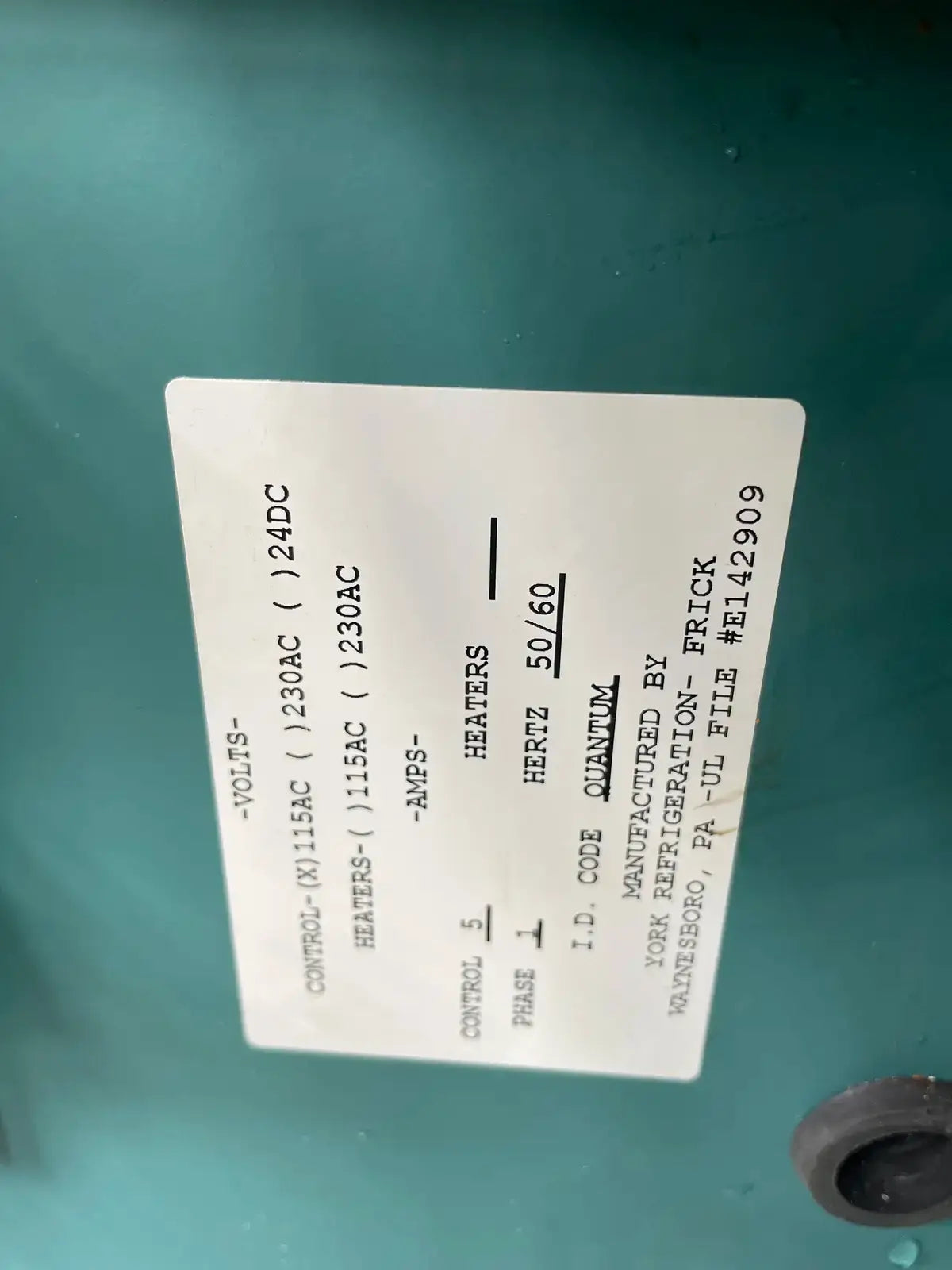 Frick Quantum Micro Control Panel. Model: Quantum. Power Supply - Volts - Control: 115 AC, Amps - Control: 5 Amps, Ph: 1, Hz: 50/60. I.D. Code: Quantum. UL File: E142909.