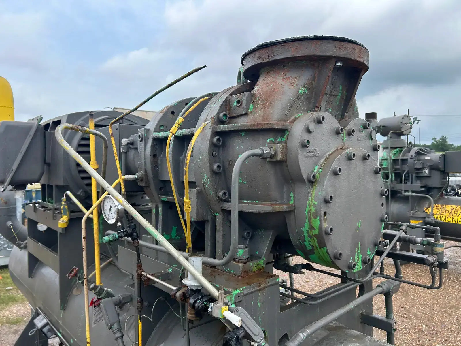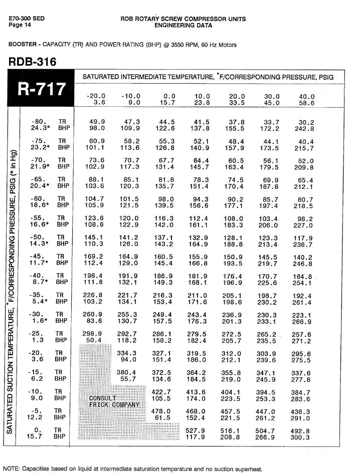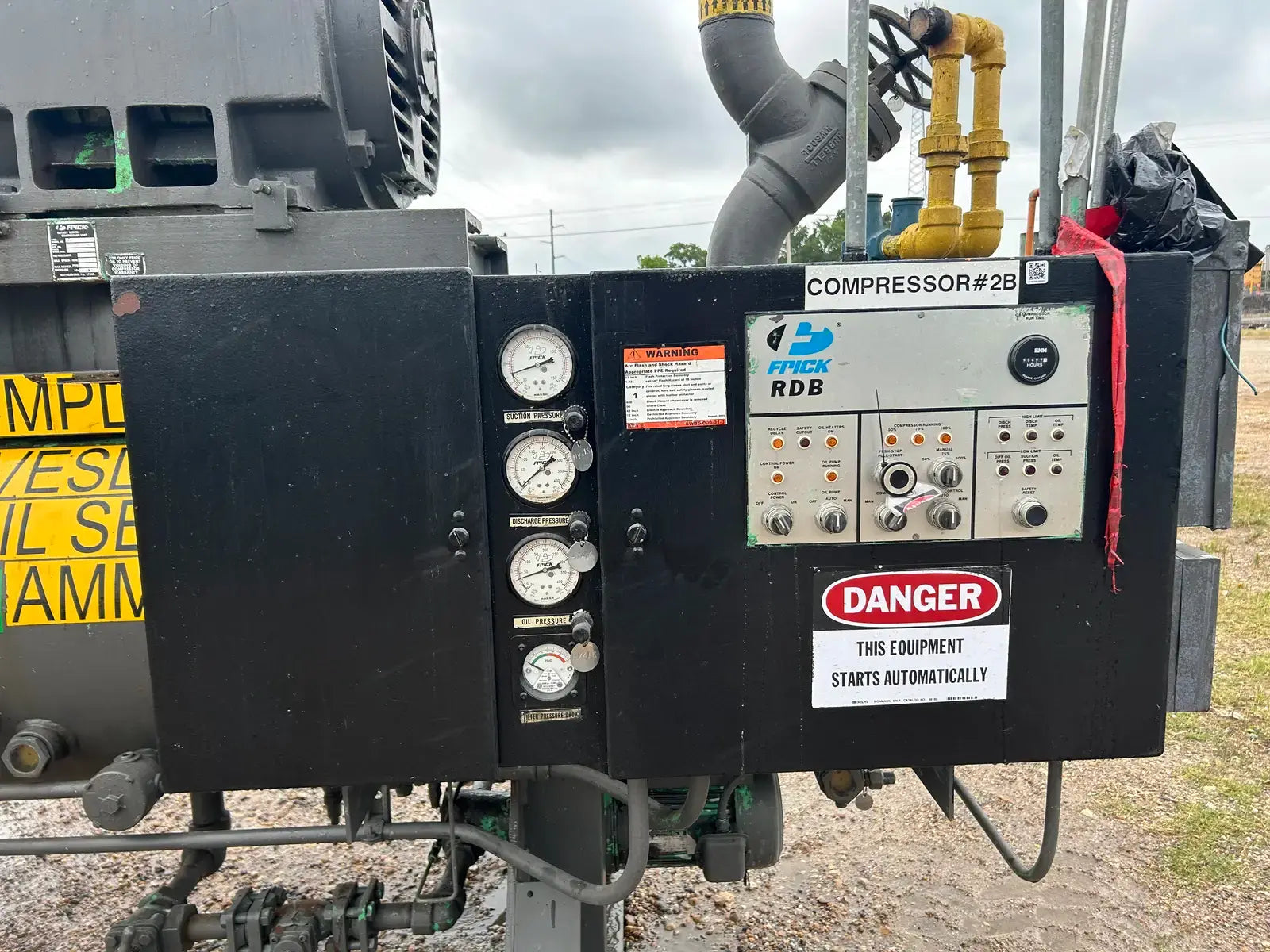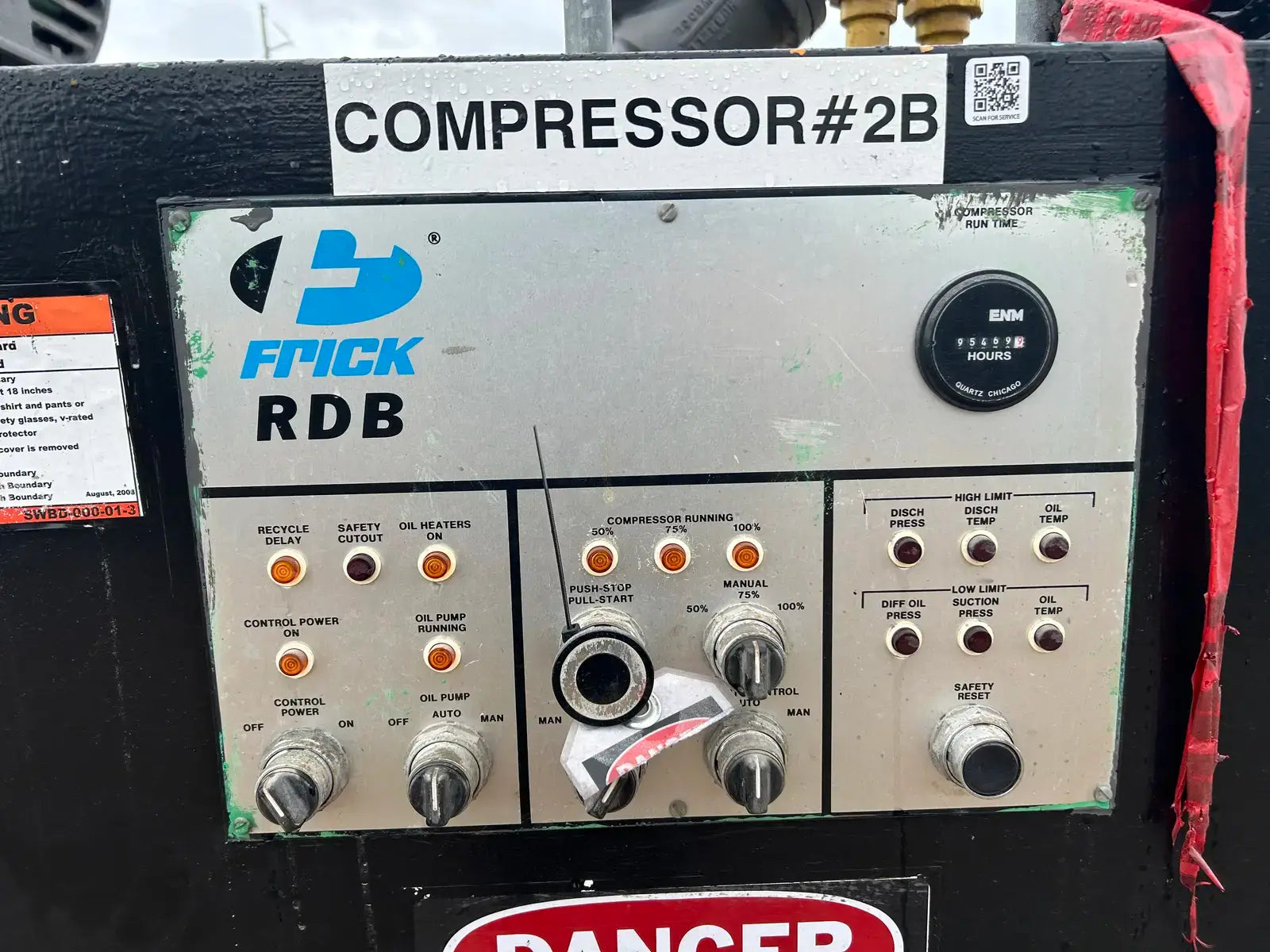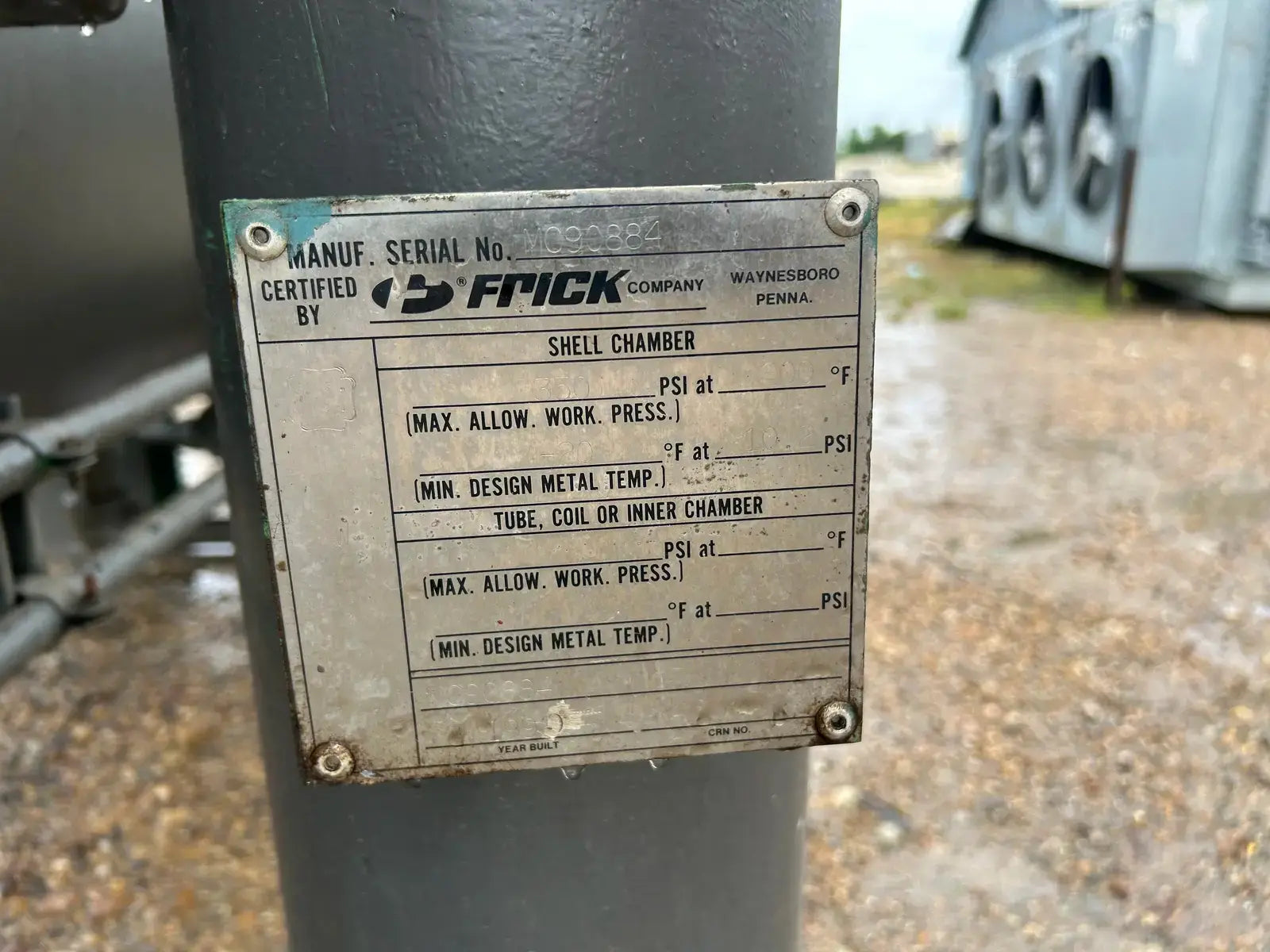 Frick RDB Rotary Screw Compressor Package. Model: RDB-316. Serial No: S0052JFEFLHAA3. Frick Sales Order: 263504-01. Refrigerant: R-717. Max Speed(RPM): 3600. Refrigerant:R-717(Ammonia). Max Design Pressure: 150 PSIG. Frick Bare Screw Compressor - Model: TDSL283S, Serial No: 0073GG. Refrigerant: NH3/R22. Volume Ratio: 2.8. Max Speed(RPM): 3600. Design Pressure(PSIG): 362. Certified by Frick Oil Separator - National Board: 95170, MAWP: 150 PSI @ 200 F, MDMT: -20 F @ 10.2 PSI.