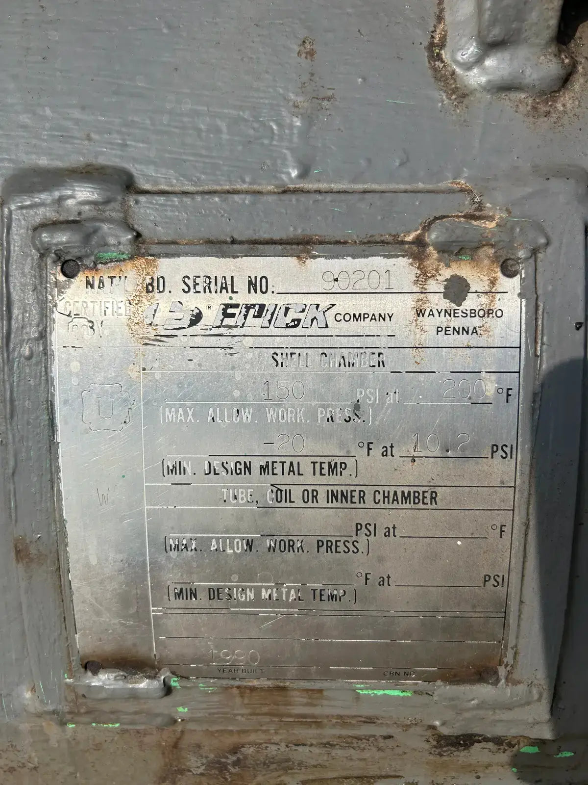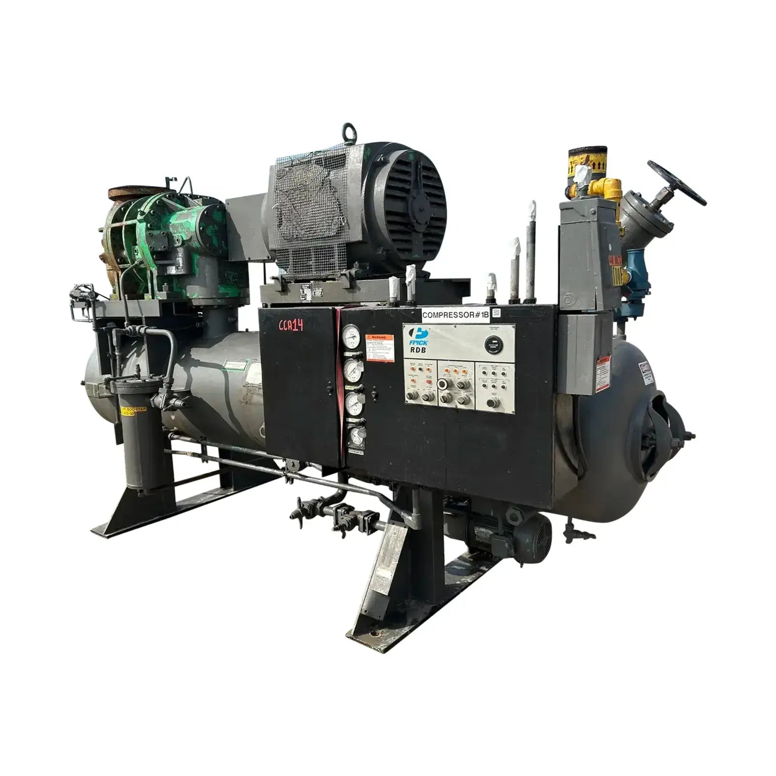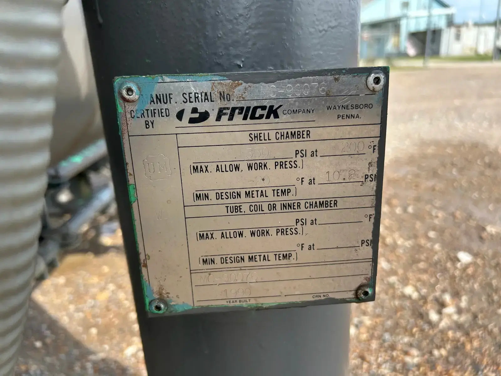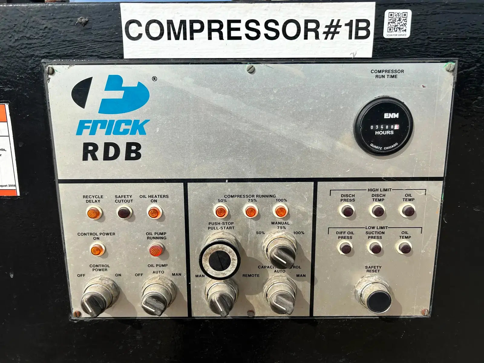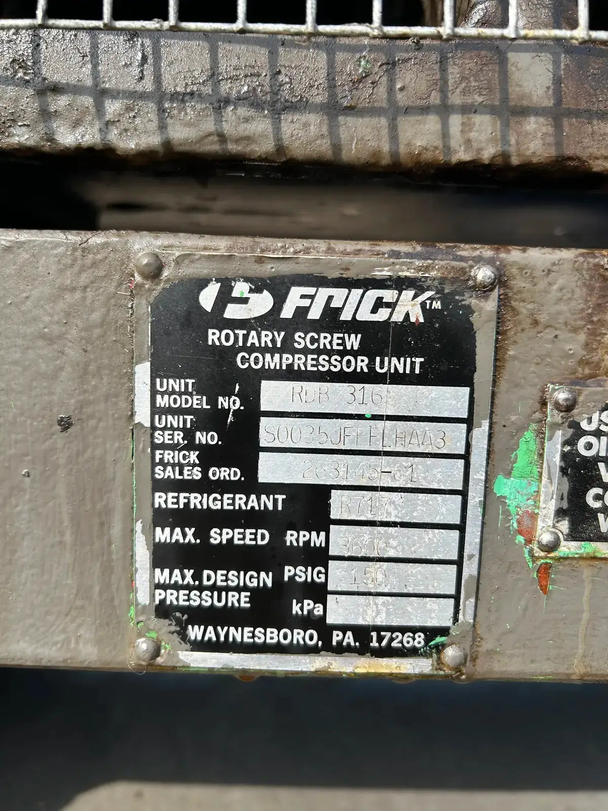 Frick RDB Series Screw Compressor Package. Model No: RDB-316. Serial No: S0035JFEFLHAA3. Frick Sales Order: 263145-01. Refrigerant: R-717. Max Speed(RPM): 3600. Max Design Pressure: 150 PSIG. Frick Bare Screw Compressor - Model: TDSL283S, Serial No: 0051GG, Refrigerant: NH3/R22, Volume Ratio: 2.8, Max Speed(RPM): 3600, Max Design Pressure(PSIG): 2500. Certified By Frick Oil Separator - National Board: 90201, MAWP: 150 PSI @ 200 F, MDMT: -20 F @ 10.2 PSI, Year Built: 1990.