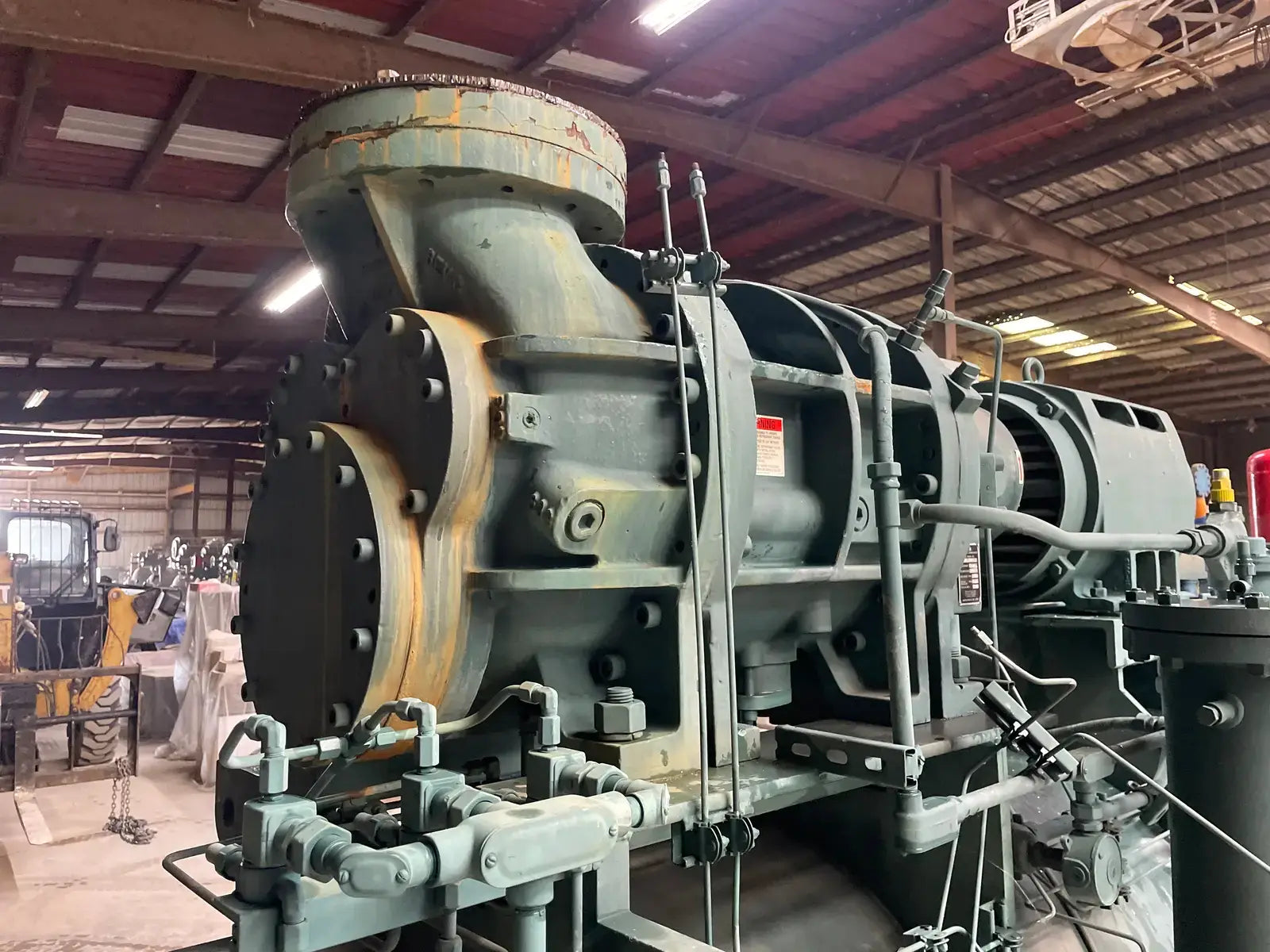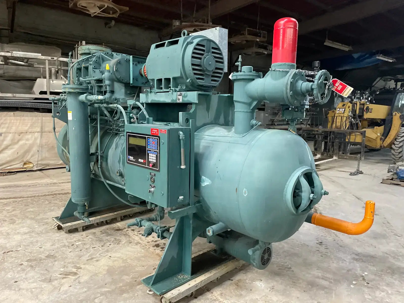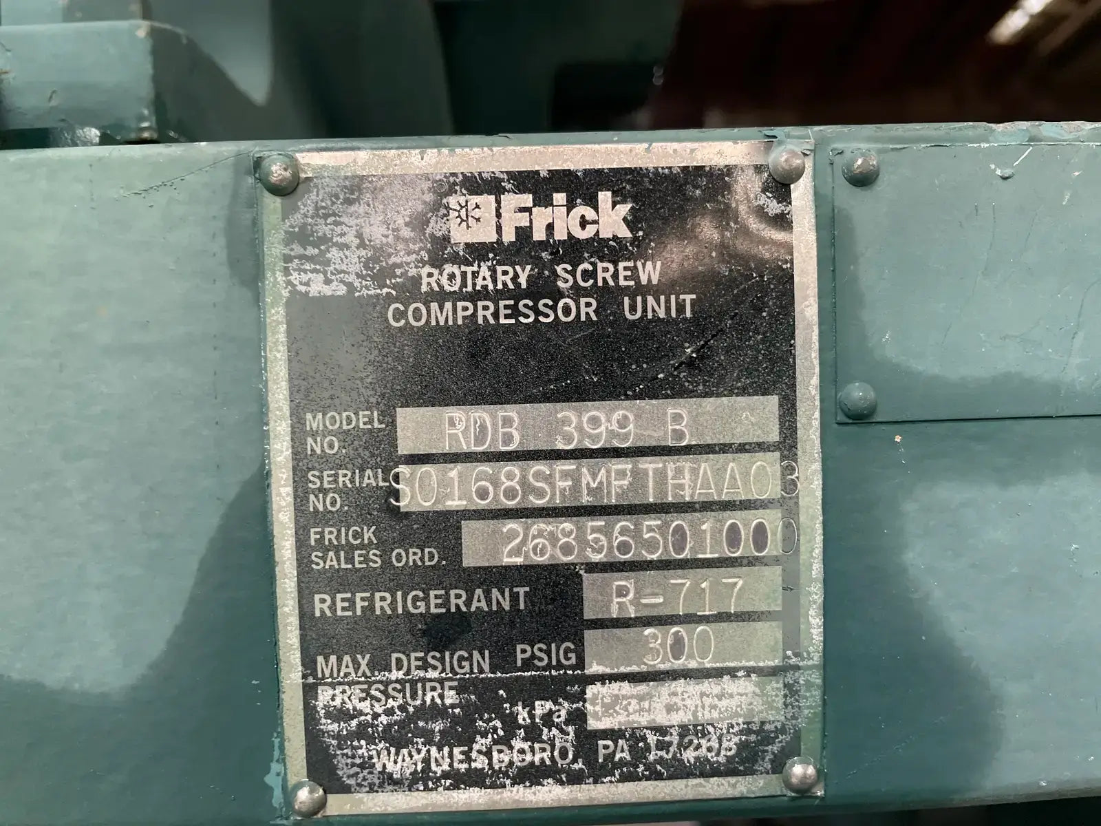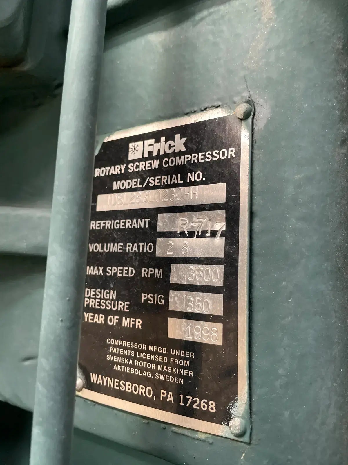 Frick Rotary Screw Compressor Package. Model: RDB-399-B. Serial No: S0168SFMFTHAA03. Frick Sales Order No: 26856501000. Refrigerant: R-717. Max Design Pressure: 300 PSIG. Hours: 50761.5. Frick Bare Screw Compressor: Model/Serial: TDSL283L0230HH. Refrigerant: R-717. Volume Ratio: 2 8. Max Speed: 3600 RPM. Design Pressure: 350. Year Of Mfr: 1998. Certified by Frick Oil Separator: National Board No: 138636. Shell Chamber: MAWP: 300 PSI @ 200 F. MDMT: -20 F @ 300 PSI. Year Built: 1999. Frick RDB Plus Control Panel.