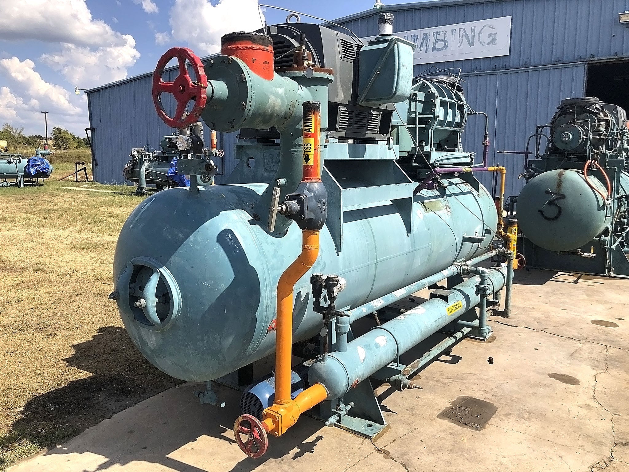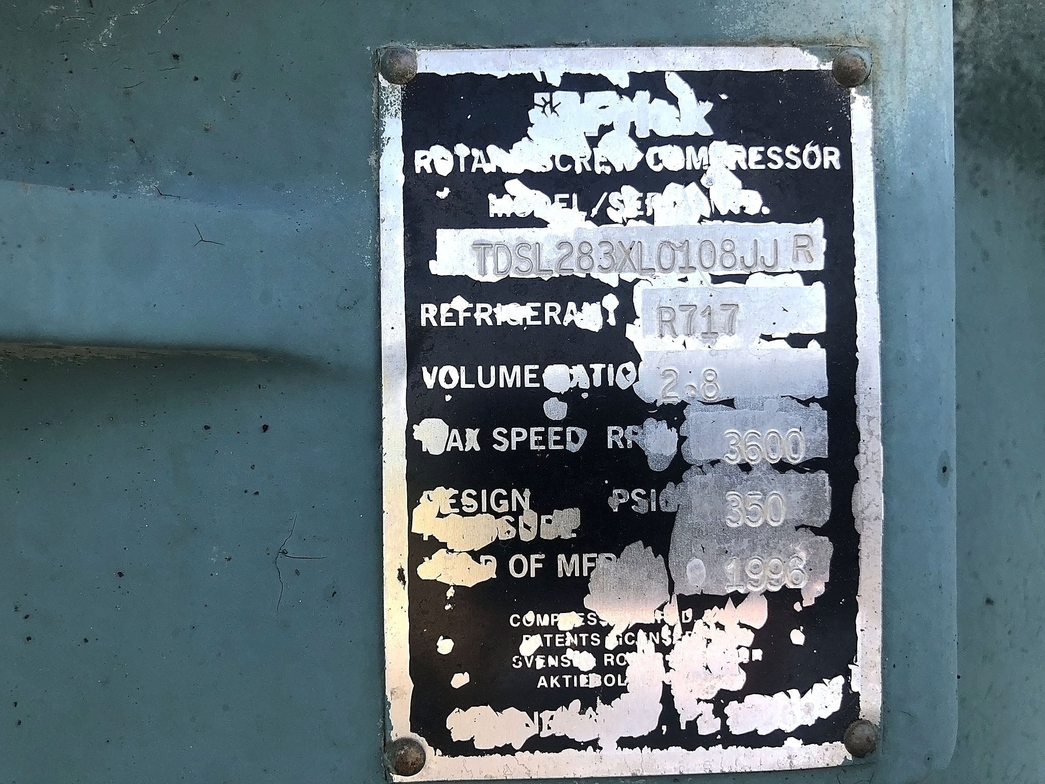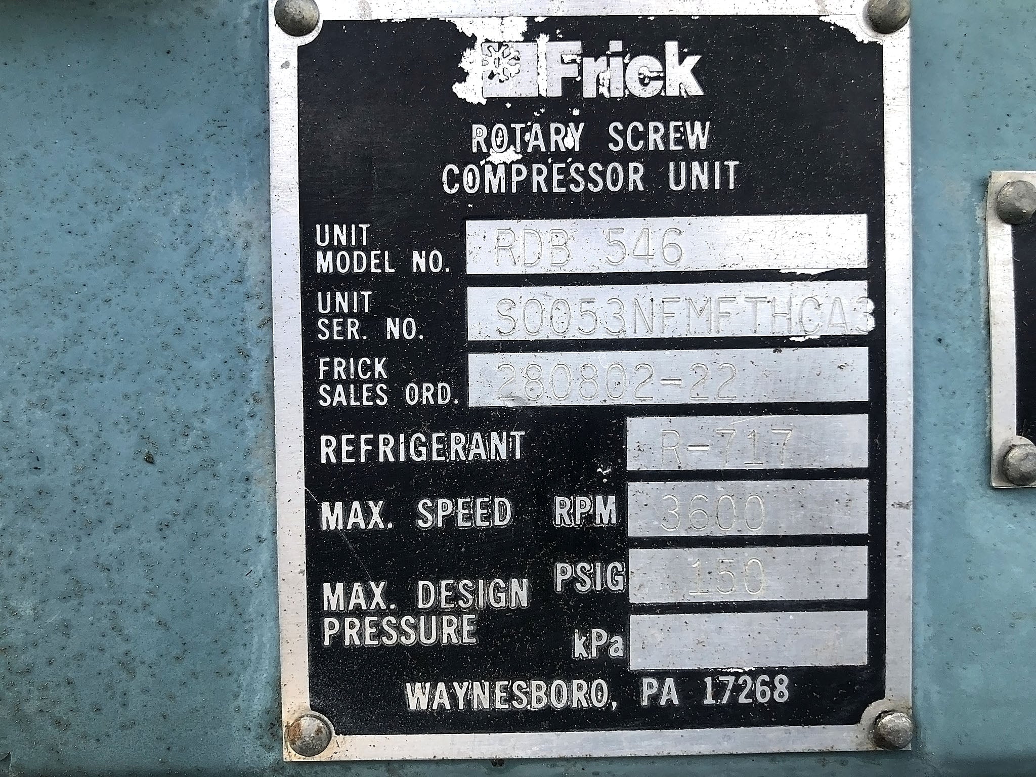 FRICK Screw Compressor Sales Order: 280802-22 Model: RDB-546 Serial # S0053NFMFTHCA3. Screw Model #: TDSL283XL0108JJR. Separator: N/B #119346 Thermo-siphon: N/B #120117. Volume Ratio: 2.2/5.0, TECO MOTOR 400 HP, BHP 336.9, Frame 5009A, TYPE: ASHA-PA001DP, 4160 VOLT 3 PHASE 60 HZ., AMPS: 87.9 / 48.8, NEMA DESIGN B, BEARINGS: 6314C3/6314C3, RPM: 3565. 36,081 Hours After Seaboard Foods built their new engine room, we purchased their entire original engine room in Oklahoma, USA. Includes an updated HD Micro Panel.