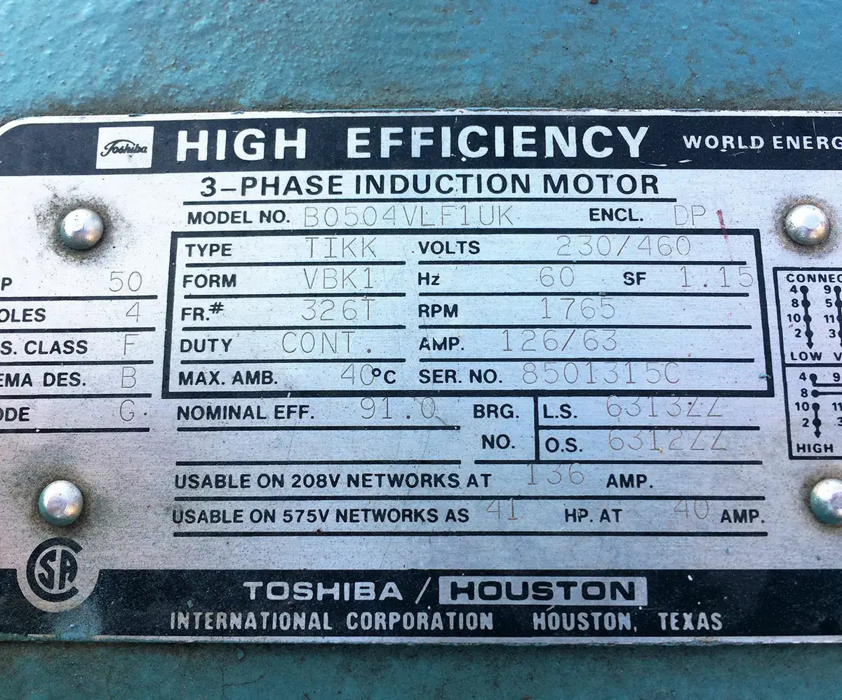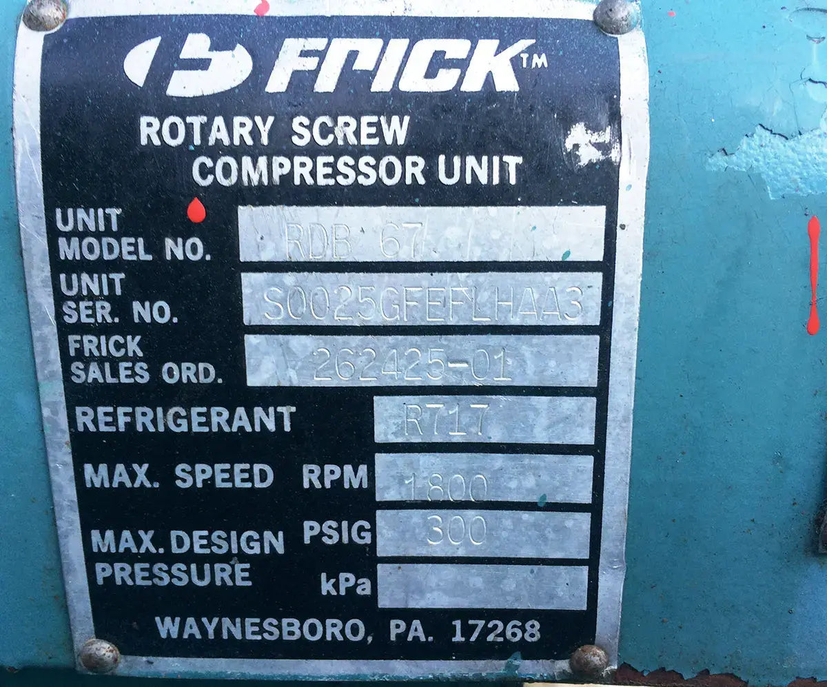 Frick Rotary Screw Compressor Package. Model: RDB-67. Serial SO025GFEFLHAA3. Sales ord r262425-01. Refrigerant: R-717. Compressor model: TDSL193L0077DD. Volume ratio: 2.8. Toshiba electric motor: 50 HP, 1765 RPM, 208-230/460V,126/63 amps, 60 Hz, 3-phase, 326T Frame, also usable on 575V.