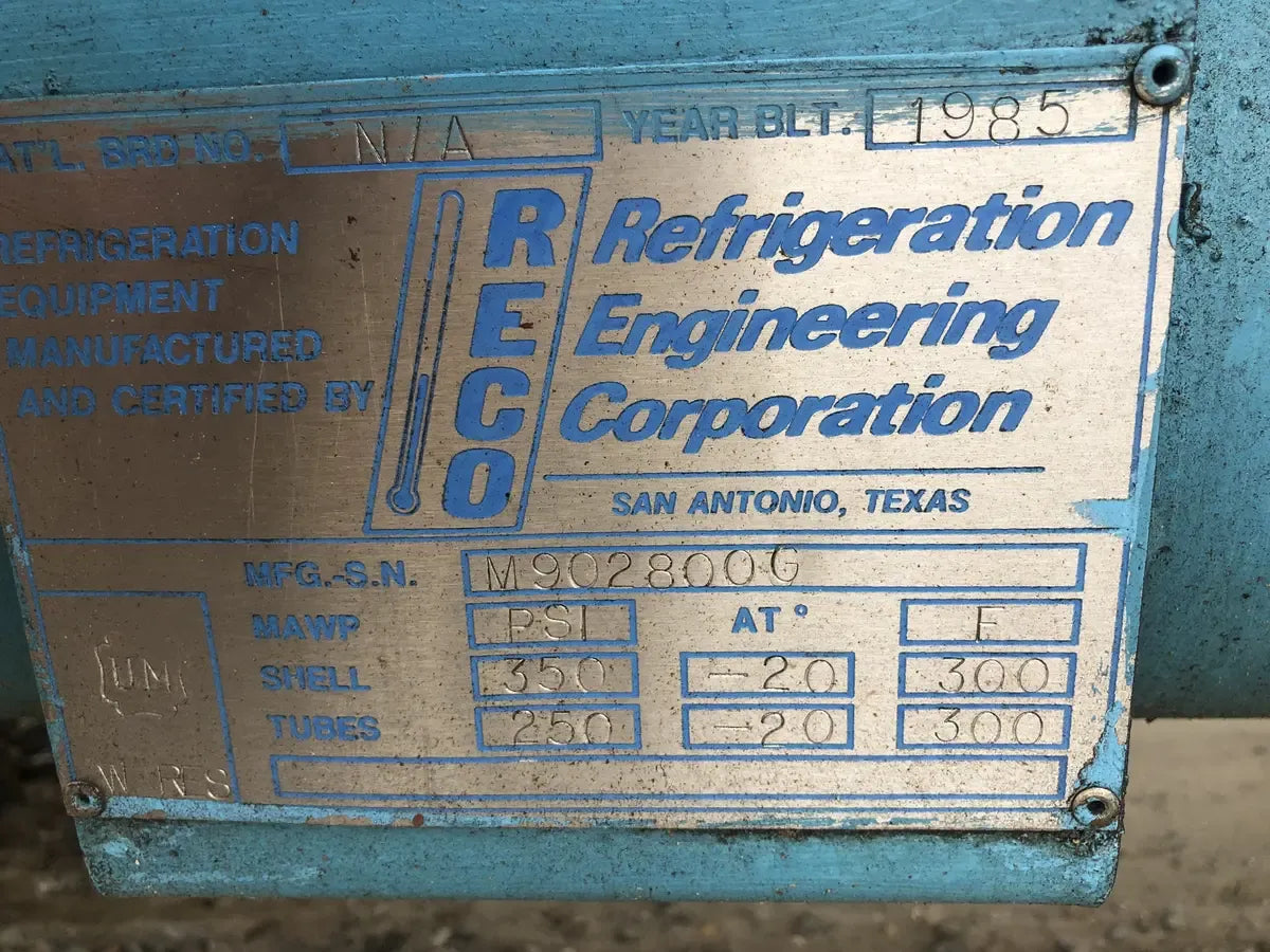 Frick Rotary Screw Compressor - Maximum Speed RPM: 3600, Ratio: 22-50, Max Design Psig: 362, Model No: GDSH283L Serial No:0003V. Westinghouse Motor - Phase: 3, Cycles: 60, Kva Code: C, Serial No: 8511, HP: 250, Rpm: 3530, Time Hrs: 24, Ins CL: B , Ser Fac: 1.15, Nema Des: B, Frame: 445TS Max. AMB: 40 C, Model: NBDP, Volts: 460, Amps: 288. Refrigeration Engineering Corporation Oil Separator - MFG-SN: M663 250A, Year Built: 1986, MAWP: 150 -20 @ 300. Refrigeration Engineering Corporation Oil Cooler - Mfg Sn: M902800G, MAWP: Shell 350 psi @-20 @ 300F, Tubes: 250 PSI @ -20 @ 300 F Mfg Date: 1985. Industrial Control Panel Enclosure - No.BL- 614680. Frick Volts: Control 115Vac. AMPS: Control 5, Phase: 1, Hertz: 50/60, I.D. Code: Quantum.