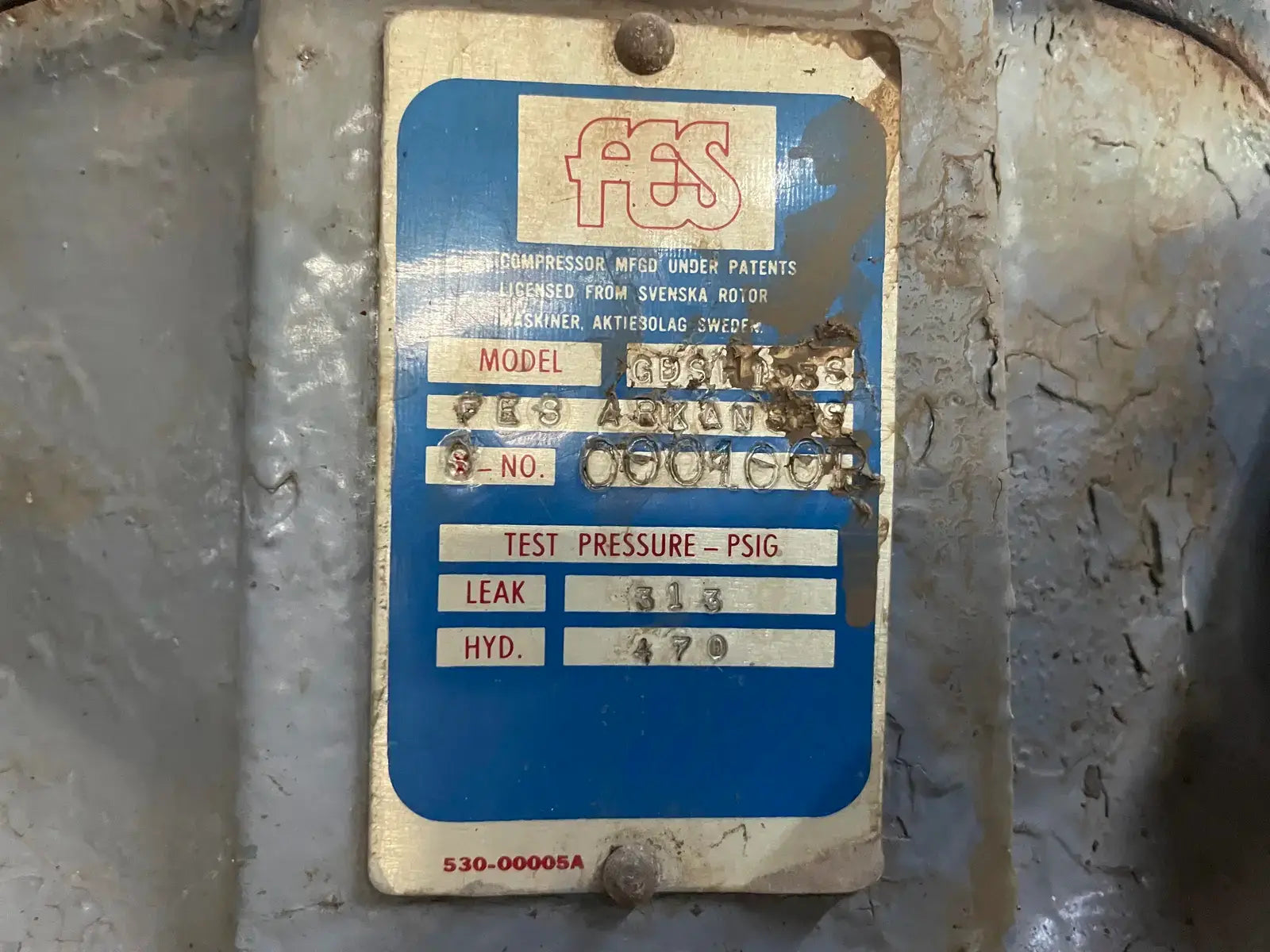 FES Rotary Screw Compressor Package. Model: GDSH193S. Serial No:000100P. Test Pressure(PSIG): LEAK: 315, HYD: 470.