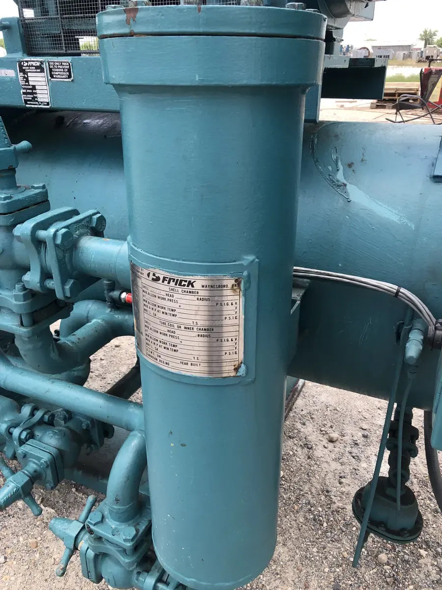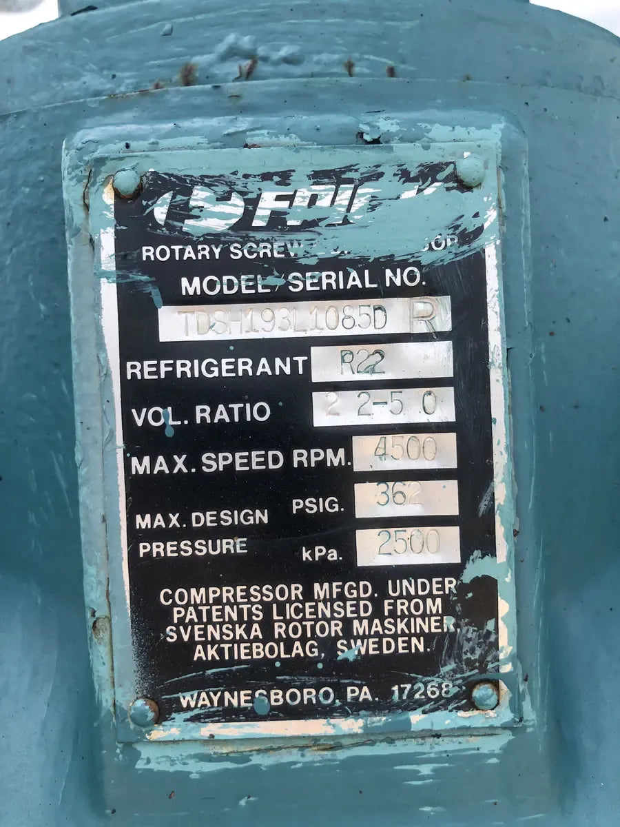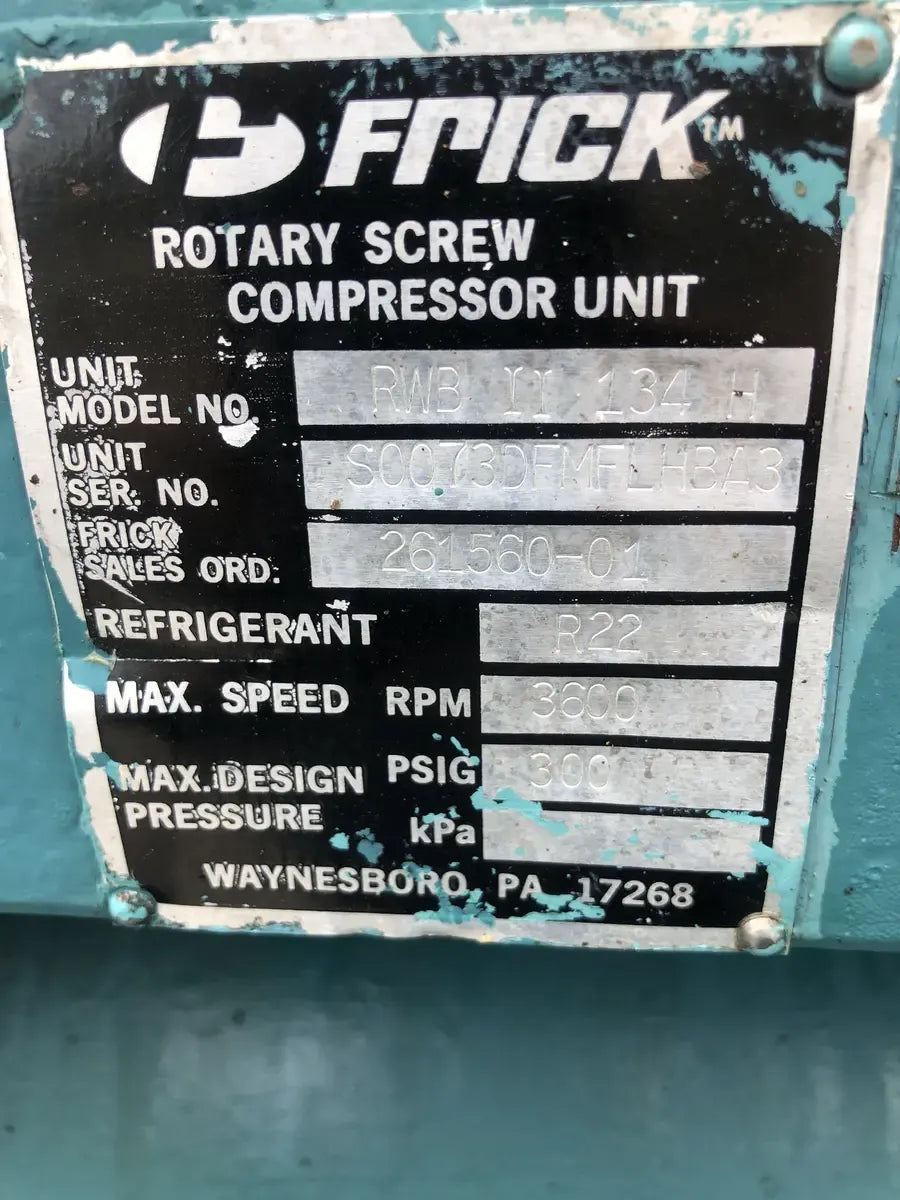 Frick Rotary Screw Compressor Unit: Model: RWB II 134 H, Unit Serial No: S0073DFMFLHBA3, Frick Sales Ord: 261560-01, Refrigerant: R22, Max Speed RPM: 3600, Max Design Pressure: Psig: 300. Toshiba Motor: Model No: B3002VLG3BD, Volts: 460, AMP: 330, Type: TIKK, Frame: 447TSS, Form: VCK1, Service Factor: 1.15, RPM: 3540, Max AMB: 40C, Serial No: 5900114. Frick Oil Separator: Natl Brd: 63693, Shell Chamber: Shell: 375, Head: 375, Radius: 2/1, Max Allow Work Press: 300 Psig @ -20 to 200. Year Built: 1985. Frick Package: Model/Serial: TDSH193L1085D, Refrigeran: R22, Vol Ratio: 2 2-5 0, Max Speed RPM: 4500, Max Design Pressure: Psig: 362, KPA: 2500. Frick Quantum Hd Retrofit Panel: Production Order: 5011117837, Material No: US2430106243200020, Description: Quantum HD Retrofit Panel, Serial: 10241L65613505, Volts: 115AC, Cntl: 6, Short Circuit Current: 5 kA rms, Symmetrical: 120 V Maximum, Panel Grounding Tested: 3074.