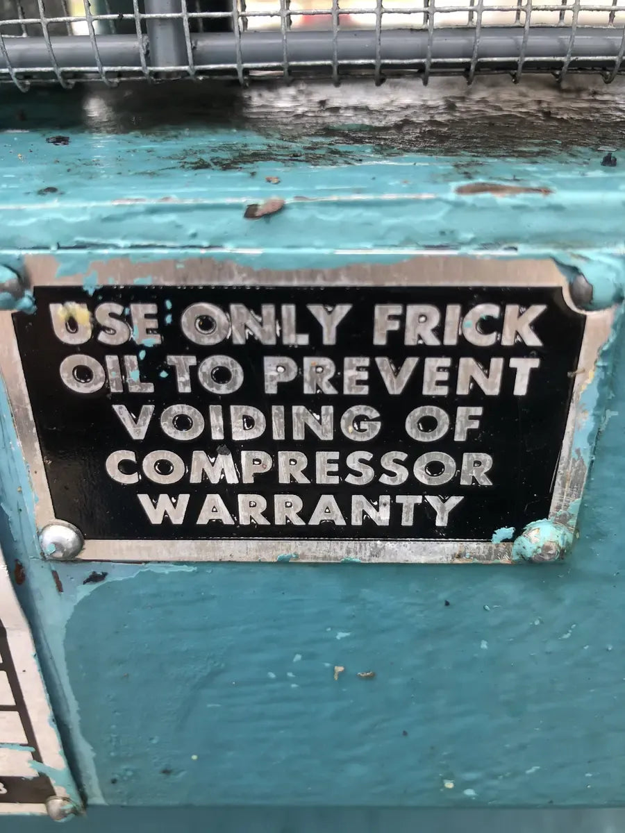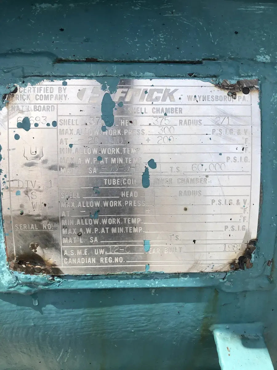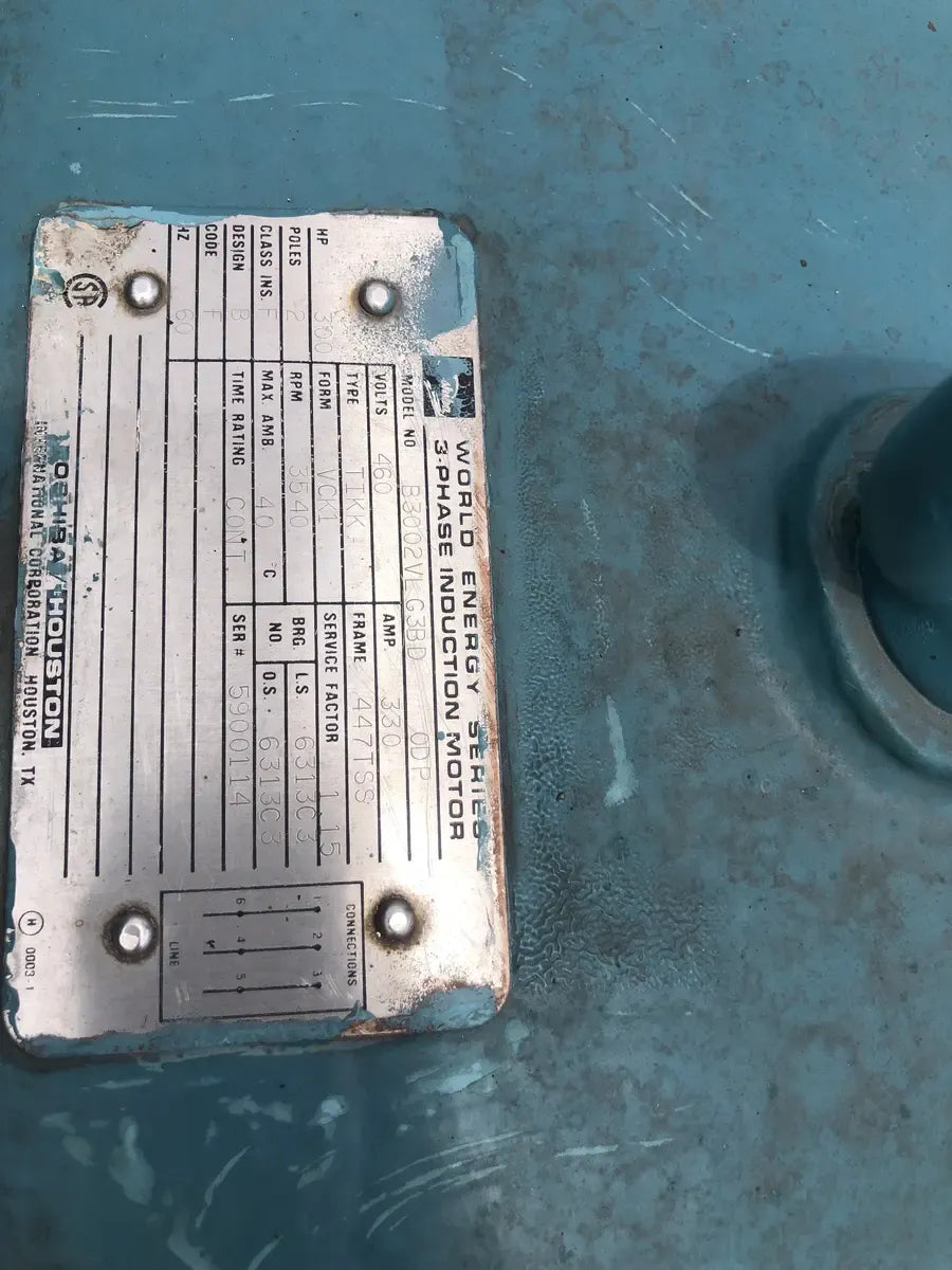 Frick Rotary Screw Compressor Unit: Model: RWB II 134 H, Unit Serial No: S0073DFMFLHBA3, Frick Sales Ord: 261560-01, Refrigerant: R22, Max Speed RPM: 3600, Max Design Pressure: Psig: 300. Toshiba Motor: Model No: B3002VLG3BD, Volts: 460, AMP: 330, Type: TIKK, Frame: 447TSS, Form: VCK1, Service Factor: 1.15, RPM: 3540, Max AMB: 40C, Serial No: 5900114. Frick Oil Separator: Natl Brd: 63693, Shell Chamber: Shell: 375, Head: 375, Radius: 2/1, Max Allow Work Press: 300 Psig @ -20 to 200. Year Built: 1985. Frick Package: Model/Serial: TDSH193L1085D, Refrigeran: R22, Vol Ratio: 2 2-5 0, Max Speed RPM: 4500, Max Design Pressure: Psig: 362, KPA: 2500. Frick Quantum Hd Retrofit Panel: Production Order: 5011117837, Material No: US2430106243200020, Description: Quantum HD Retrofit Panel, Serial: 10241L65613505, Volts: 115AC, Cntl: 6, Short Circuit Current: 5 kA rms, Symmetrical: 120 V Maximum, Panel Grounding Tested: 3074.