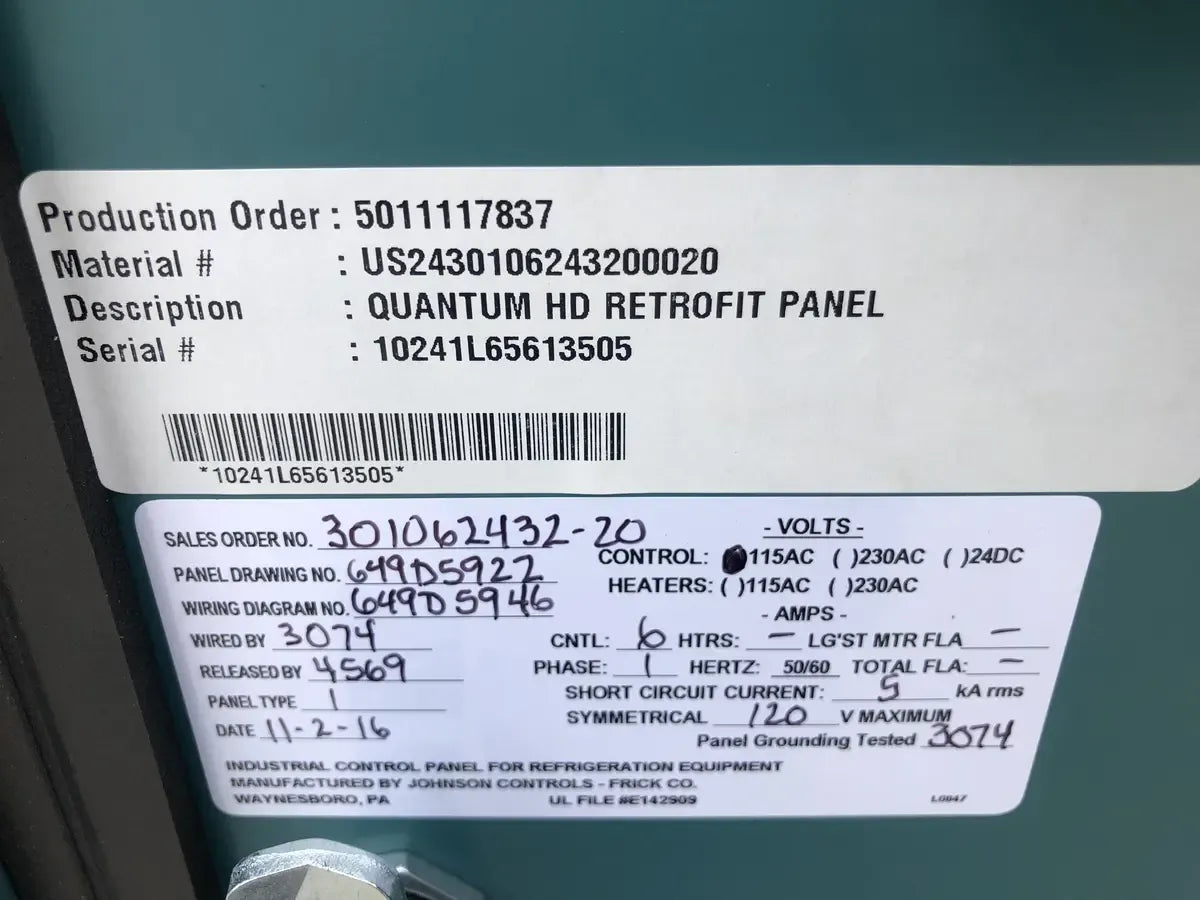 - Micro Control Panel Description: Frick Quantum Hd Refrofit Panel: Production Order: 5011117837, Material #: US2430106243200020, Description: Quantum Hd Retro Fit Panel, Serial: 10241L65613505, Volts: 115AC, Cntl: 6, Short Circuit Current: 5 kA rms, Symmetrical: 120 V Maximum, Panel Grounding Tested: 3074.
