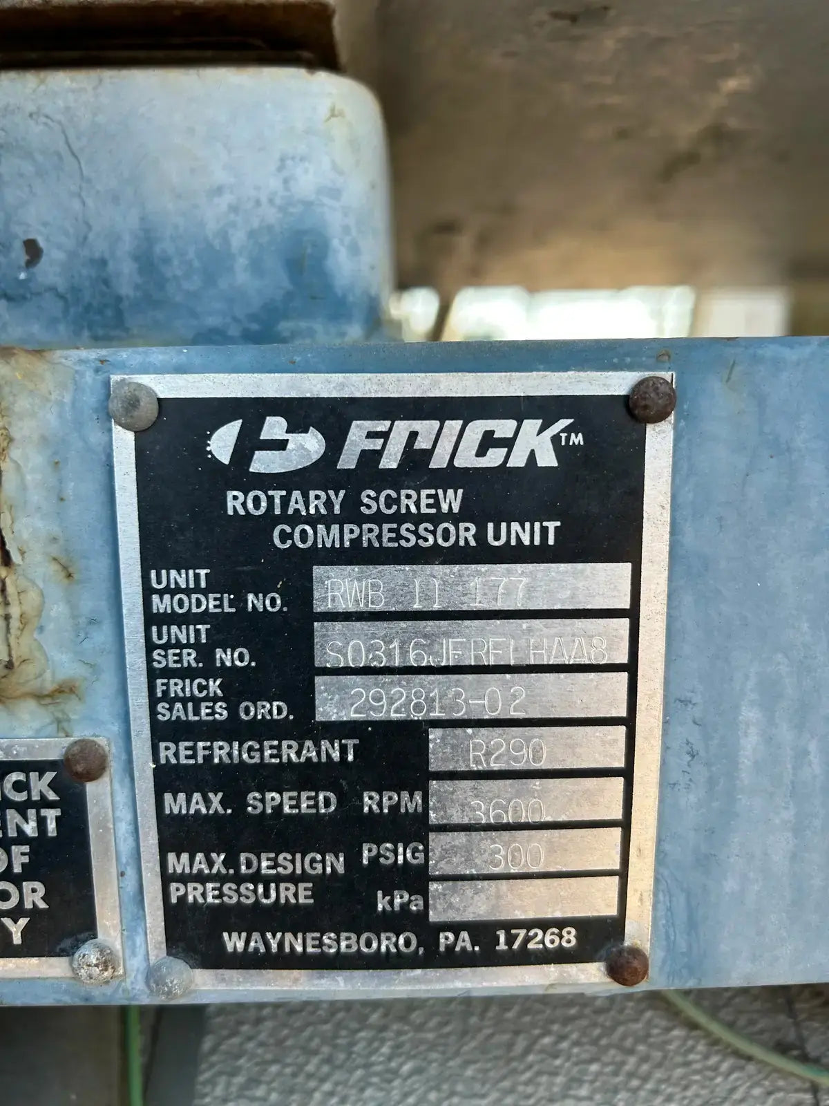 Frick RWB Series Frick Compressor Package. Model: RWB-II-177. Serial No: S0316JFRFLHAA8. Frick Sales: 292813-02. Refrigerant: R-290. Max Speed: 3600 RPM. Max Design Pressure: 300. Frick Bare Screw Compressor: Model: TDSH233S, Serial No: 10241M32095695, Max Allowable Pressure(PSIG): 400. Max Design Speed(RPM): 4500. Certified by Frick Oil Separator - National Board: 94907, MAWP: 300 PSI @ 200 F. MDMT: -20 F @ 10.7 PSI.