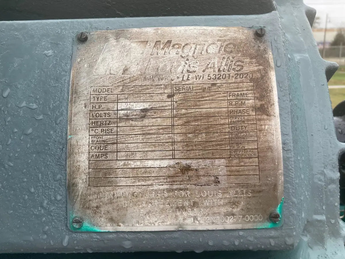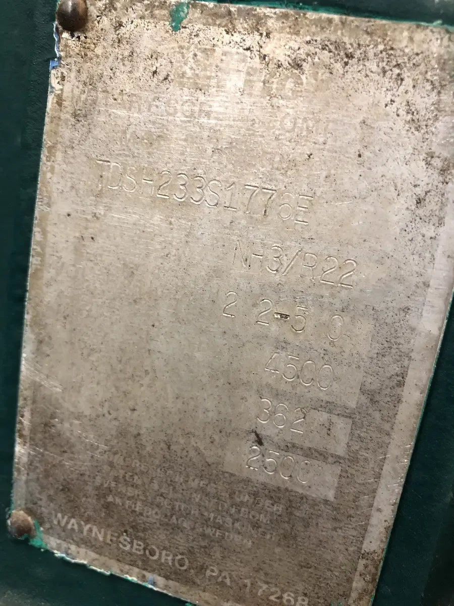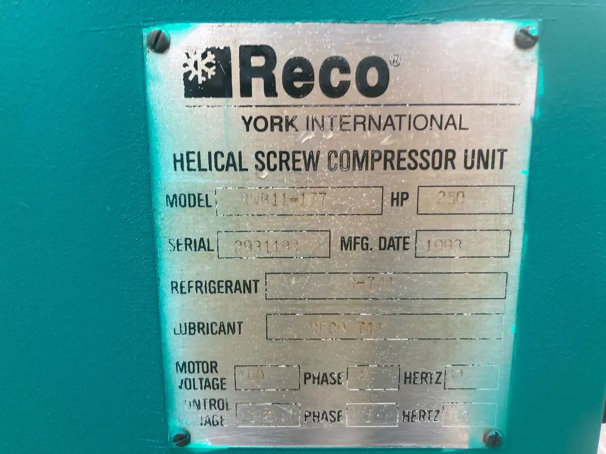 Frick RWB-II-177, 250HP Rotary Screw Compressor including Micro and Starter Screw: Model/Serial# TDSH233S1776E, Refrigerant: R717/R22, Volume Ration: 2 2-5 0, Max RPM 4500, Design Pressure PSIG 362. Package: RWB-II-177, Serial# 293119R Motor: Baldor Eletric Co Electric Motors for Hazardous Locations Motor, 250 HP, 1760/1460 RPM, 143TC Frame, 230/460/190/380 Volts, 60/50Hz, NEMA Nom Off 85.5, Number: CB325003, Serial#: F1203134773, Spec: 35E377M492G1, Cat No: CEN7014T. Previous Refrigerant: R-744 Package Year 1993