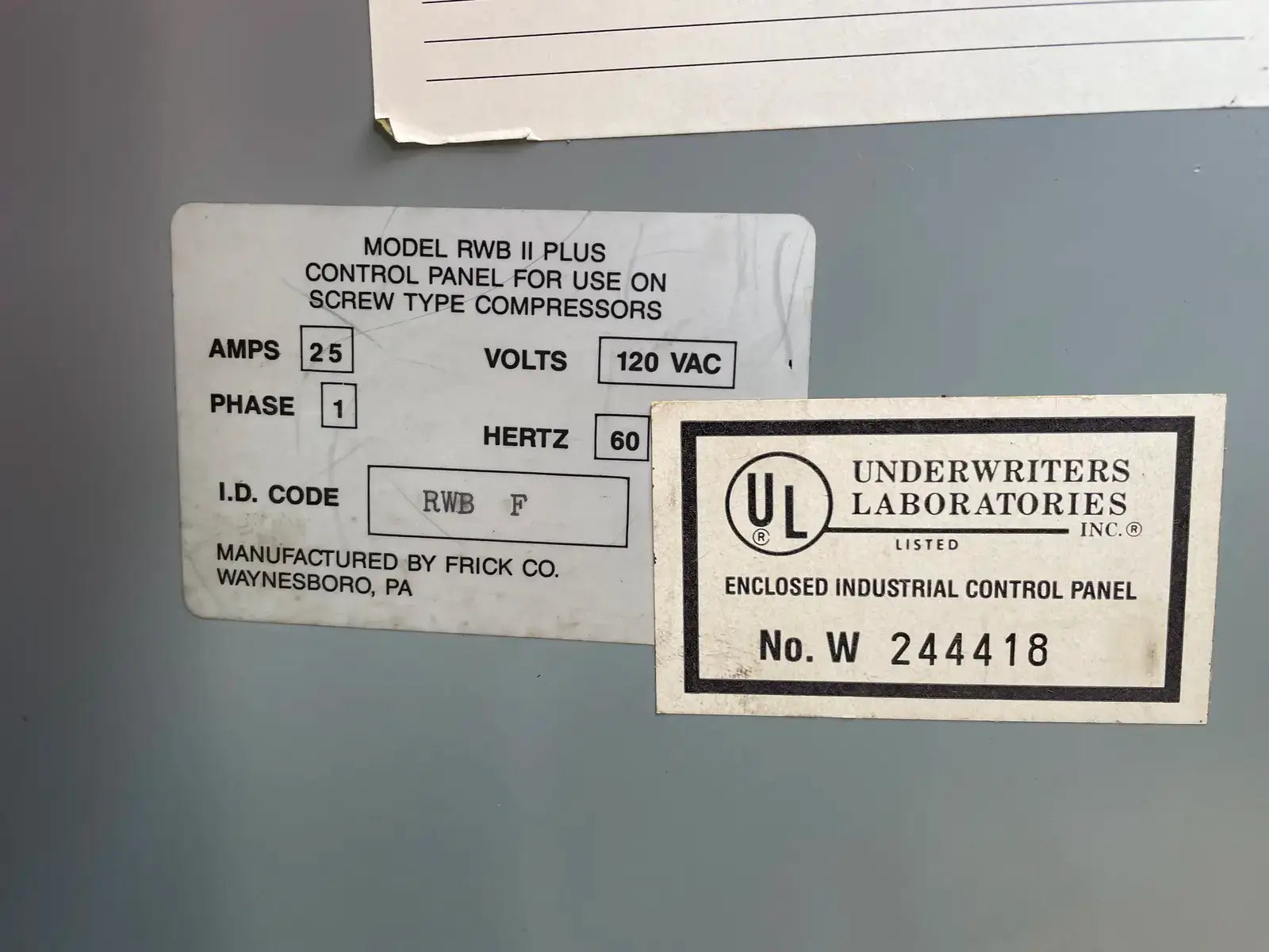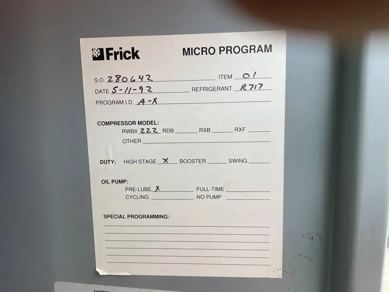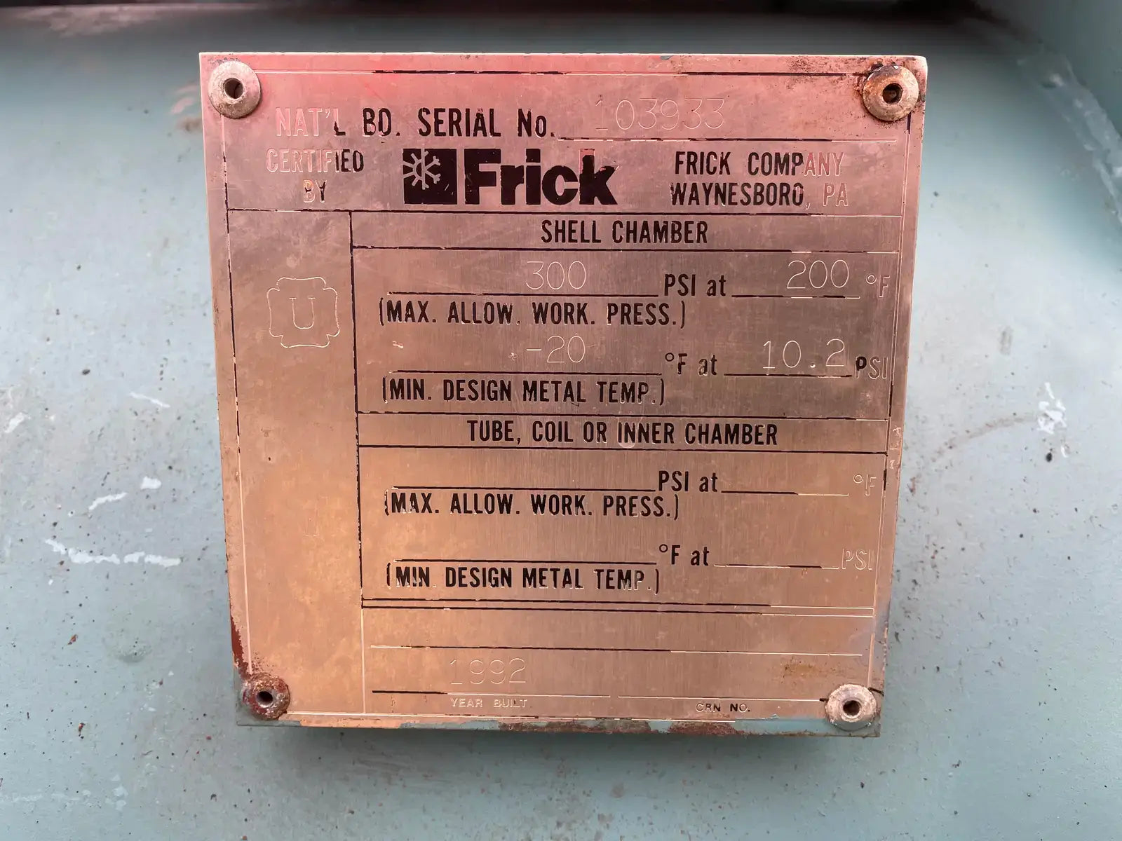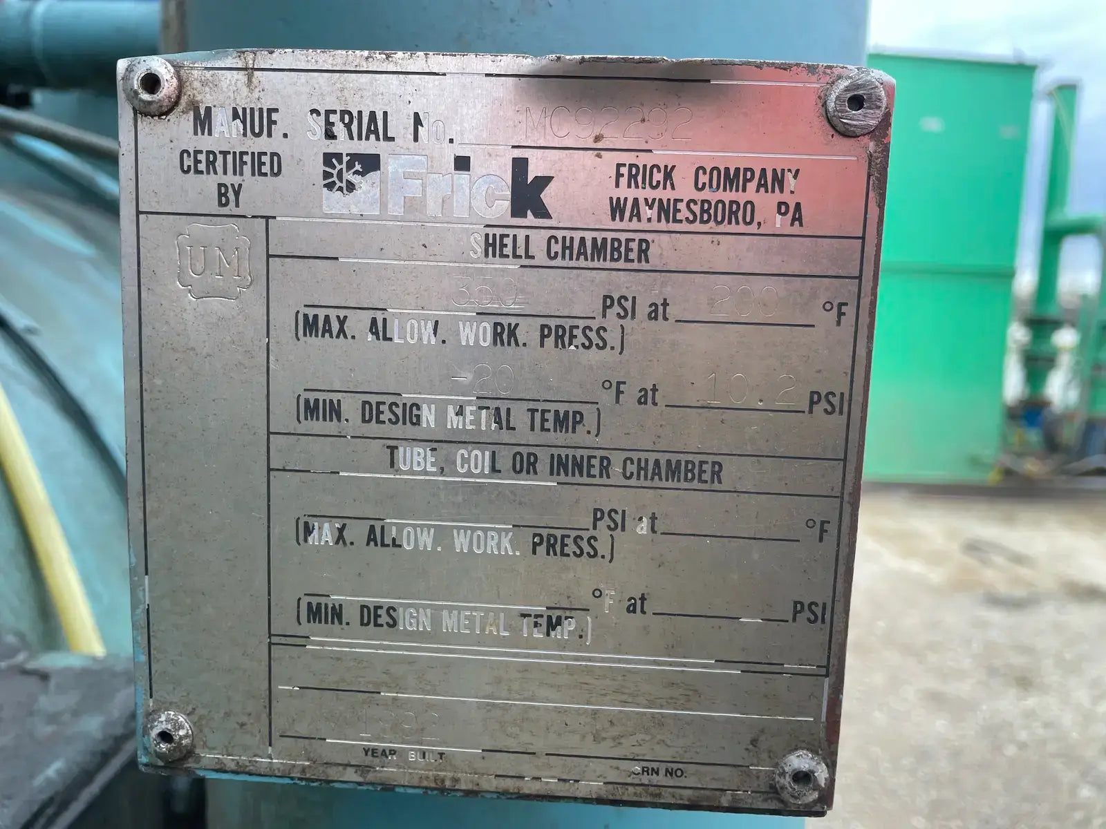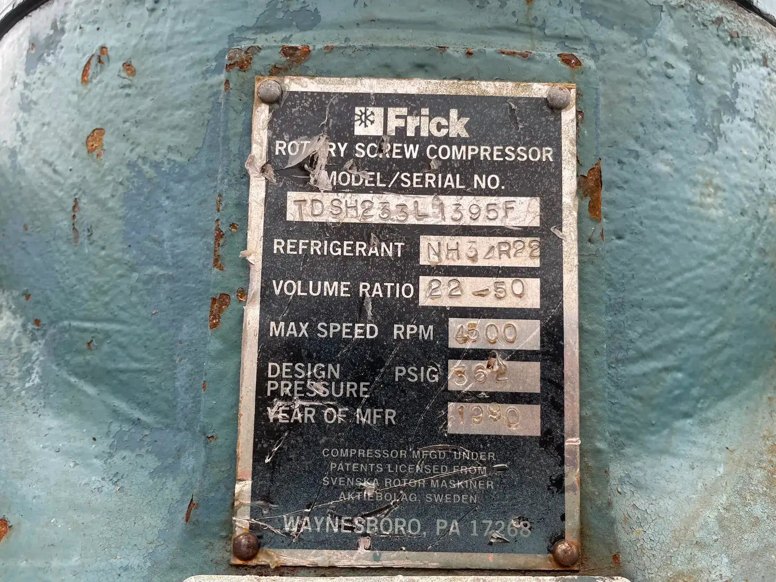 Frick Rotary Screw Compressor Package: Unit Model No: RWB II 222, Unit Serial No: S0296LFMPTHAA3, Frick Sales Order: 280642-01, Refrigerant: R717, Max Speed Rpm: 3600. Frick Rotary Bare Screw Compressor: Model: TDSH233L, Serial No: 1395F, Refrigerant: NH3/R22, Max Speed Rpm: 4500, Design Pressure: 363 PSIG, Year of Mfr: 1990. Certified Frick Oil Separator: National Board: 103933. Shell Chamber: MAWP: 300 PSI @ 200 F. MDMT: -20 F @ 10.2 PSI. Year Built: 1992. Toshiba Premium Efficiency 3-Phase Induction Motor: HP: 500, Type: TKKH, Volts: 460, RPM: 3570, Hz: 60, Amp: 528, Frame: 507USS. Frick RWB II Plus Control Panel.