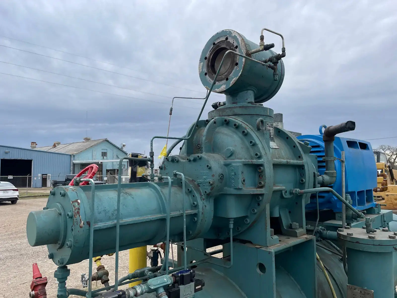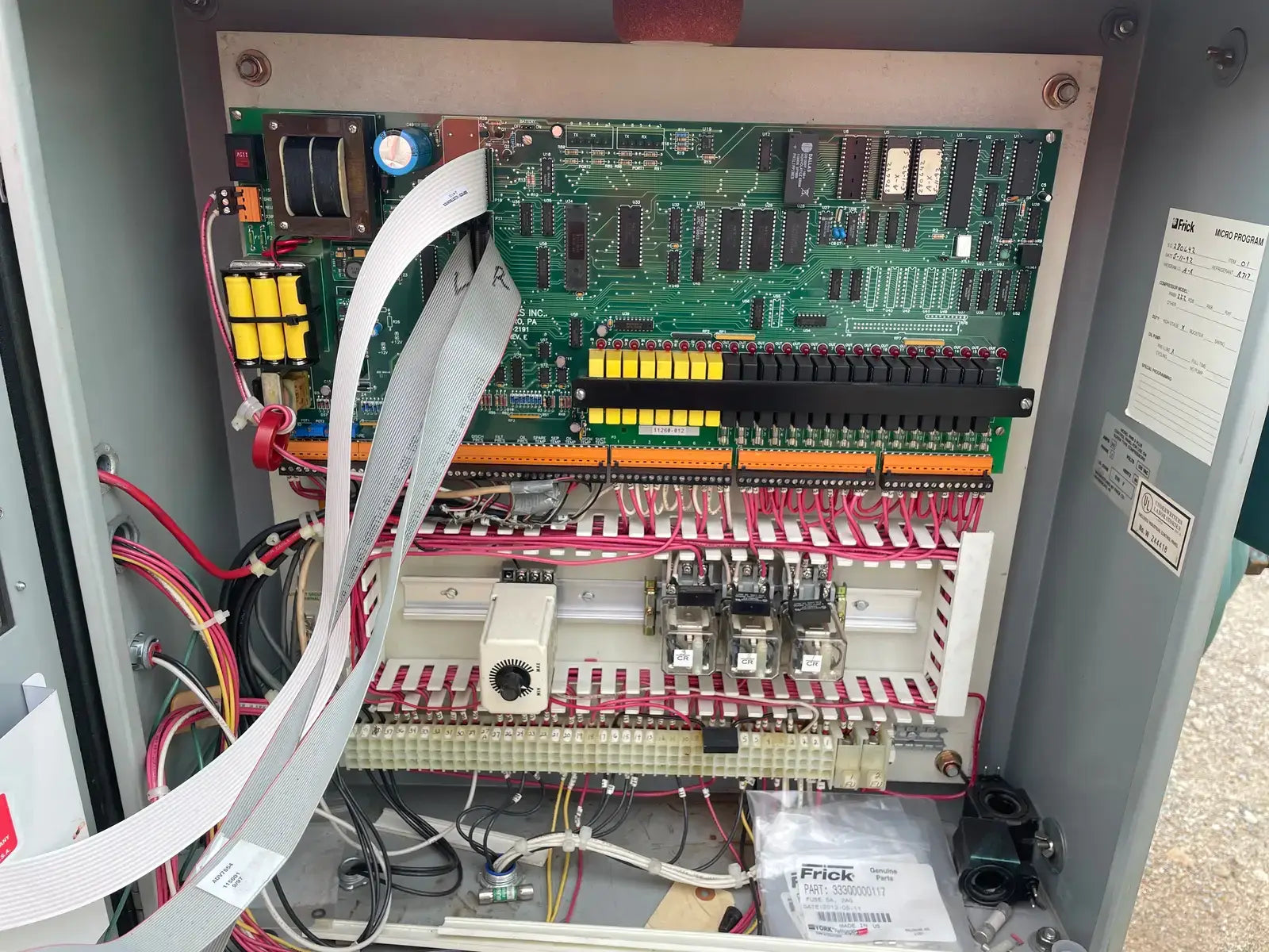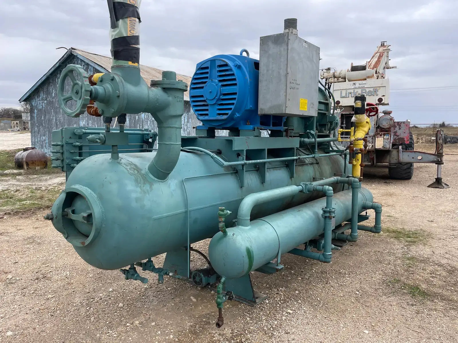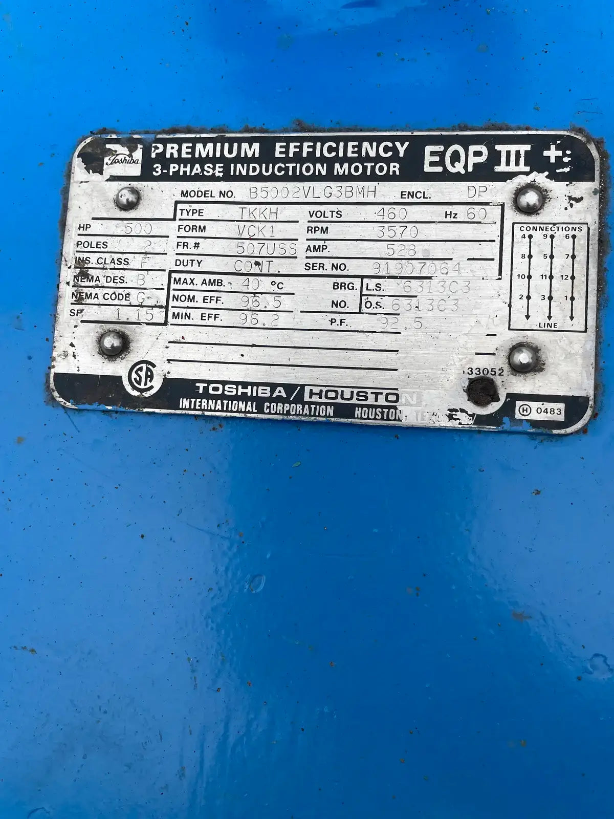 Frick Rotary Screw Compressor Package: Unit Model No: RWB II 222, Unit Serial No: S0296LFMPTHAA3, Frick Sales Order: 280642-01, Refrigerant: R717, Max Speed Rpm: 3600. Frick Rotary Bare Screw Compressor: Model: TDSH233L, Serial No: 1395F, Refrigerant: NH3/R22, Max Speed Rpm: 4500, Design Pressure: 363 PSIG, Year of Mfr: 1990. Certified Frick Oil Separator: National Board: 103933. Shell Chamber: MAWP: 300 PSI @ 200 F. MDMT: -20 F @ 10.2 PSI. Year Built: 1992. Toshiba Premium Efficiency 3-Phase Induction Motor: HP: 500, Type: TKKH, Volts: 460, RPM: 3570, Hz: 60, Amp: 528, Frame: 507USS. Frick RWB II Plus Control Panel.