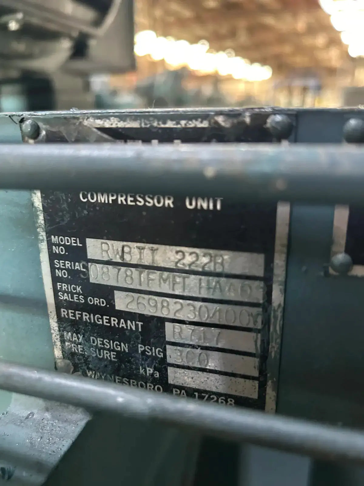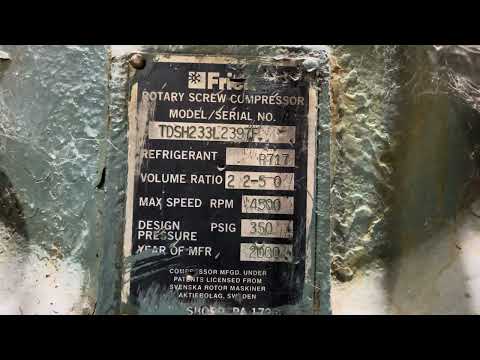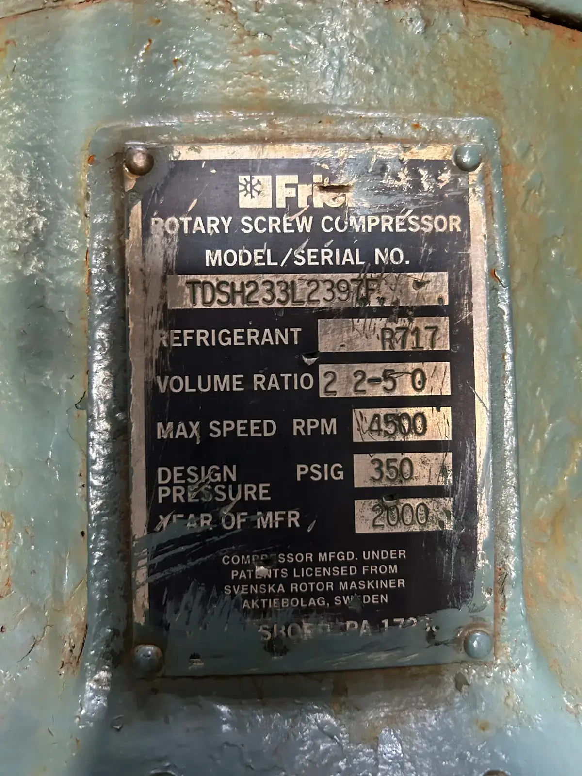 Frick Rotary Screw Compressor Package. Model: RWB-II-222B. Serial No: S0878TFMFTHAA03. Frick Sales Order: 26982304000. Refrigerant: R-717. Max Design Pressure: 300 PSIG. Frick Bare Screw Compressor: Model: TDSH233L. Serial No: 2397F. Refrigerant: R-717. Volume Ratio: 2.2-5.0. Max Speed RPM: 4500. Design Pressure: 350 PSIG. Year of Mfr: 2000.