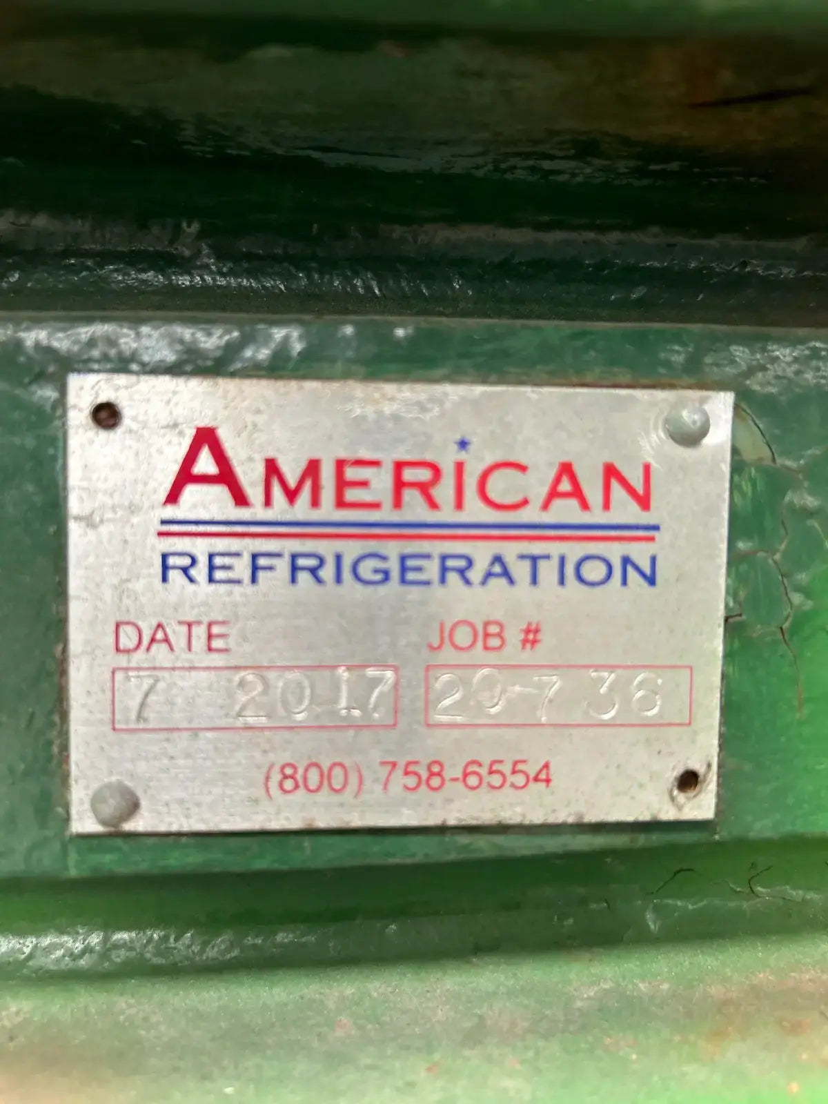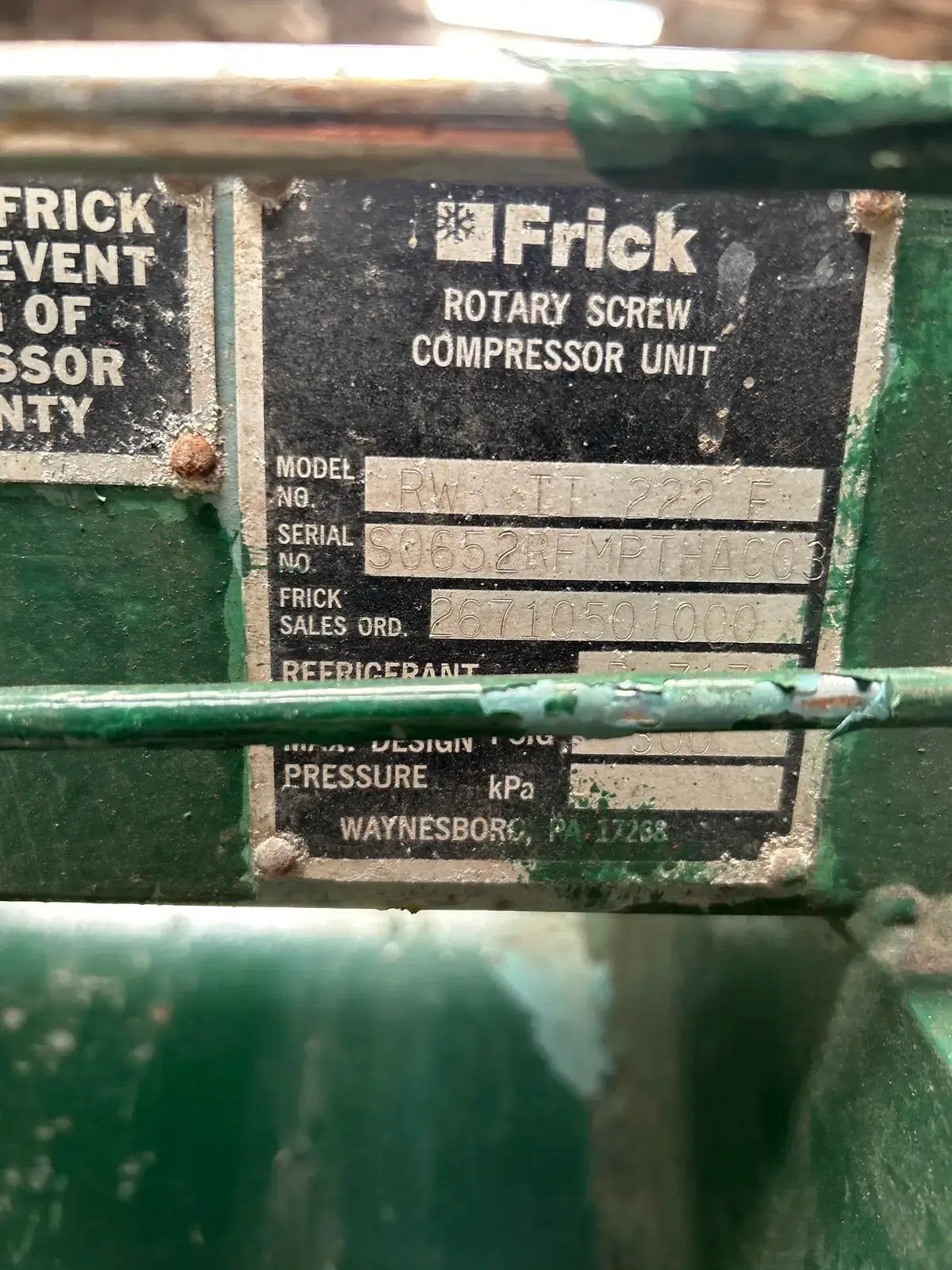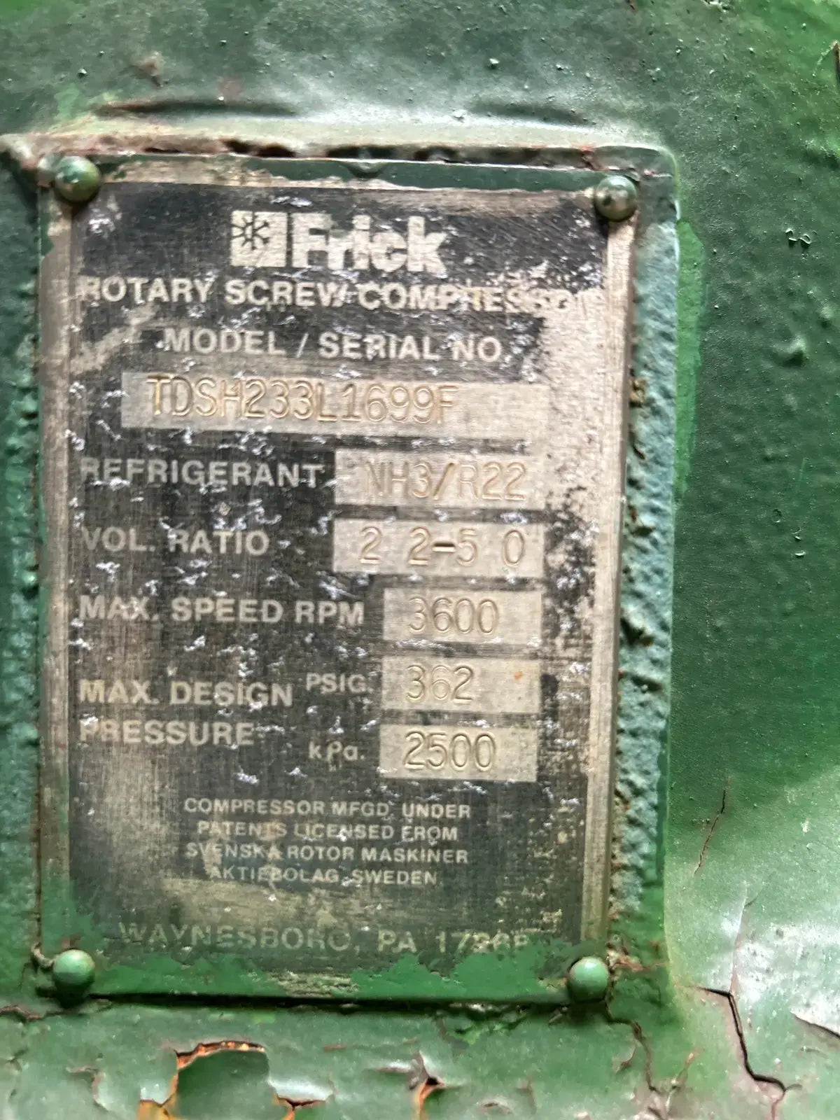 Frick RWB-II-222E Rotary Screw Compressor Package. Model No: RWB-II-222E. Serial No: S0652RFMPTHAC03. Refrigerant: R-717. Max Design Pressure: 300 PSIG. Frick Rotary Screw Compressor: TDSH233L. Serial No: 1699F. Refrigerant: NH3/R22. Volume Ratio: 2.2-5.0. Max Speed RPM: 3600. Max Design Pressure: 362. American Refrigeration Rebuilt: Date: 7/2017, Job No: 20736. Certified by Frick Oil Separator: National Board: 134950, MAWP: 300 PSI @ 200 F, MDMT: -20 F @ 300 PSI. Frick Quantum HD Retrofit Control Panel.