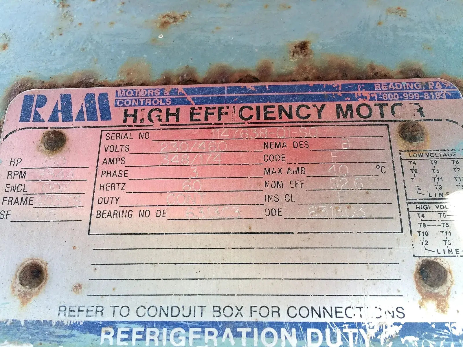 Frick Rotary Screw Compressor Package, model RWB II 60, serial S0184HFMCLHAA3, sales order 262841-01, refrigerant R717 ammonia, max speed 3600 RPM. Compressor model TDSH163S1235A, refrigerant NH3/R22, vol ratio 2.2-5.0, max speed 4500 RPM, max design pressure 362 PSIG. Nominal displacement: 600 cubic meters per hour (353 CFM). Nominal ratings: 126.5 TR at +20F / +95F; 25.9 TR at -40F / +95F. RWBII Plus micro controller. Ram Industries electric motor: 150 HP, 3544 RPM, 230/460V, 348/174 amps, 60 Hz, 3-phase, 405TS Frame. Compressor runtime hours: 9,190. Overall dimensions: 12 ft. L x 4.5 ft. W x 8 ft. High.