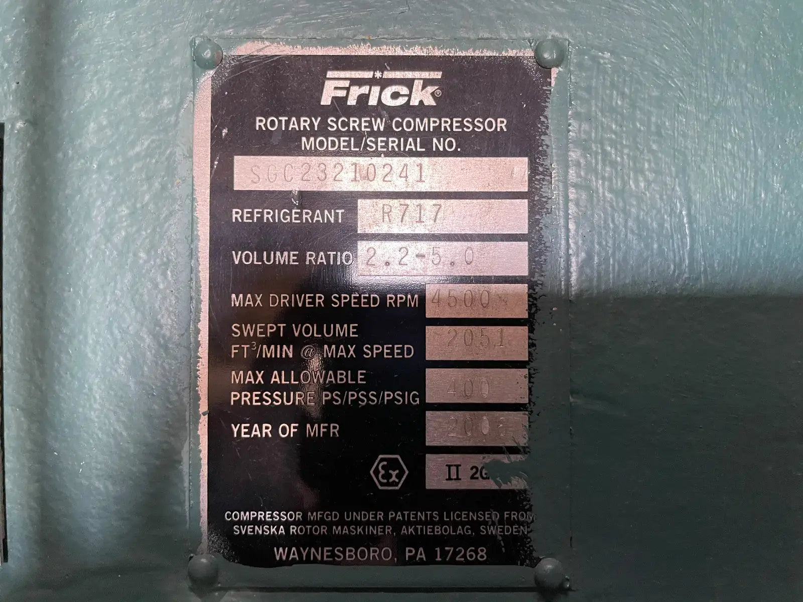 Frick Rotary Screw Compressor Package. Model No: RWF-II-270B. Serial No: F0168ZFMCTHGA03. Frick Sales Order: 28317504000. Max Design Pressure: 300 PSI. Frick Rotary Bare Screw Compressor: Model: SGC232, Serial No: 10241. Refrigerant: R717. Volume Ratio: 2.2-5.0. Max Speed RPM: 4500. Design Pressure: 400 PSIG. Year Of Mfr: 2006.