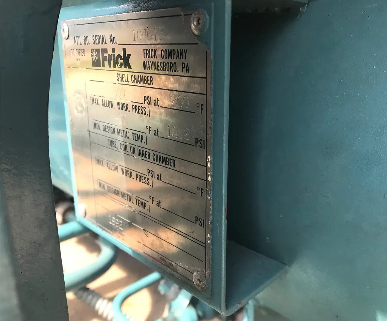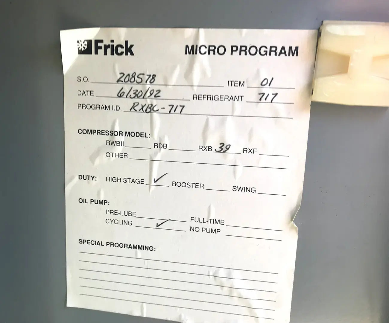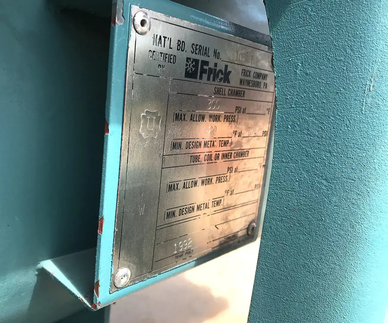 Frick Rotary Screw Compressor, model RXB-39, serial S0389LFMCTHAA3, sales order 208578-01, refrigerant R717 (ammonia), max speed 3600 RPM, max design pressure 300 PSIG. Year: 1992. Frick compressor model XJS120L0587F, refrigerant NH3/R22, volume ratio 2.2-5.0. Frick RXB Plus micro control panel. Toshiba 3-phase induction motor: 100 HP, 3555 RPM, 208-230/460V, 245-230/115 amps, 60 Hz, 3-phase, DP enclosure, 365TS Frame. Compressor runtime: 62,749.9 hours. Overall dimensions: 8 ft. L x 5 ft. W x 5 ft. H.