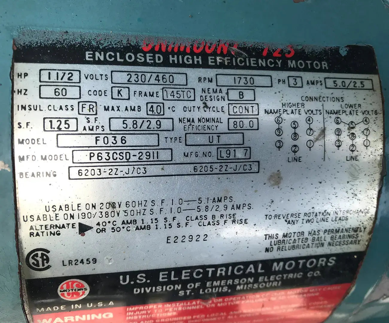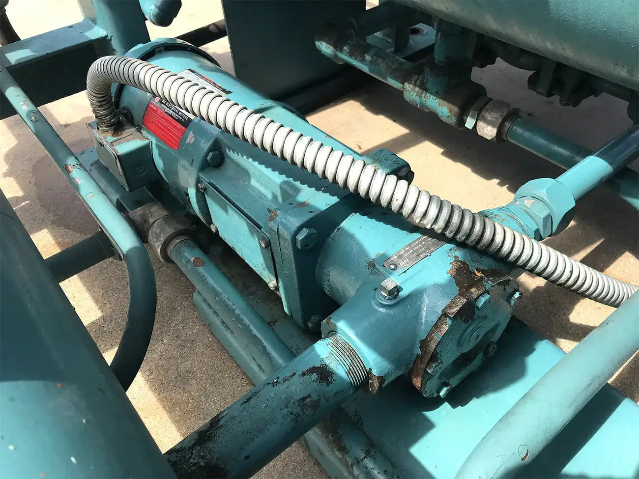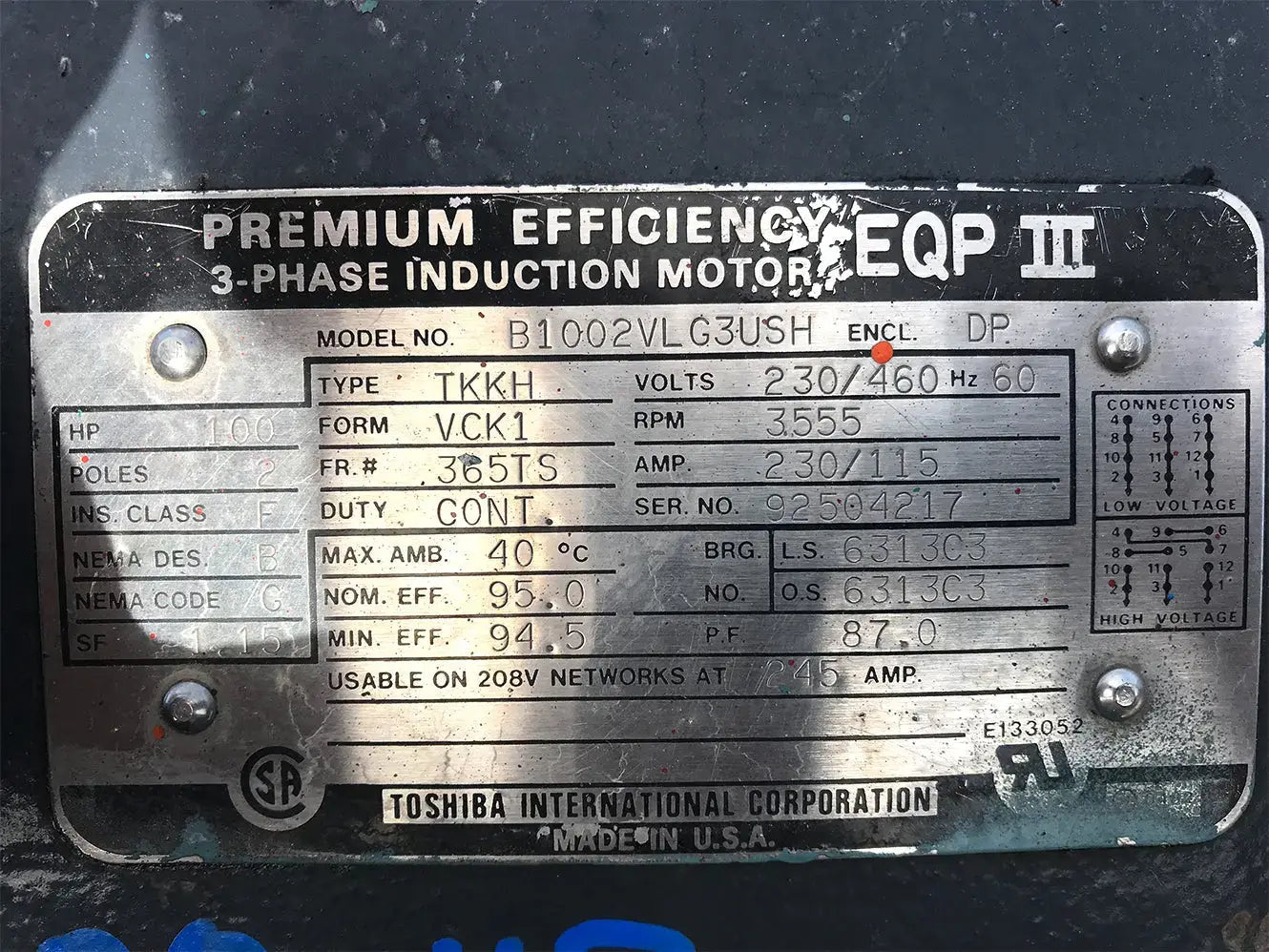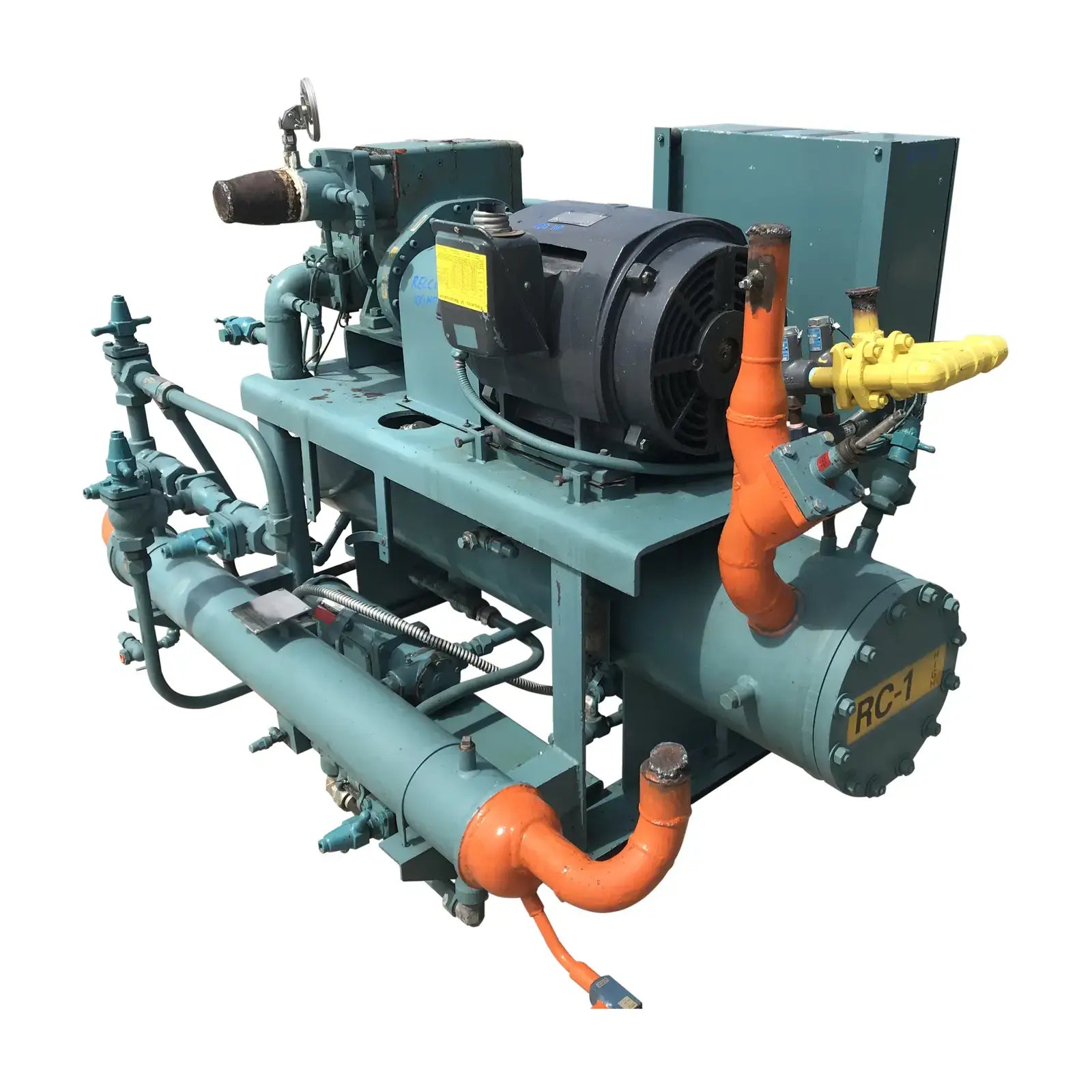 Frick Rotary Screw Compressor, model RXB-39, serial S0389LFMCTHAA3, sales order 208578-01, refrigerant R717 (ammonia), max speed 3600 RPM, max design pressure 300 PSIG. Year: 1992. Frick compressor model XJS120L0587F, refrigerant NH3/R22, volume ratio 2.2-5.0. Frick RXB Plus micro control panel. Toshiba 3-phase induction motor: 100 HP, 3555 RPM, 208-230/460V, 245-230/115 amps, 60 Hz, 3-phase, DP enclosure, 365TS Frame. Compressor runtime: 62,749.9 hours. Overall dimensions: 8 ft. L x 5 ft. W x 5 ft. H.