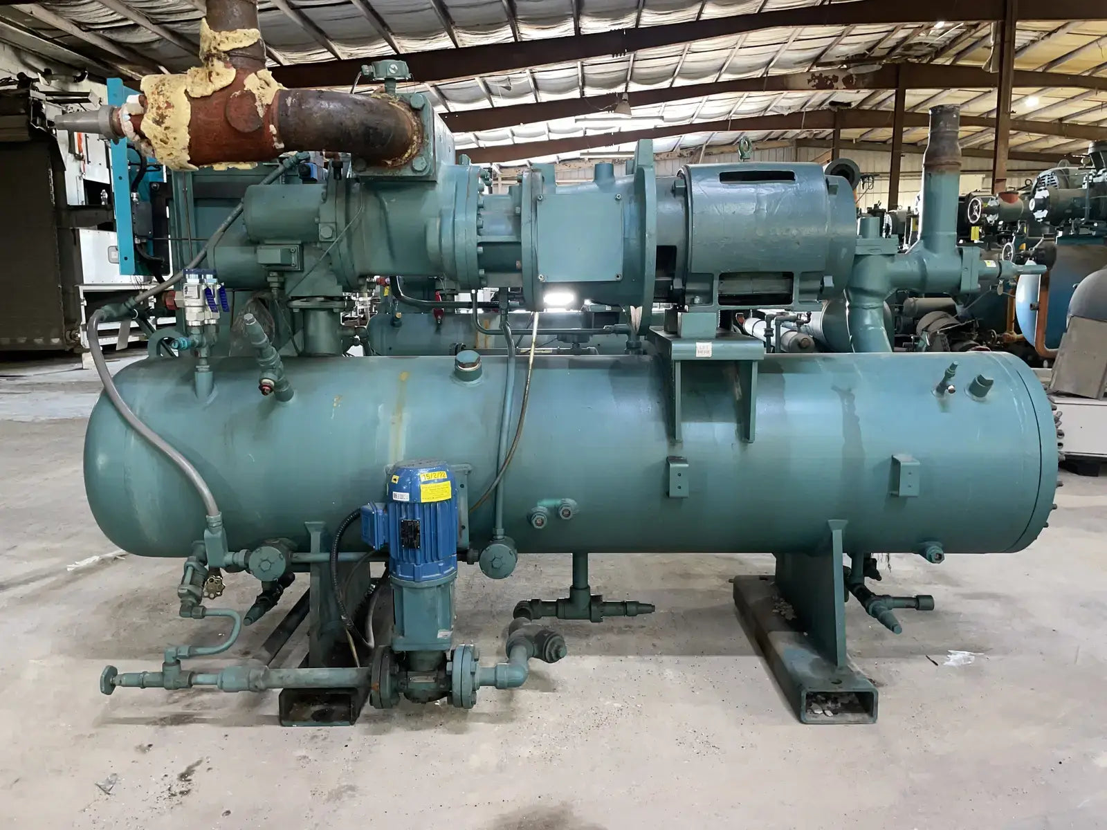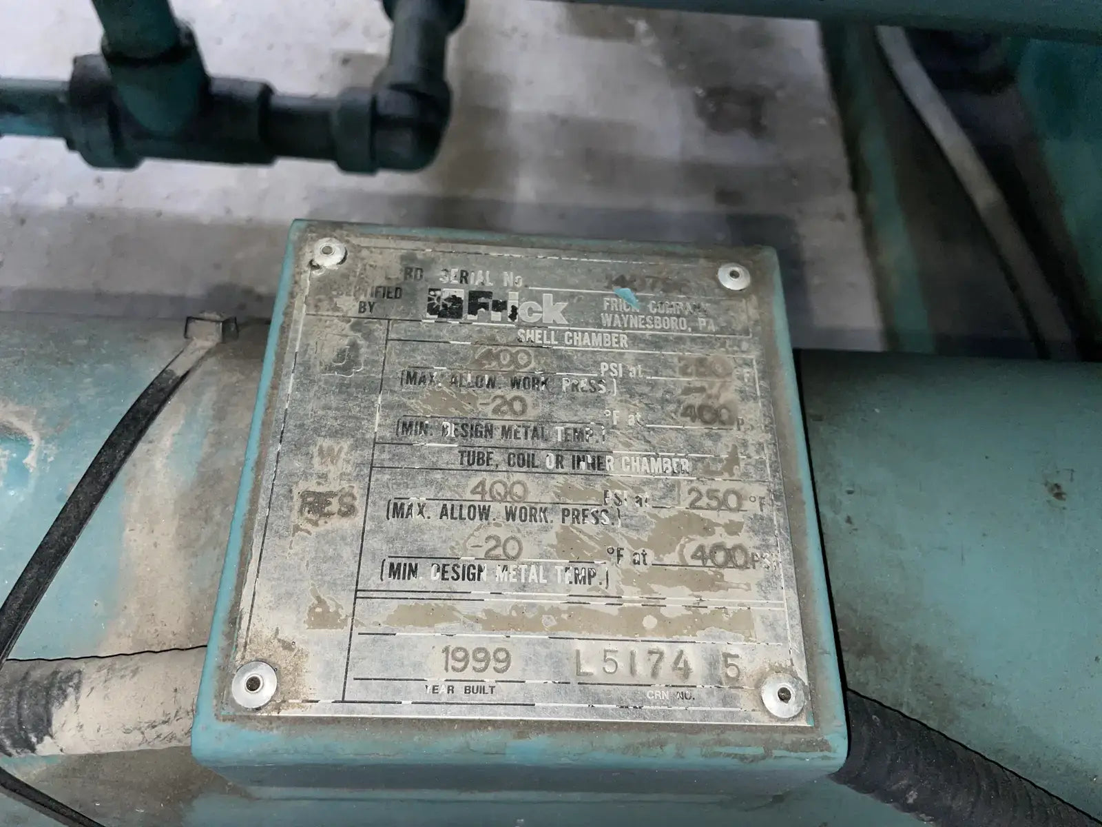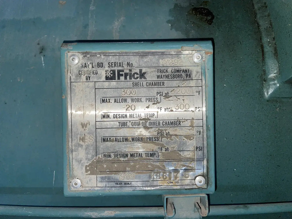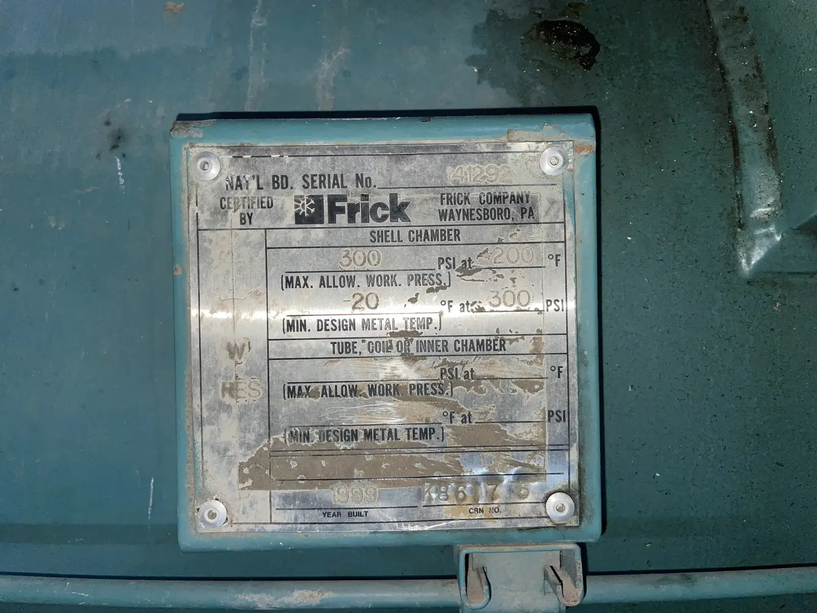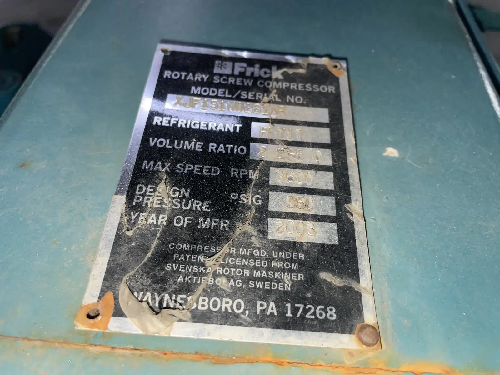 Frick RXF Series Rotary Screw Compressor Package. Model: XJF151N, Serial No: S0205TFMFTHAA03, Frick Sales Order: 36176904000, Refrigerant: R-717. Max Design Pressure: 300 PSI. Frick Bare Screw Compressor - Model: XJF151N, Serial No: 0261NR, Volume Ratio: 2.2-5.0, Max Speed: 3600 RPM, Design Pressure: 350 PSI, Year of MFR: 2003. Certified by Frick Oil Separator - National Board: 141292, MAWP: 300 PSI @ 200 F, MDMT: -20 F @ 300 PSI.