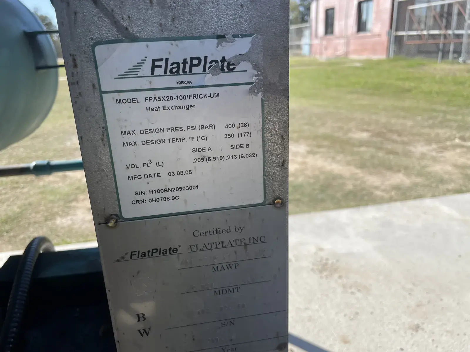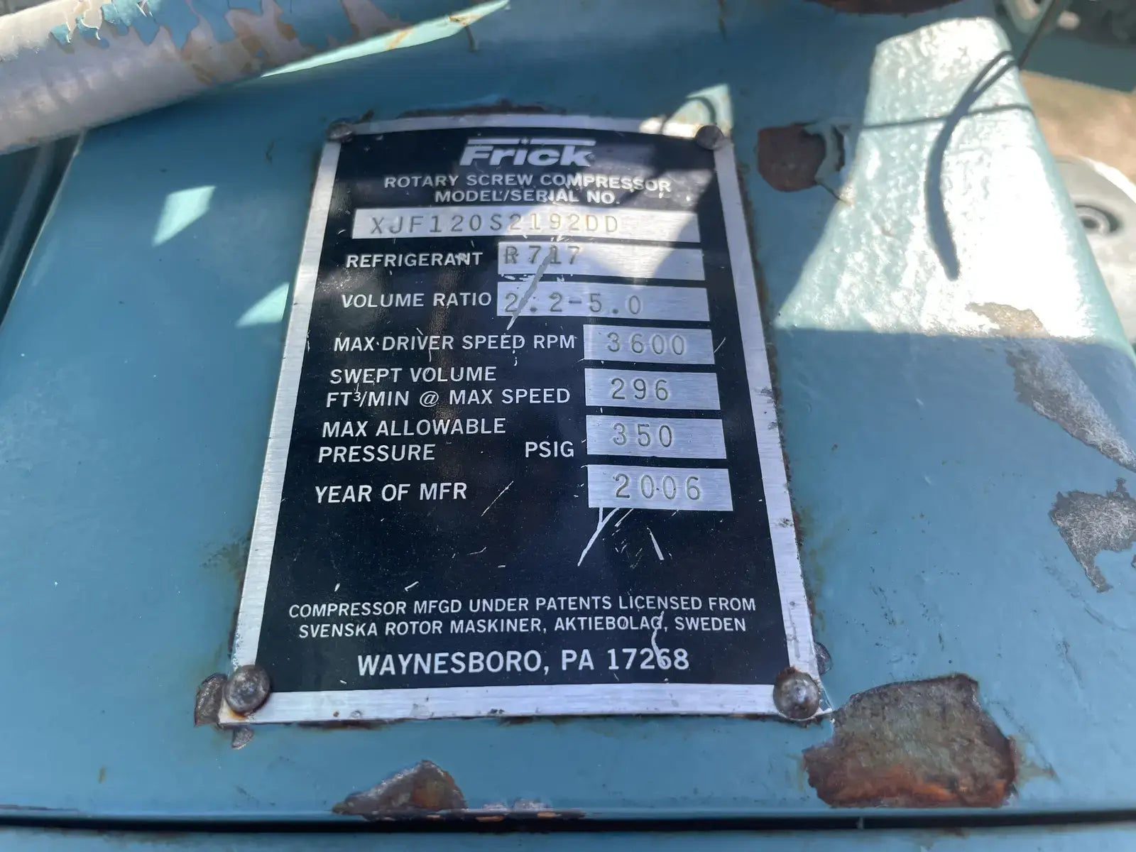 Frick RXF Series Rotary Screw Compressor Package. Model: RXF-50-H. Serial No: 0795TFMFTHAA03. Frick Sales Order No: 36176901000. Refrigerant: Ammonia. Max Design Pressure: 300 PSI. Frick Rotary Bare Screw Compressor - Model: XJF120S, Serial No: 219200. Refrigerant: R-717, Volume Ratio: 2.2-5.0, Max Drive Rpm: 3600, Max Allowable Pressure: 350 PSIG. Year of Mfr: 2006. Certified by Frick Oil Separator - National Board: 141242, MAWP: 300 PSI @ 250 F, MDMT: -20 F @ 300 PSI.