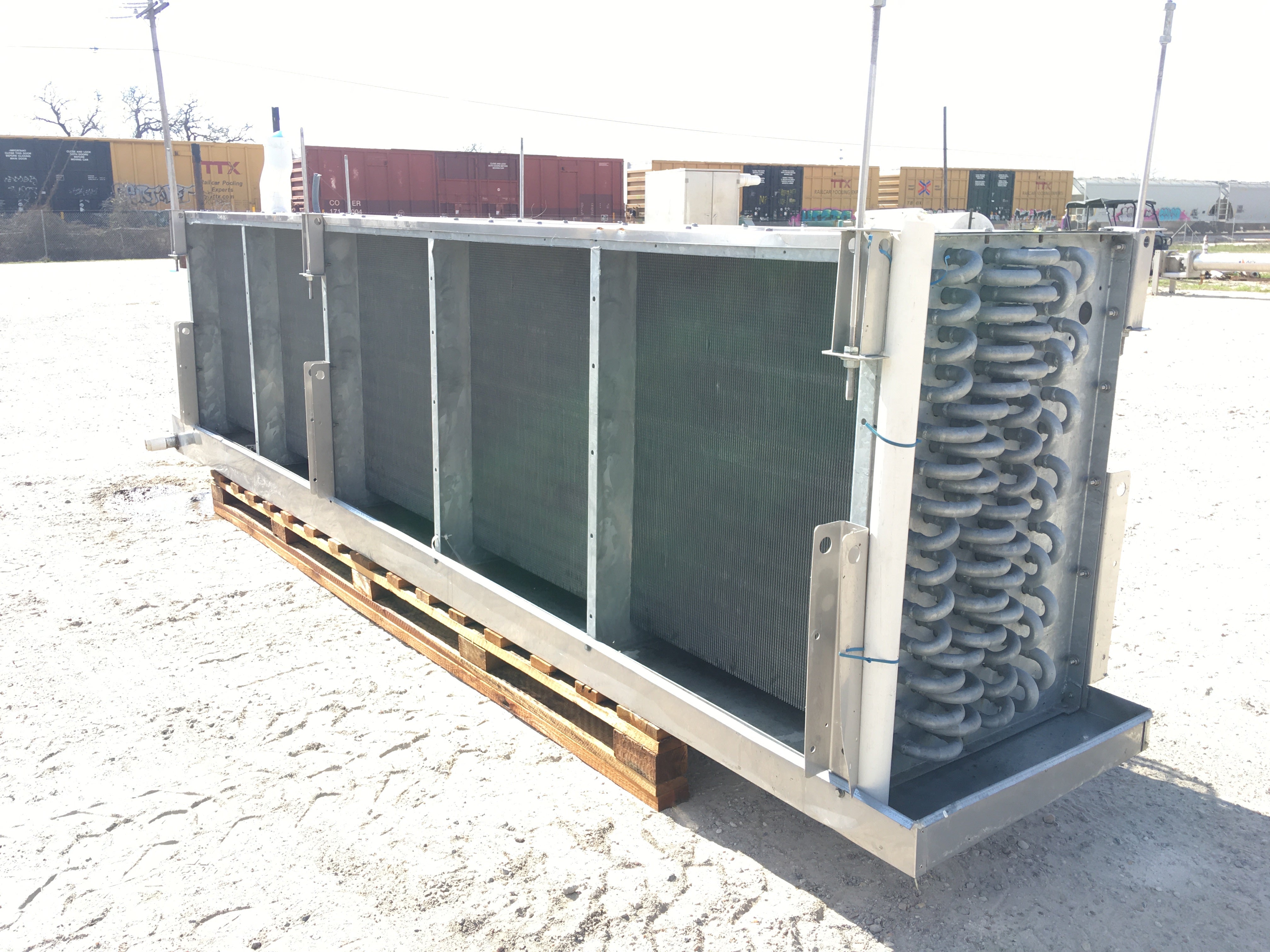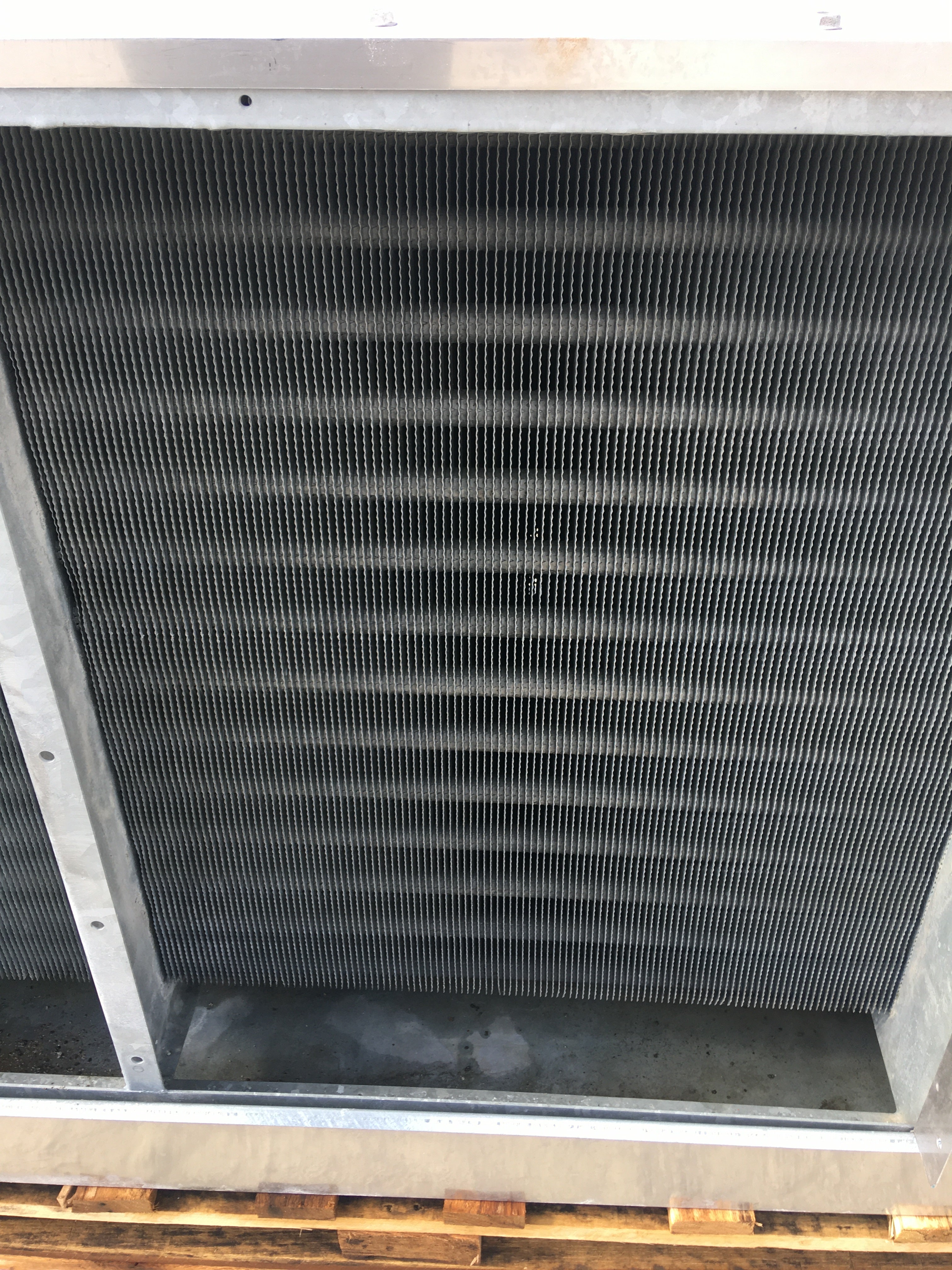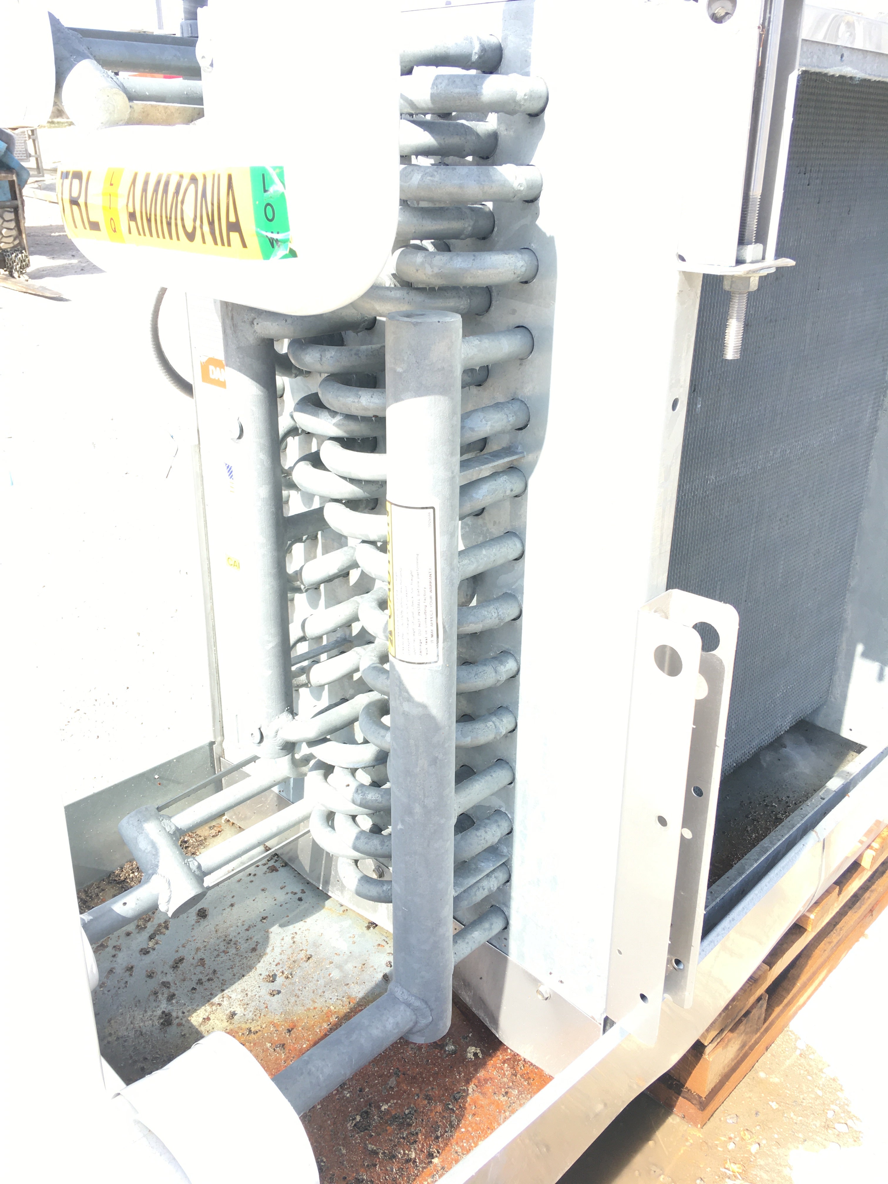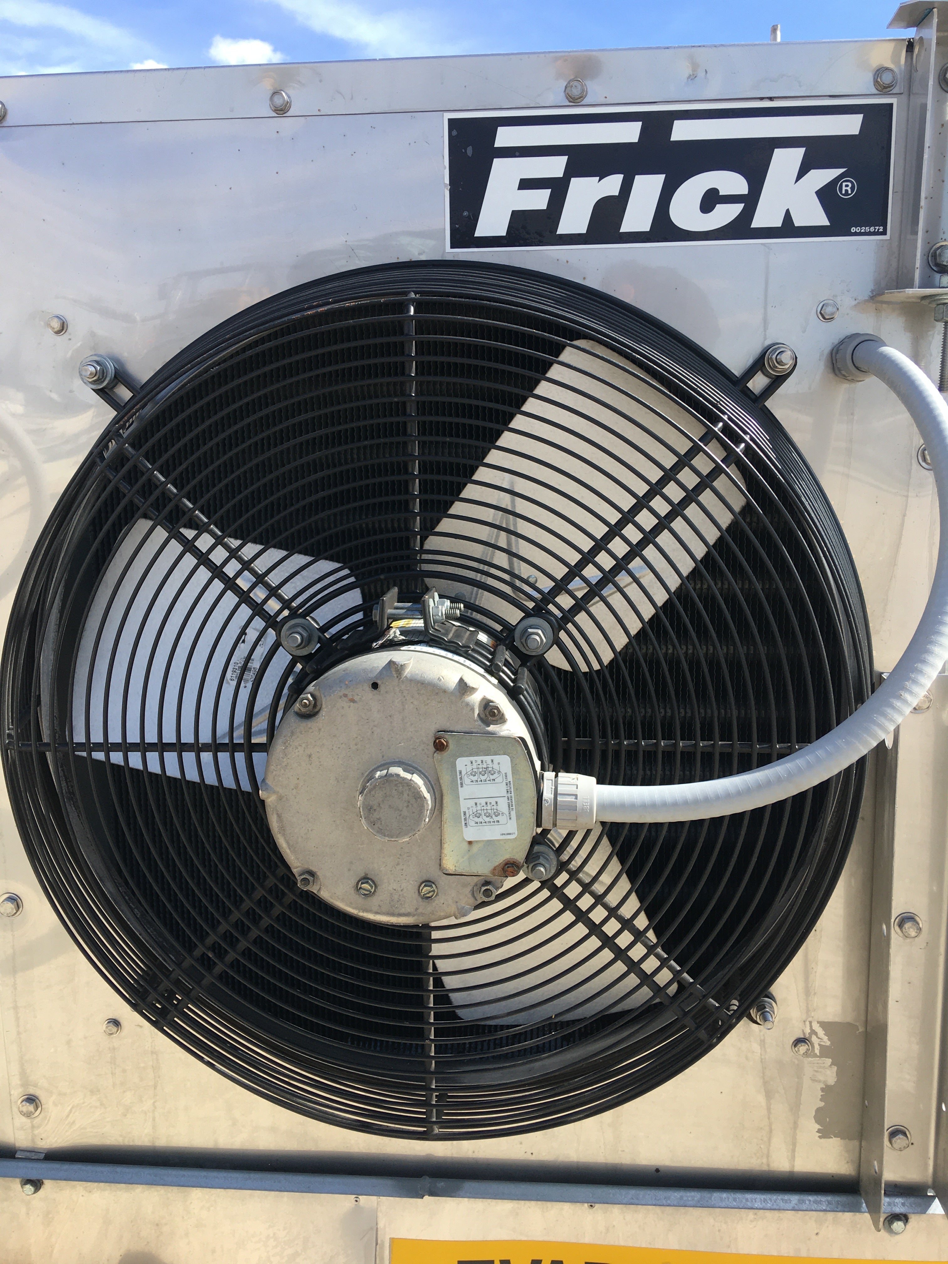 Frick SCS 584TH LH1 Ammonia Evaporator Coil- 22.5 TR, 4 Fans (Low/Medium Temperature) This Evaporator can use either wet or frosted coils. A wet capacity of 18000 (BTUH / °F TD) with an estimated tonnage of 22.5 (TR) @15TD. A frosted capacity of 16350 (BTUH / °F TD) with an estimated tonnage of 20 (TR) @15TD. Air Flow of 20465 CFM. A Coil Volume of 6.56. Recirculated coils. 5 Fans with a sound level of 69.8 dbA. 4 Fins per inch. The evaporator coil is the component in your industrial refrigeration system that absorbs the heat from the air and cools the environment. The higher the tonnage or BTU capacity, the larger the area that can be cooled down or the cooler you can make the area. The evap coil works in coordination with your refrigeration system including screw or reciprocating compressors, evaporative condensers and pressure vessels. For more info contact our Genemco Sales team at (979) 268-7447 or sales@genemco.com