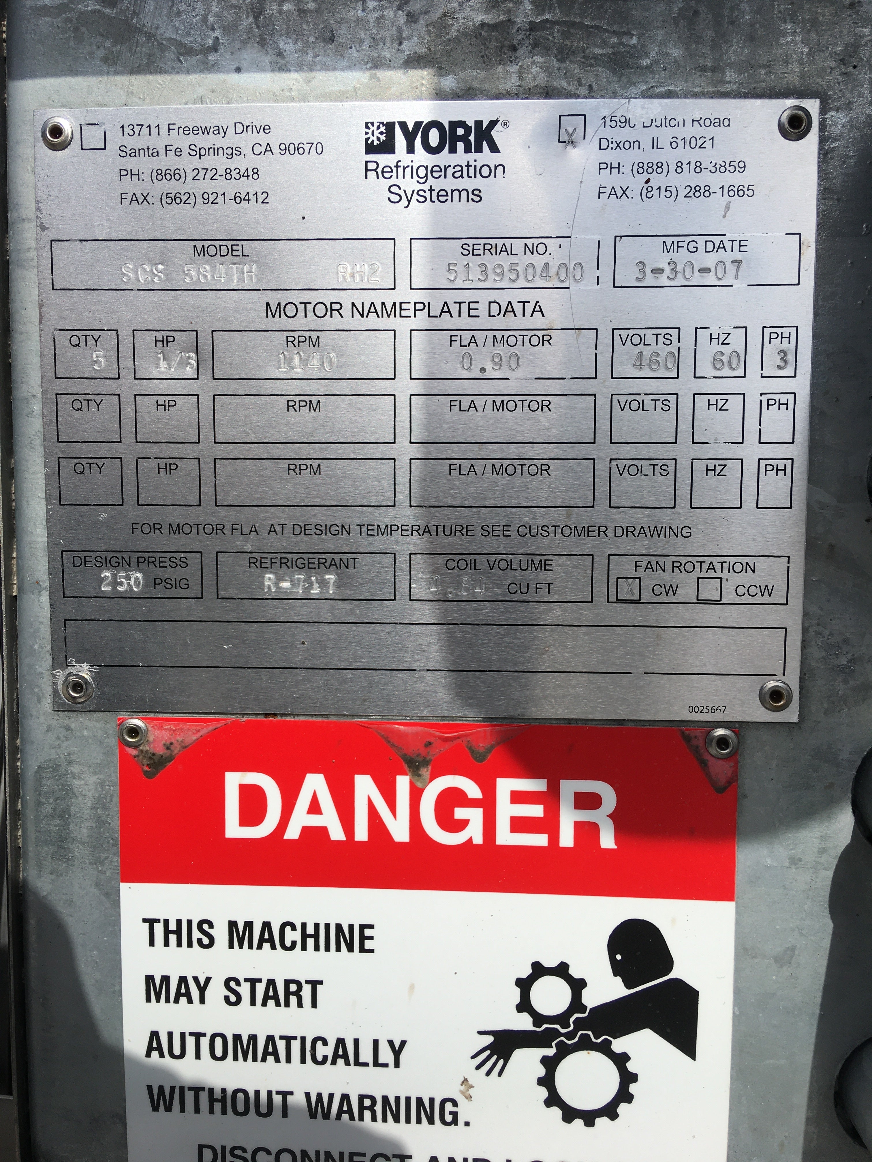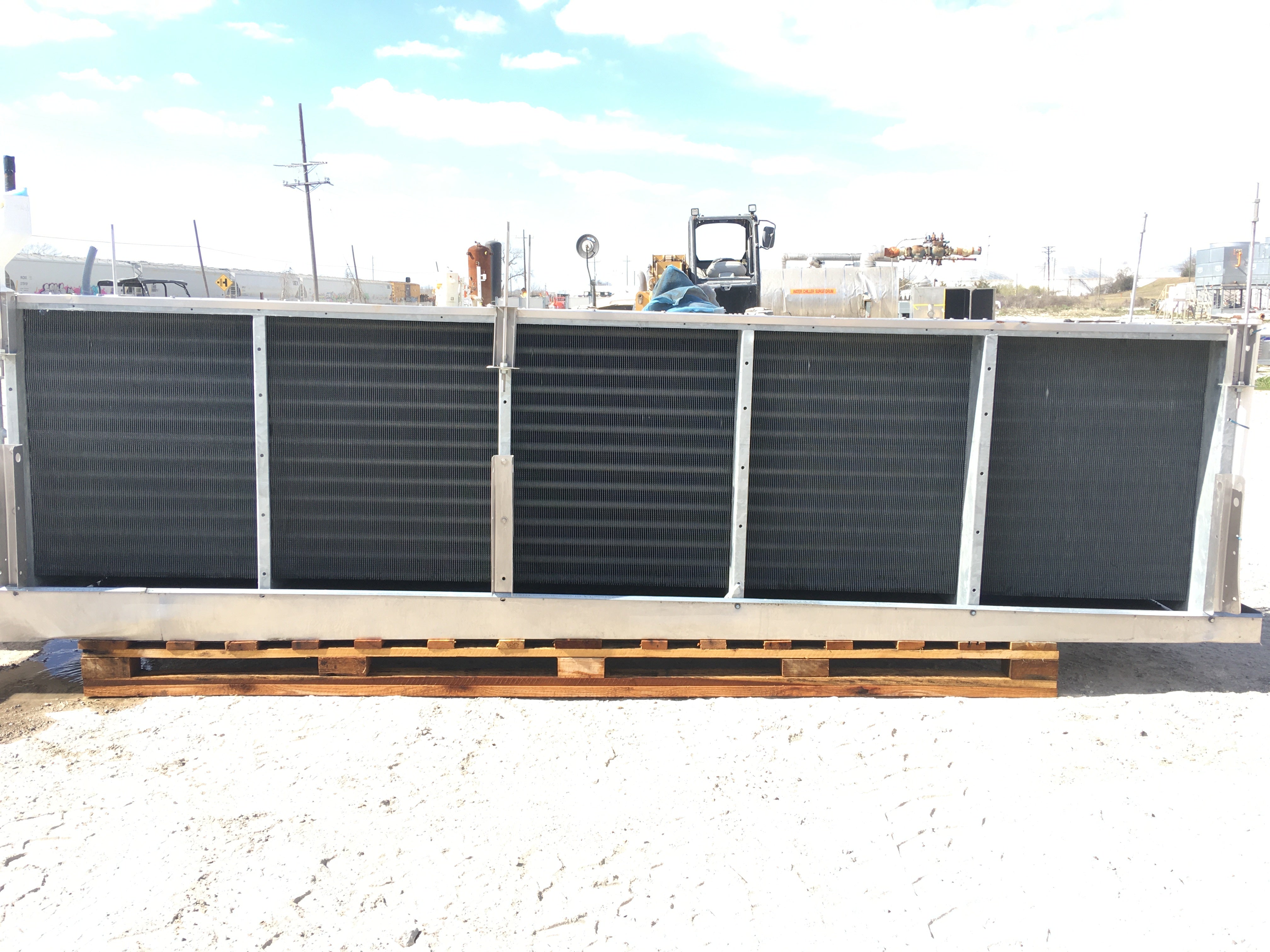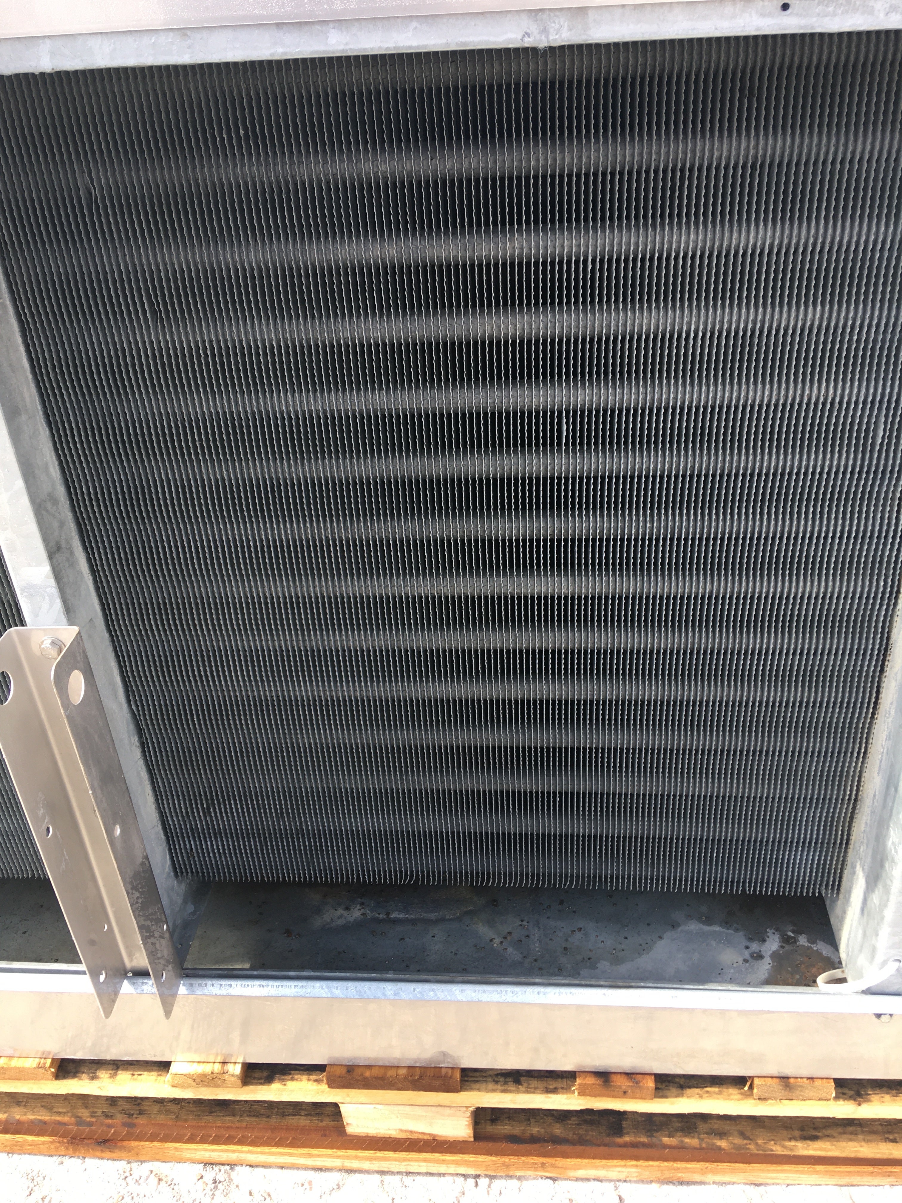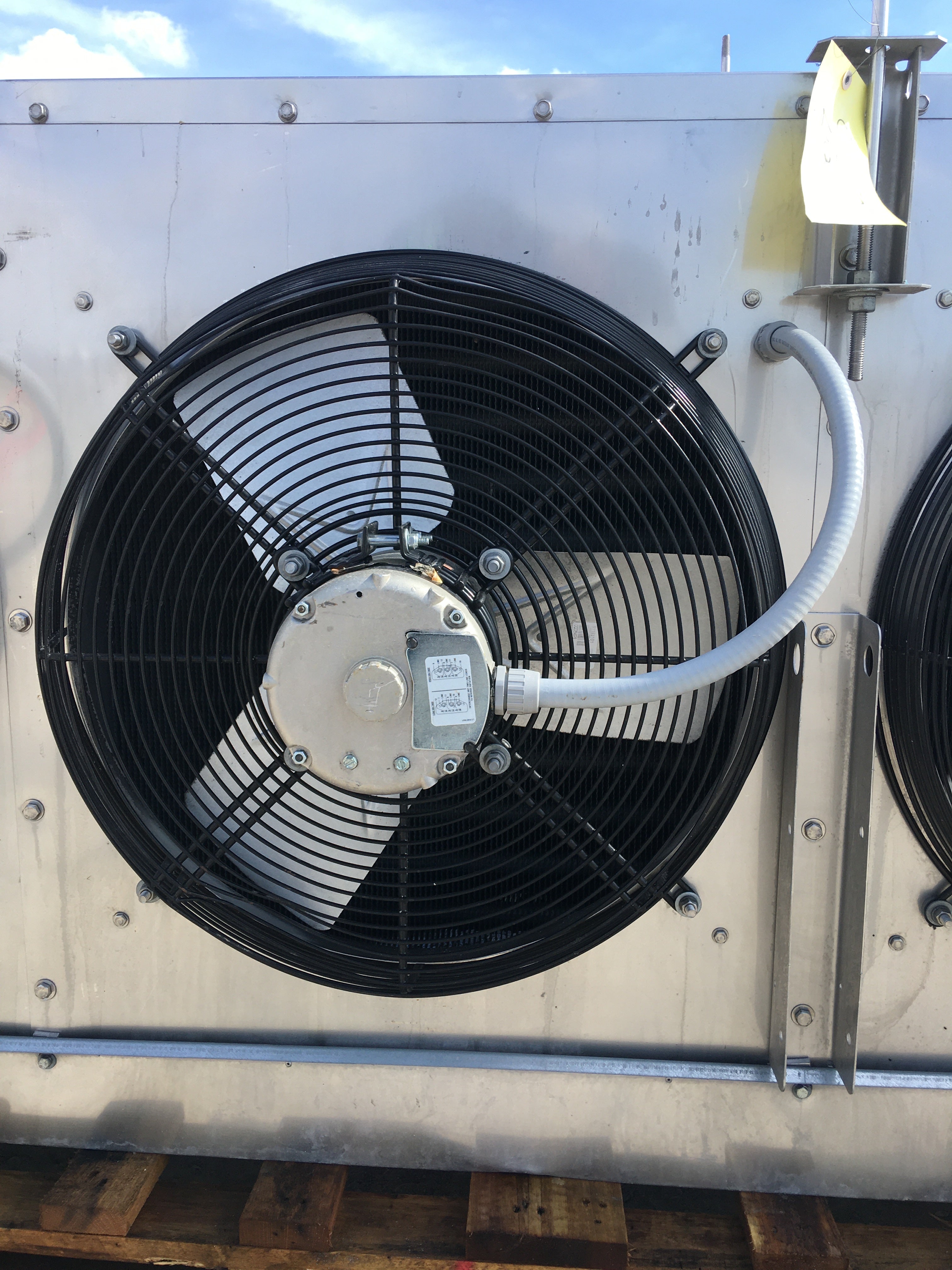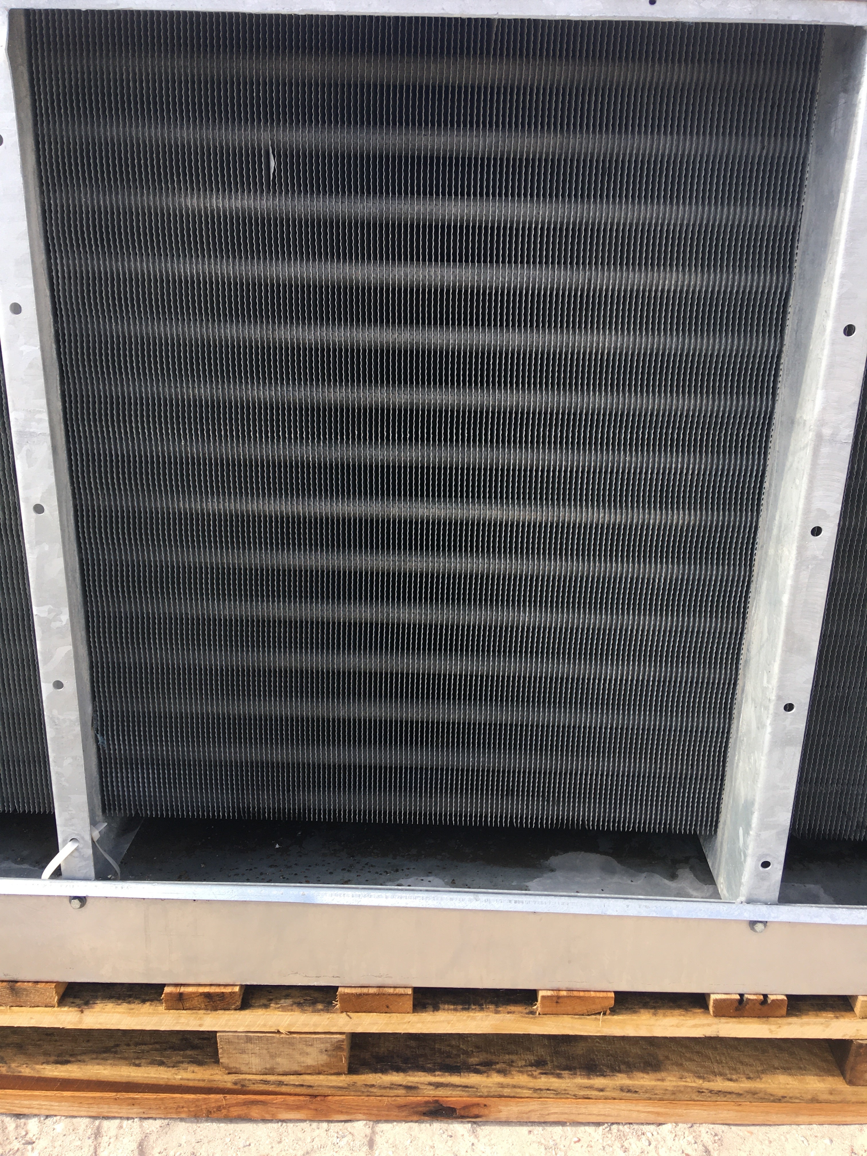 Frick SCS 584TH LH1 Ammonia Evaporator Coil- 22.5 TR, 4 Fans (Low/Medium Temperature) This Evaporator can use either wet or frosted coils. A wet capacity of 18000 (BTUH / °F TD) with an estimated tonnage of 22.5 (TR) @15TD. A frosted capacity of 16350 (BTUH / °F TD) with an estimated tonnage of 20 (TR) @15TD. Air Flow of 20465 CFM. A Coil Volume of 6.56. Recirculated coils. 5 Fans with a sound level of 69.8 dbA. 4 Fins per inch. The evaporator coil is the component in your industrial refrigeration system that absorbs the heat from the air and cools the environment. The higher the tonnage or BTU capacity, the larger the area that can be cooled down or the cooler you can make the area. The evap coil works in coordination with your refrigeration system including screw or reciprocating compressors, evaporative condensers and pressure vessels. For more info contact our Genemco Sales team at (979) 268-7447 or sales@genemco.com