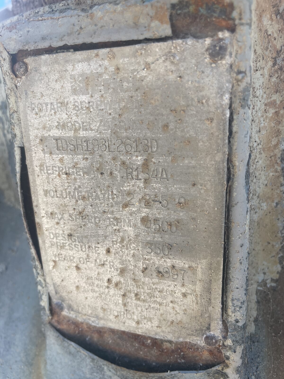 Frick Bare Screw Compressor: Model: TDSH193L, Serial No: 2613D. Volume Ratio: 2.2-5.0. Max Speed(RPM): 4500. Design Pressure(PSIG): 350. Year of Manufacture: 1997.