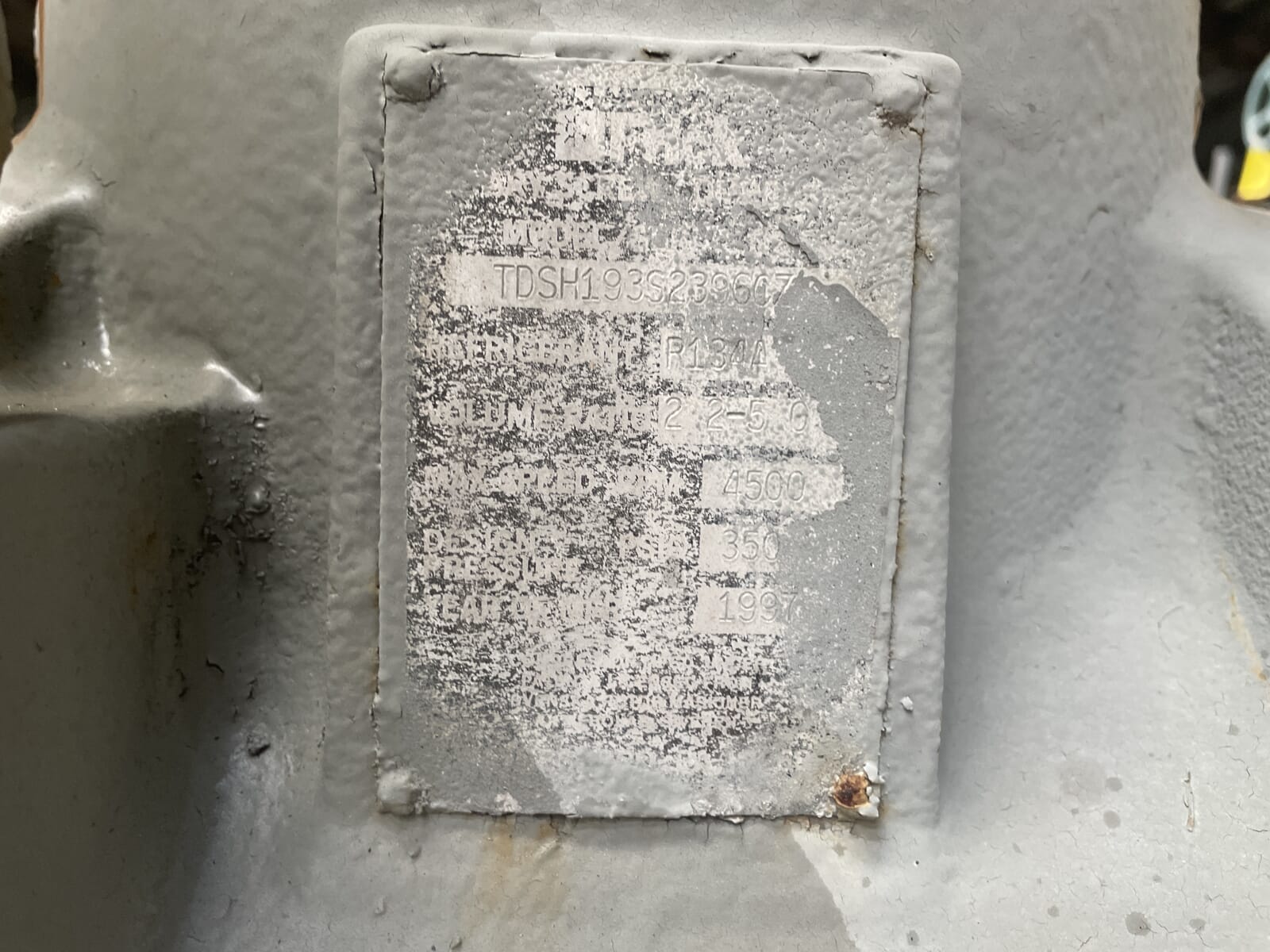 Frick Bare Screw Compressor: Model: TDSH193S, Serial No: 239607. Volume Ratio: 2.2-5.0. Max RPM: 4500. Design Pressure(PSIG): 350. Year Built: 1997.