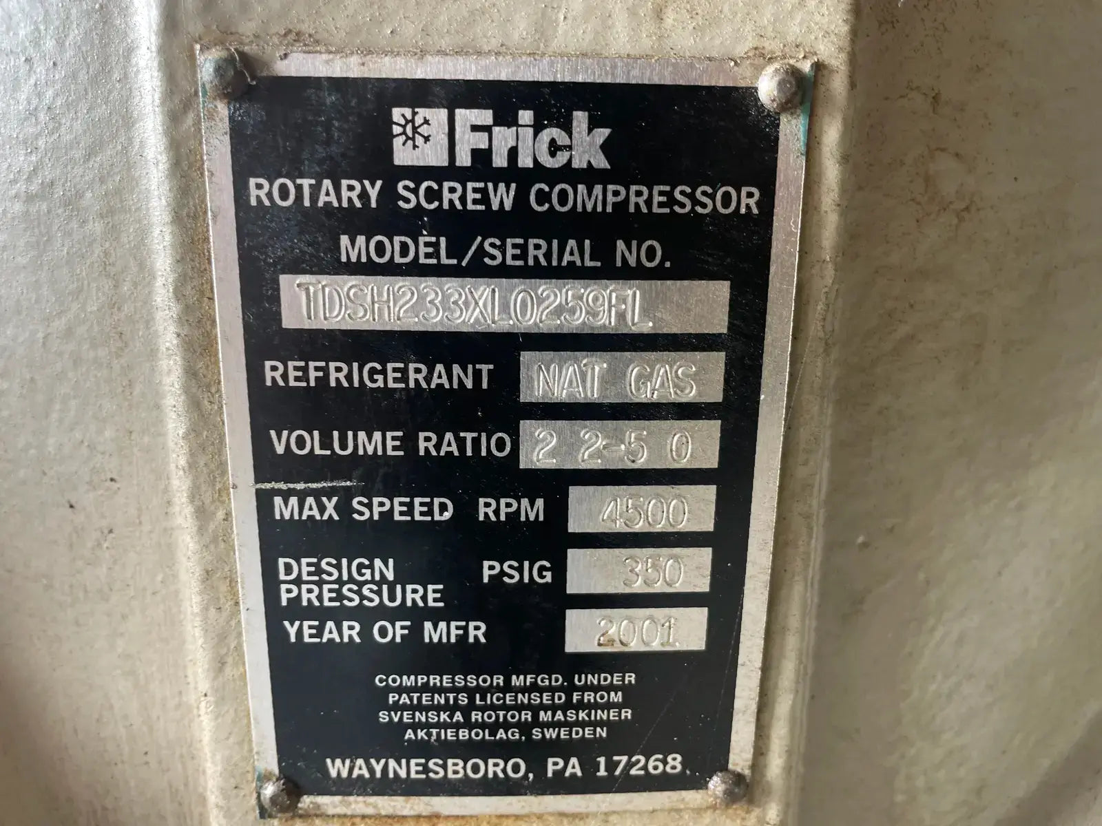 Frick Rotary Bare Screw Compressor. Model/Serial: TDSH233XL0259FL. Refrigerant: Natural Gas. Volume Ratio: 2 2-5 0. Max Speed RPM: 4500. Design Pressure: 350 PSIG. Connections - Suction Flange: 10 in. Discharge Flange: 6 in. Year of Mfr: 2001.