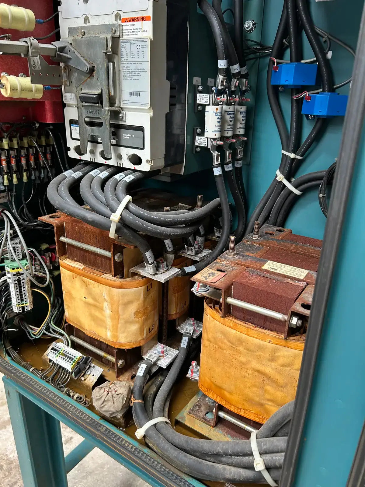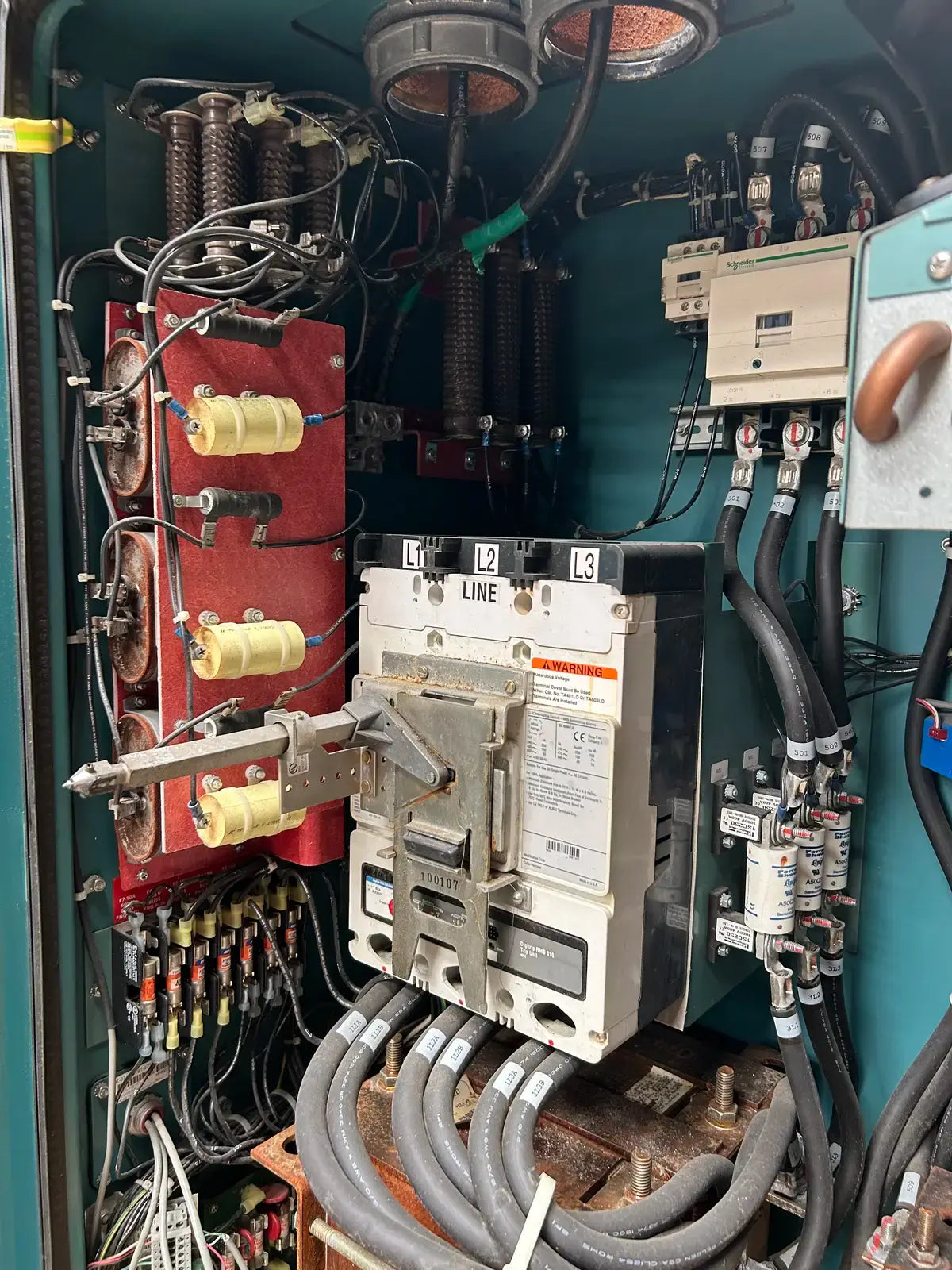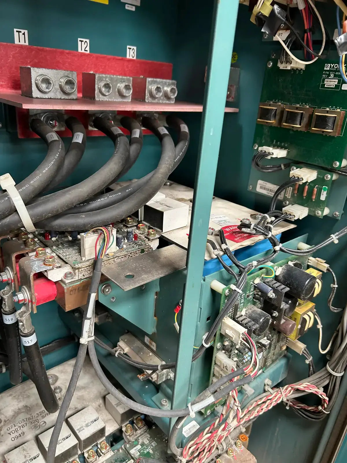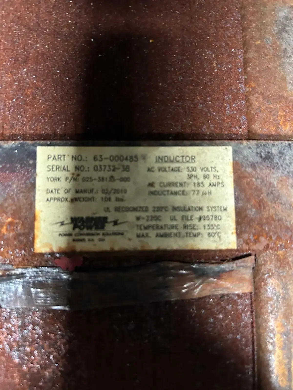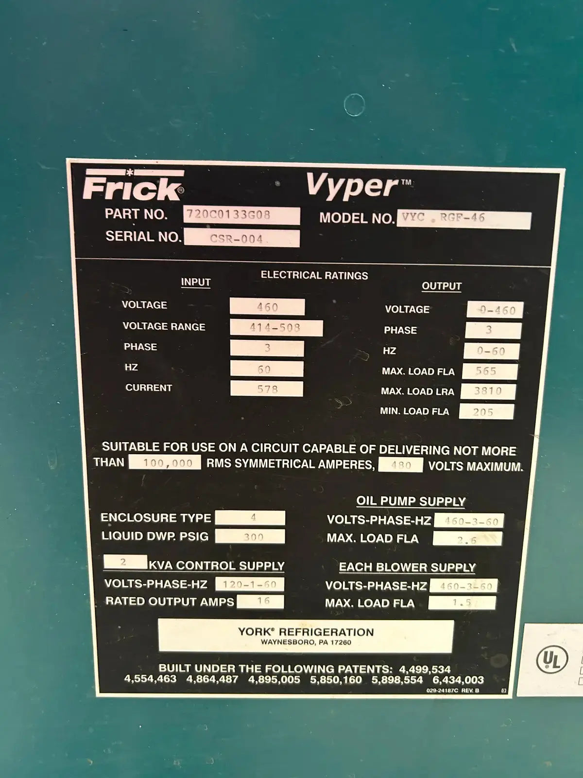 Frick Vyper Variable Speed Drive Screw Compressor Starter. Model: VYC-RGF-46. Serial No: CSR-004. Part No: 720C0133G08. Input -Voltage: 460, Voltage Range: 414-503, Ph: 3, Hz: 60, Current: 578. Output: Voltage: 0-460, Ph: 3, Hz: 60, Max Load FLA: 565, Max Load LRA: 3810, Min Load FLA: 205.
