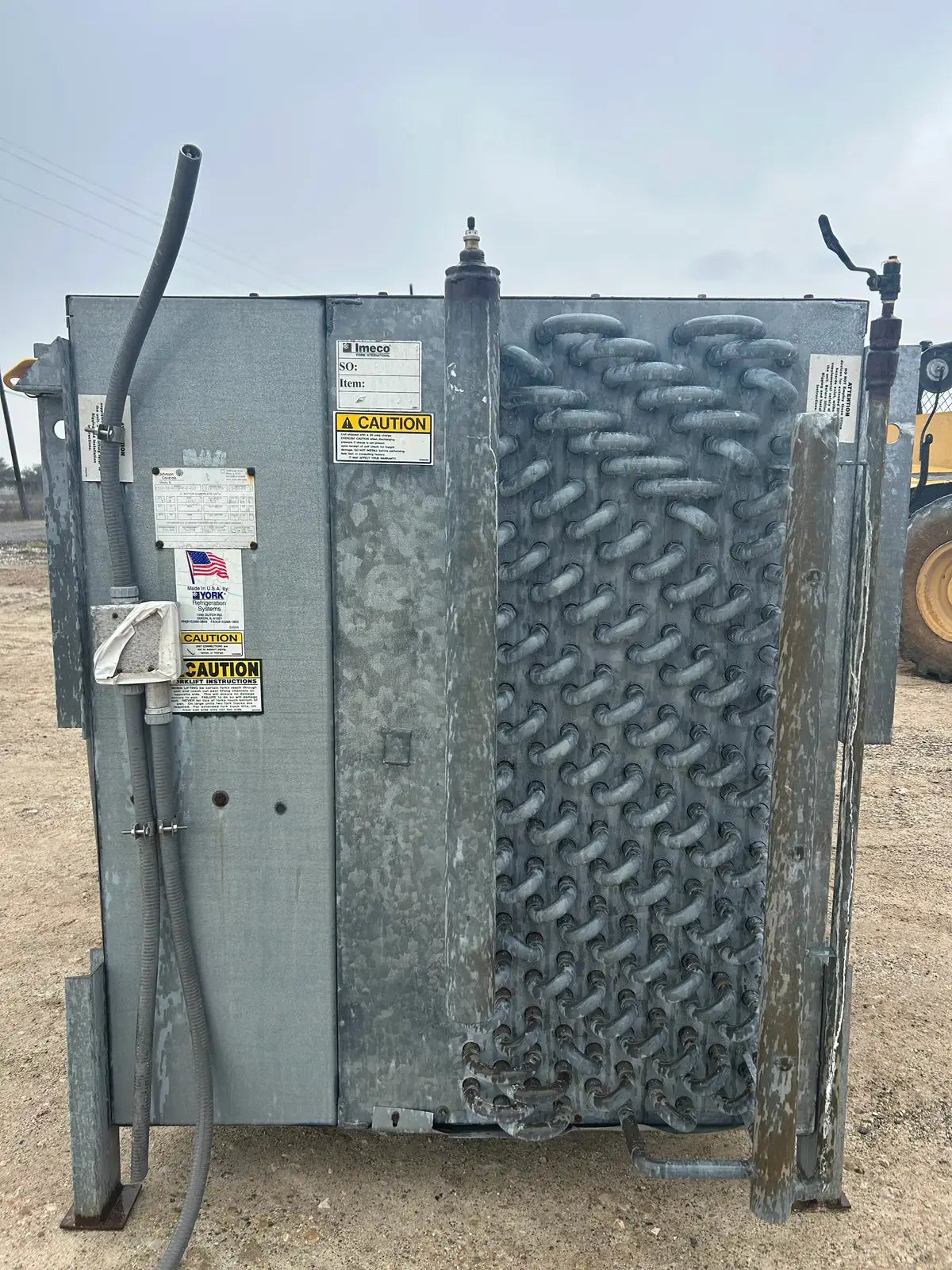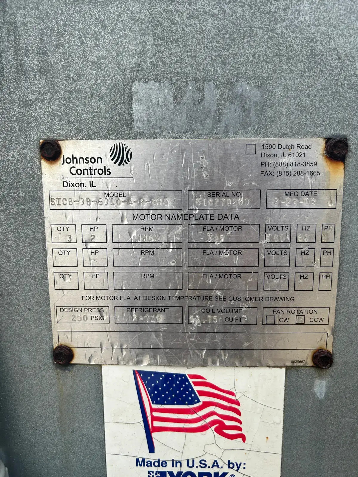 Frick/Johnson Controls Ammonia Evaporative Coil. Model: SICB-3B-6310-4-2-RH2. Serial No: 618270200. Design Pressure: 250 PSI. Refrigerant: R-717. Coil Volume: 13.75 Cu Ft.