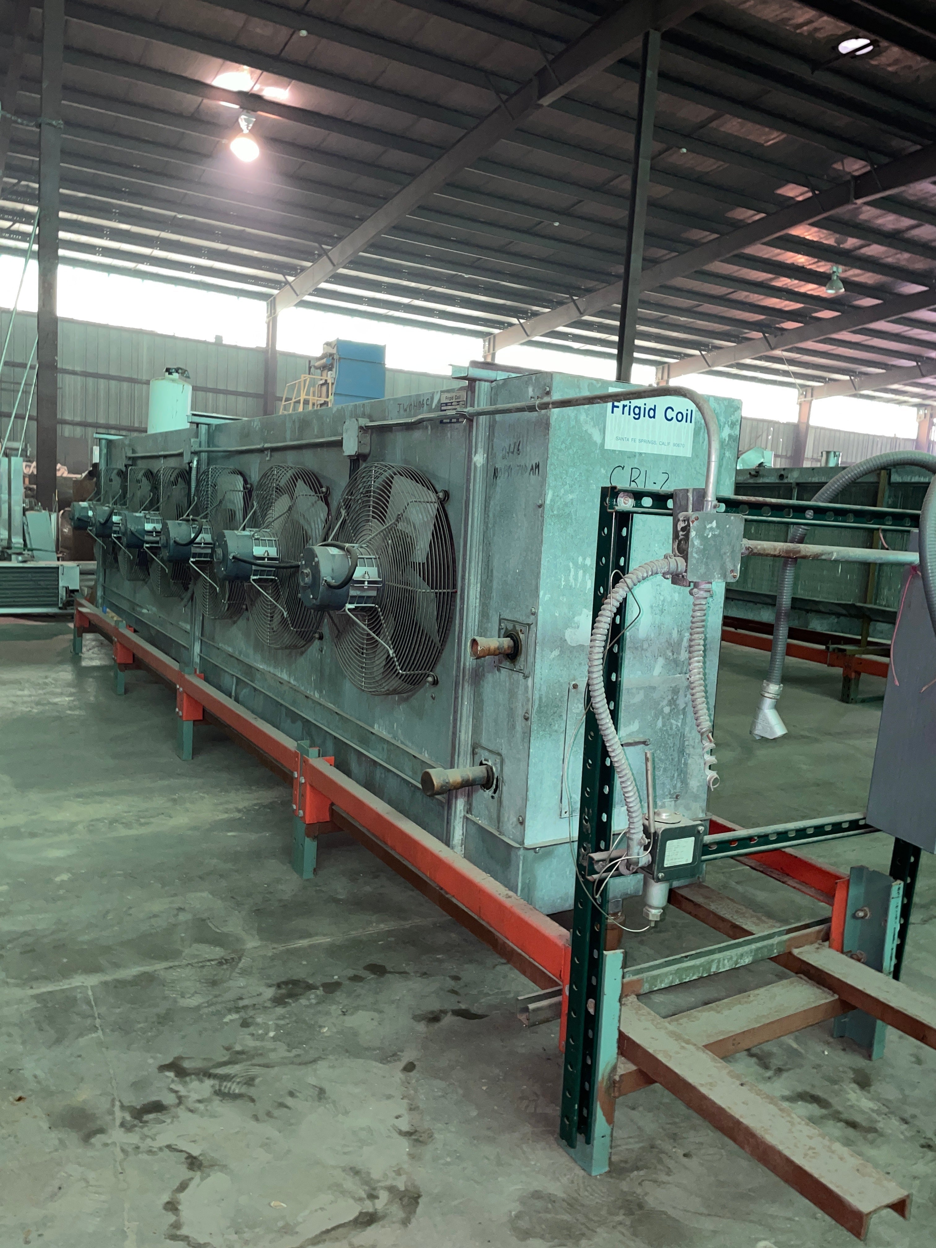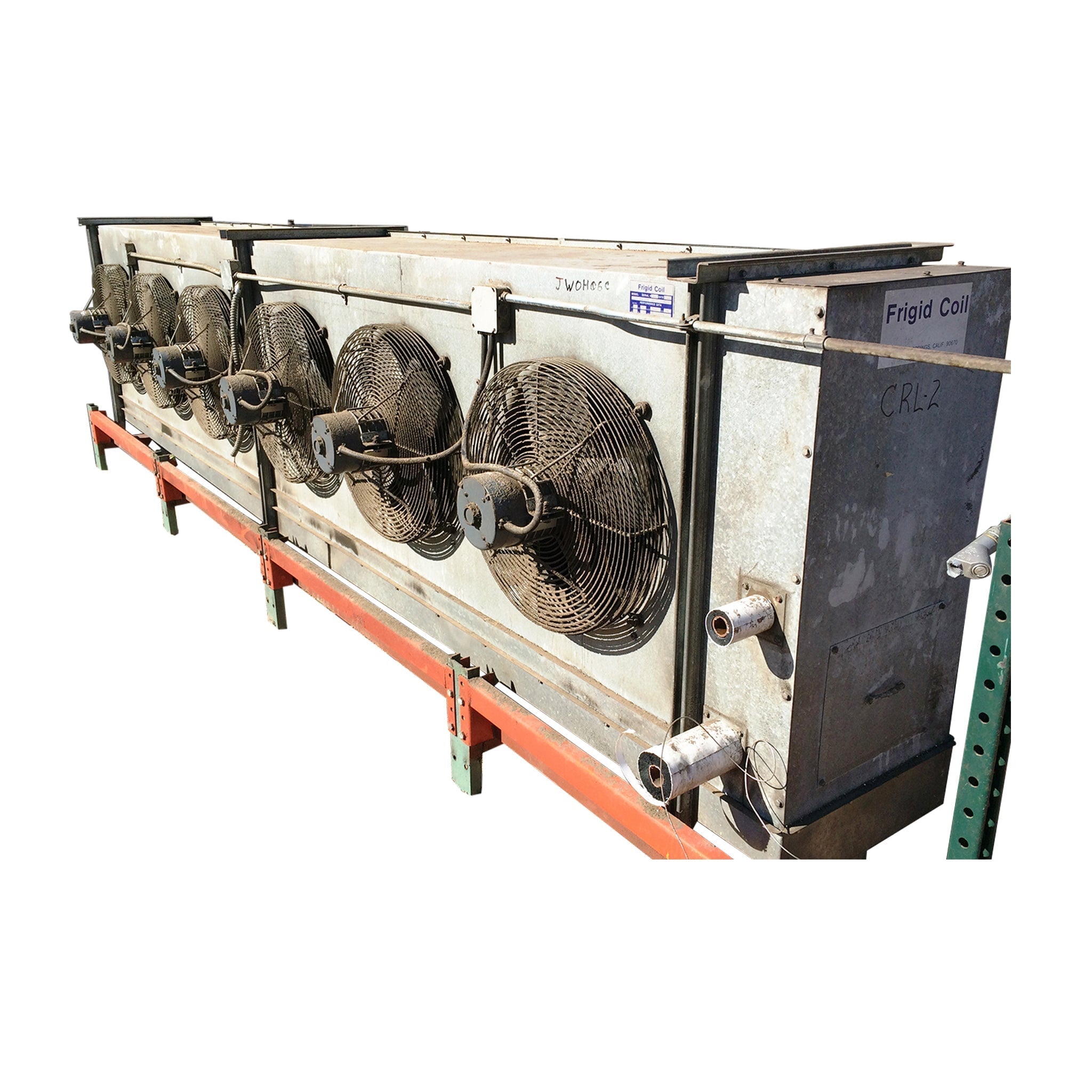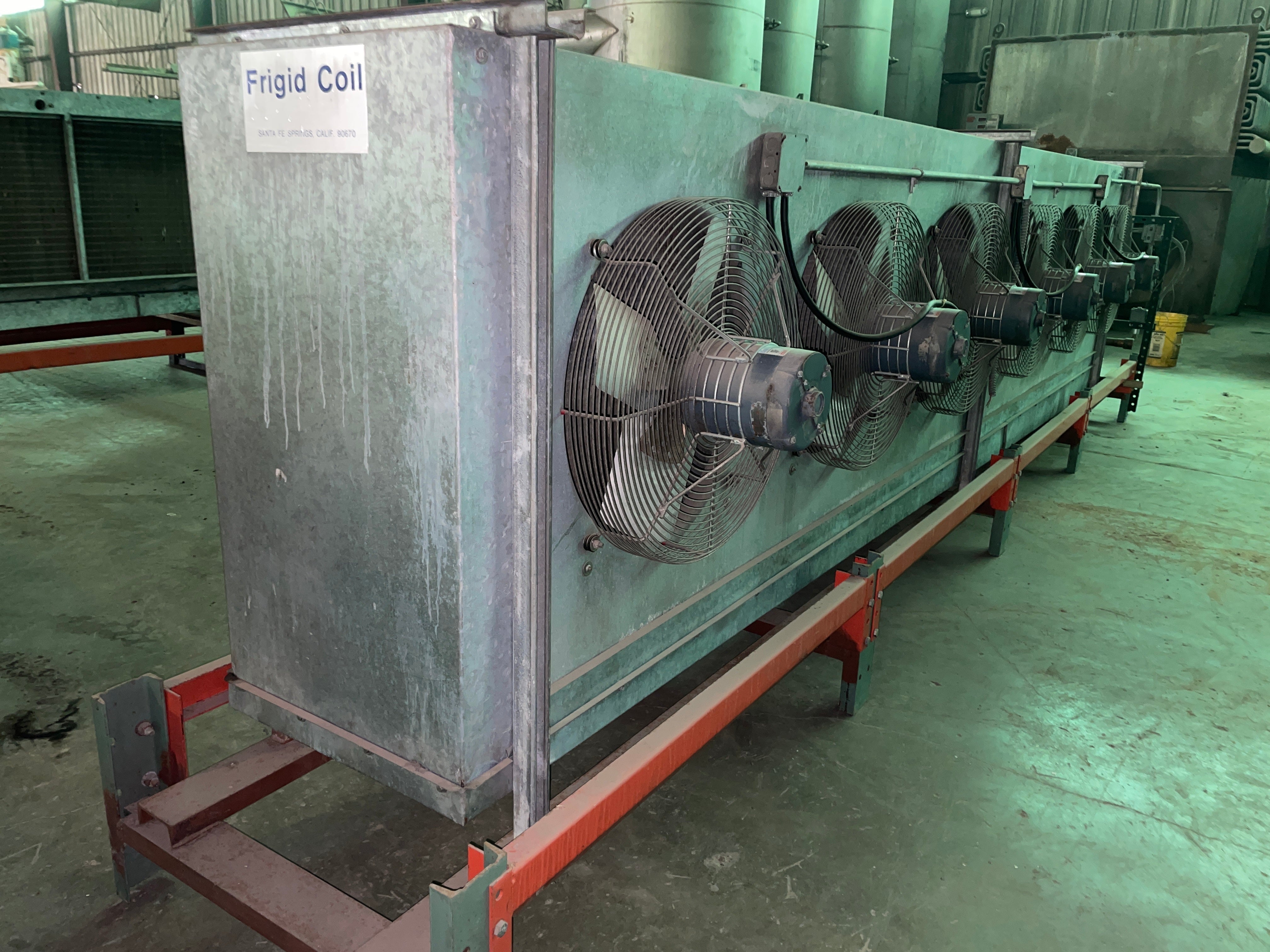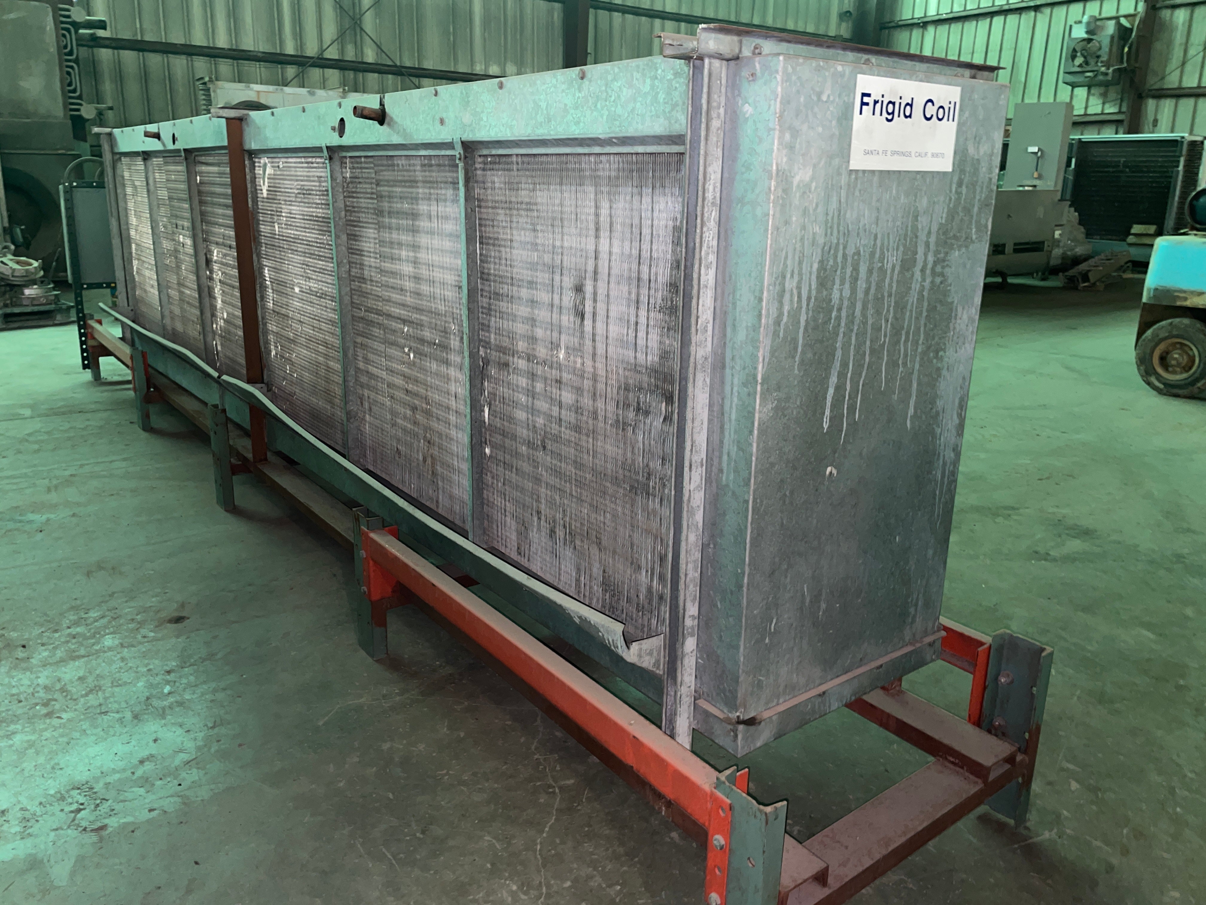 Frigid Coil Direct Expansion 6-Fan Evaporator Coil. Series 300 HTC-T 684 (29427 B). Serial 25002. Date 8/86. Motors: (6) 1/3 HP, 230V, 1.6 amps each, 1140 RPM, 3-phase, 60 Hz. 23,277 CFM. Refrigerant: R-22 (freon). Test pressure: 350 PSI. 4 FPI. Coil dimensions: 16.5 ft. L x 3.5 ft. W x 4 ft. H.