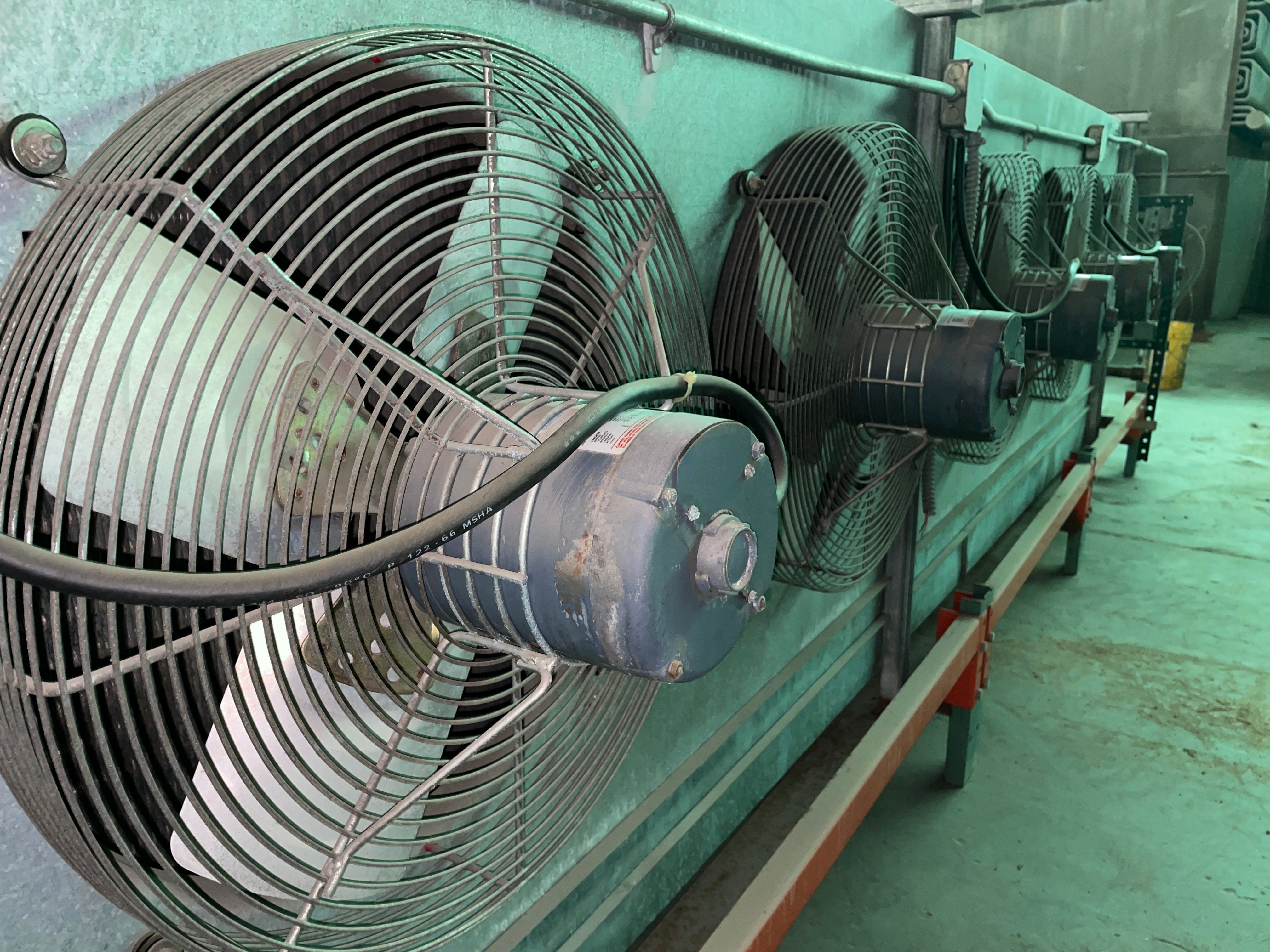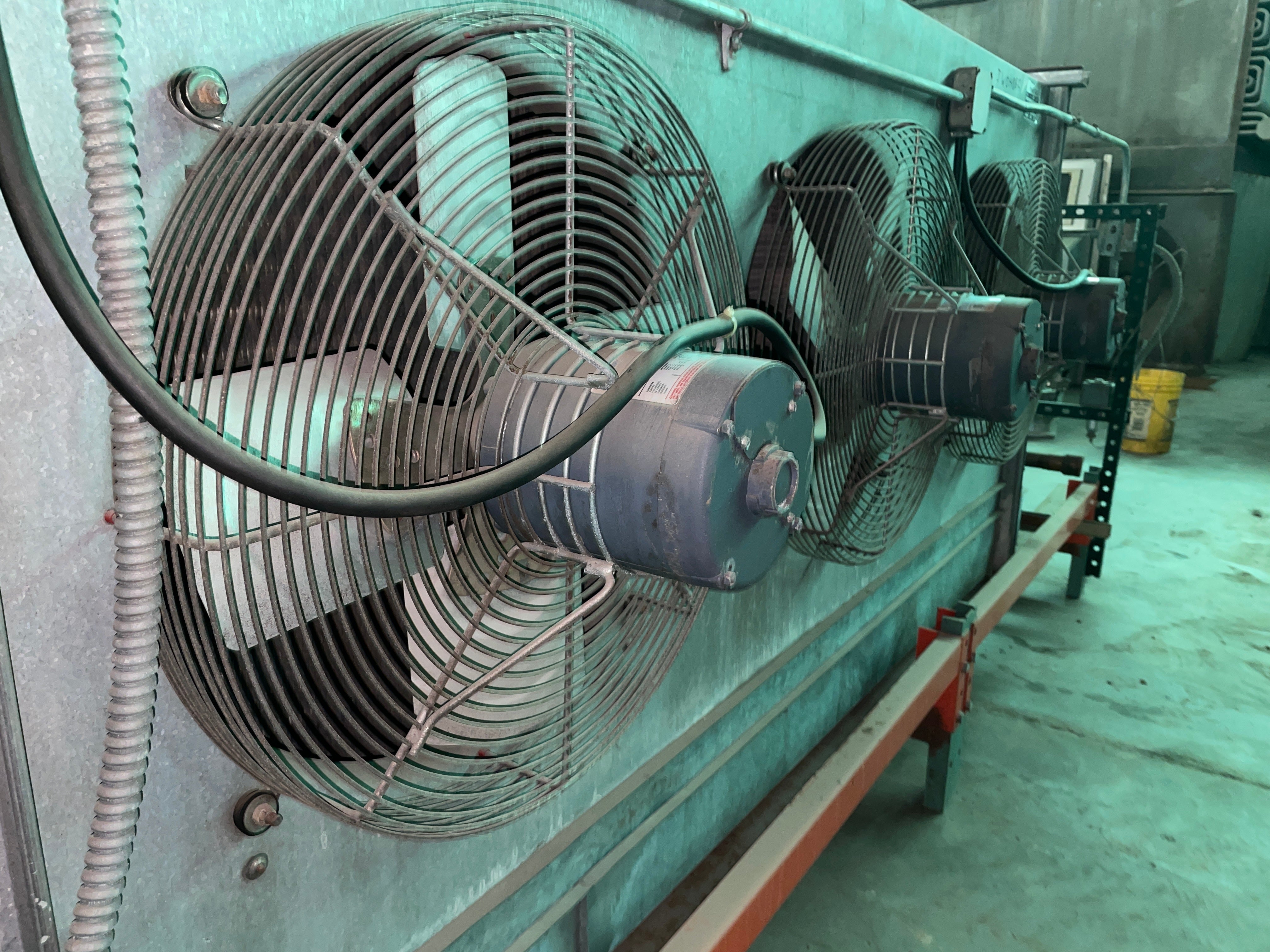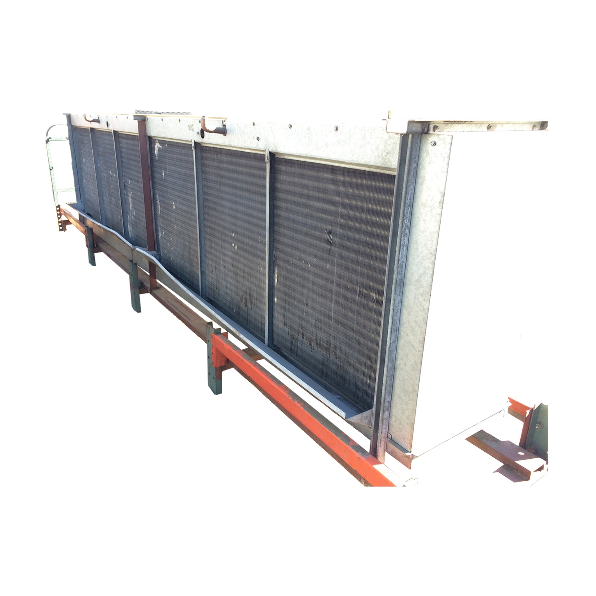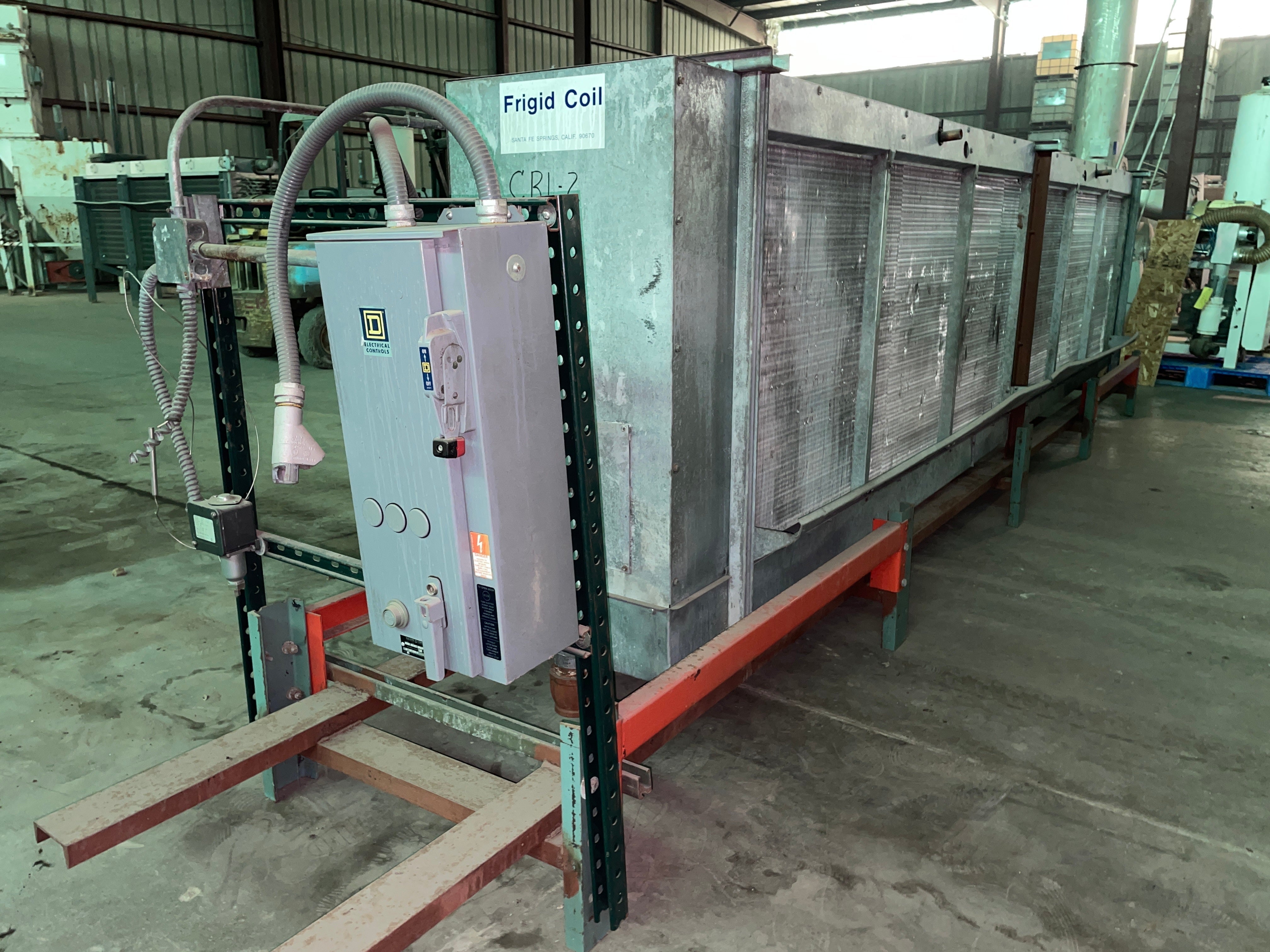 Frigid Coil Direct Expansion 6-Fan Evaporator Coil. Series 300 HTC-T 684 (29427 B). Serial 25002. Date 8/86. Motors: (6) 1/3 HP, 230V, 1.6 amps each, 1140 RPM, 3-phase, 60 Hz. 23,277 CFM. Refrigerant: R-22 (freon). Test pressure: 350 PSI. 4 FPI. Coil dimensions: 16.5 ft. L x 3.5 ft. W x 4 ft. H.