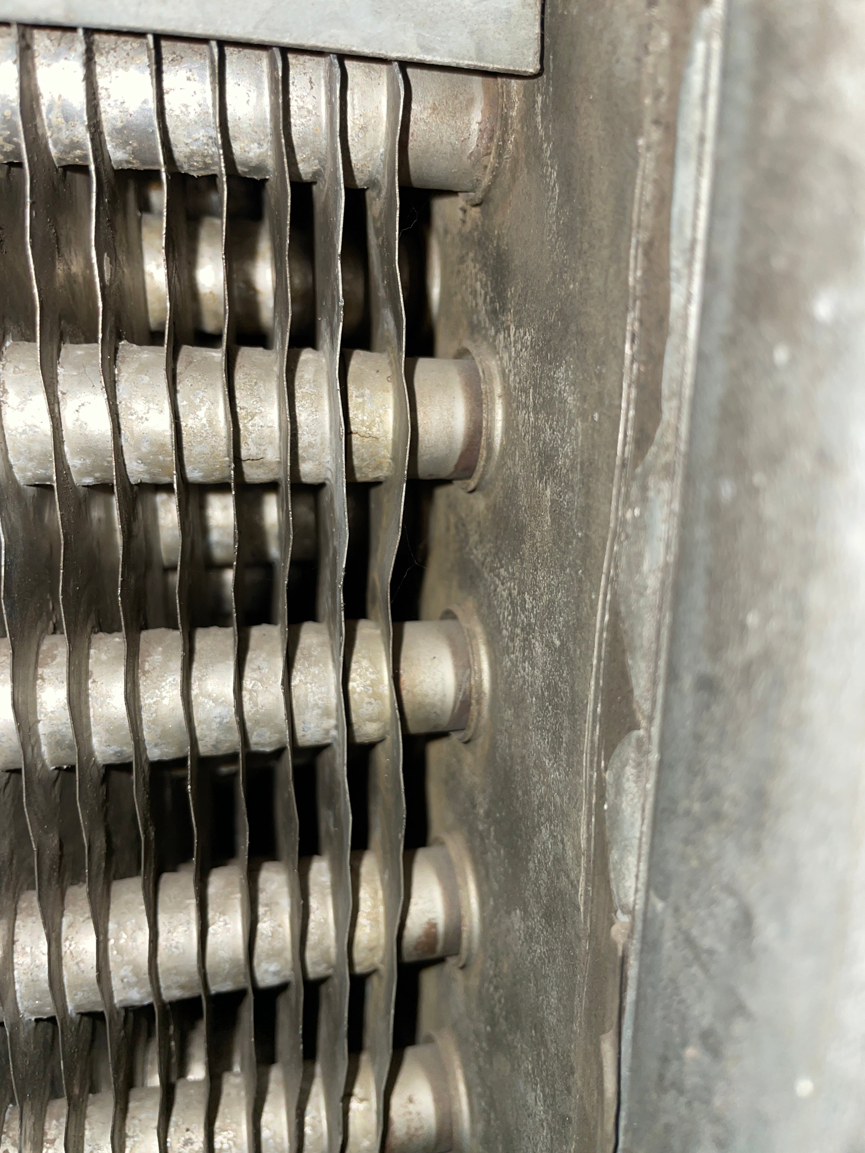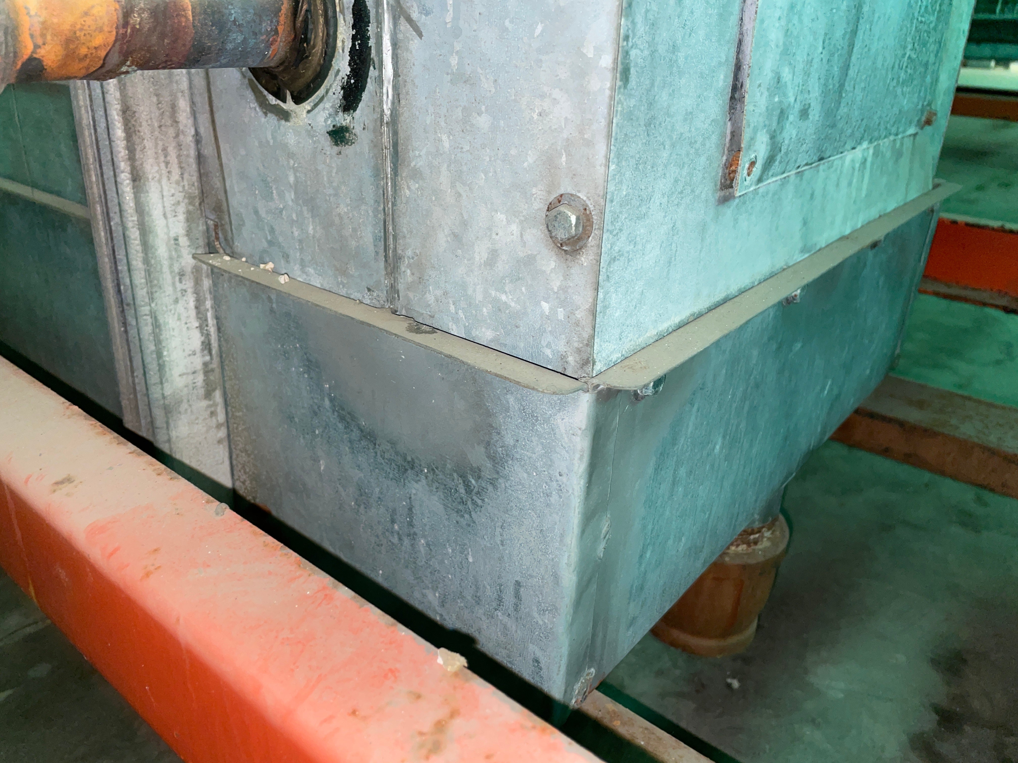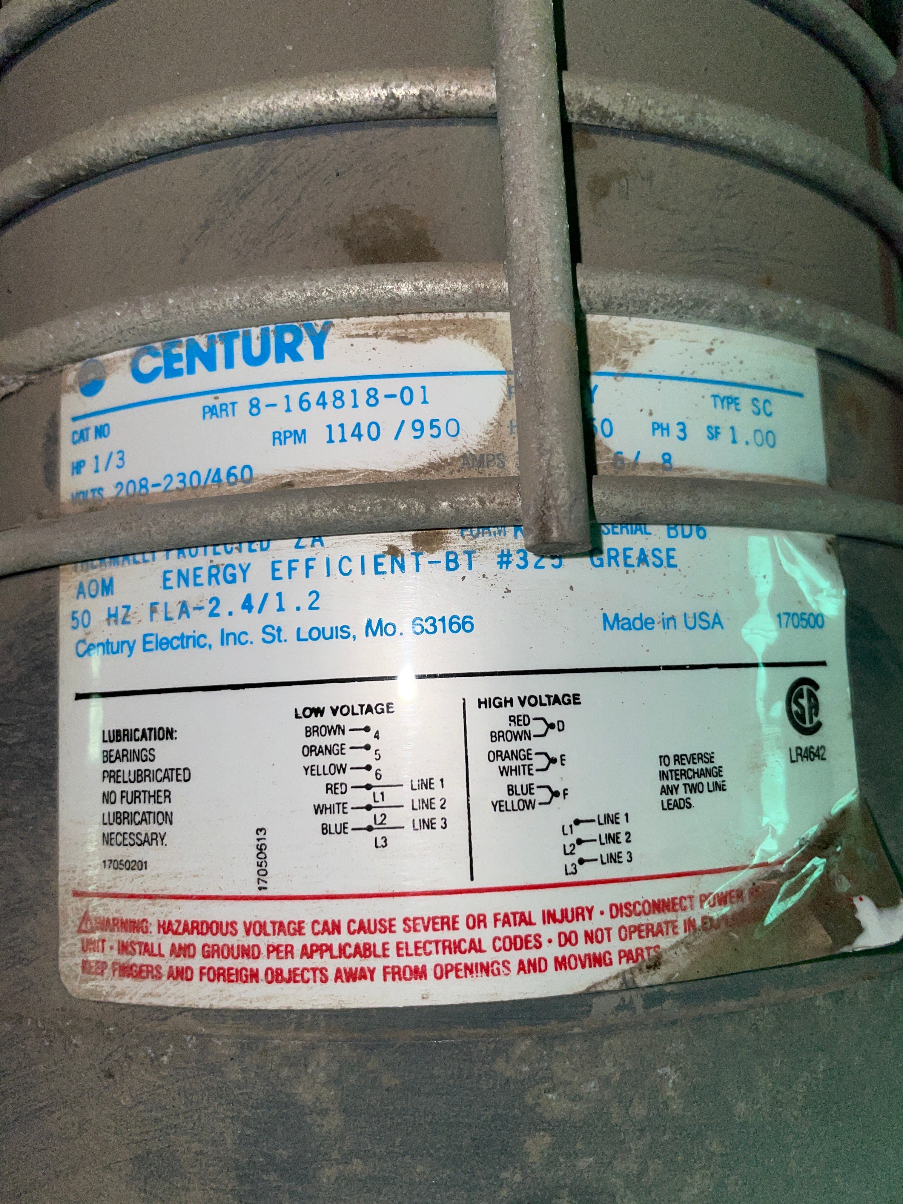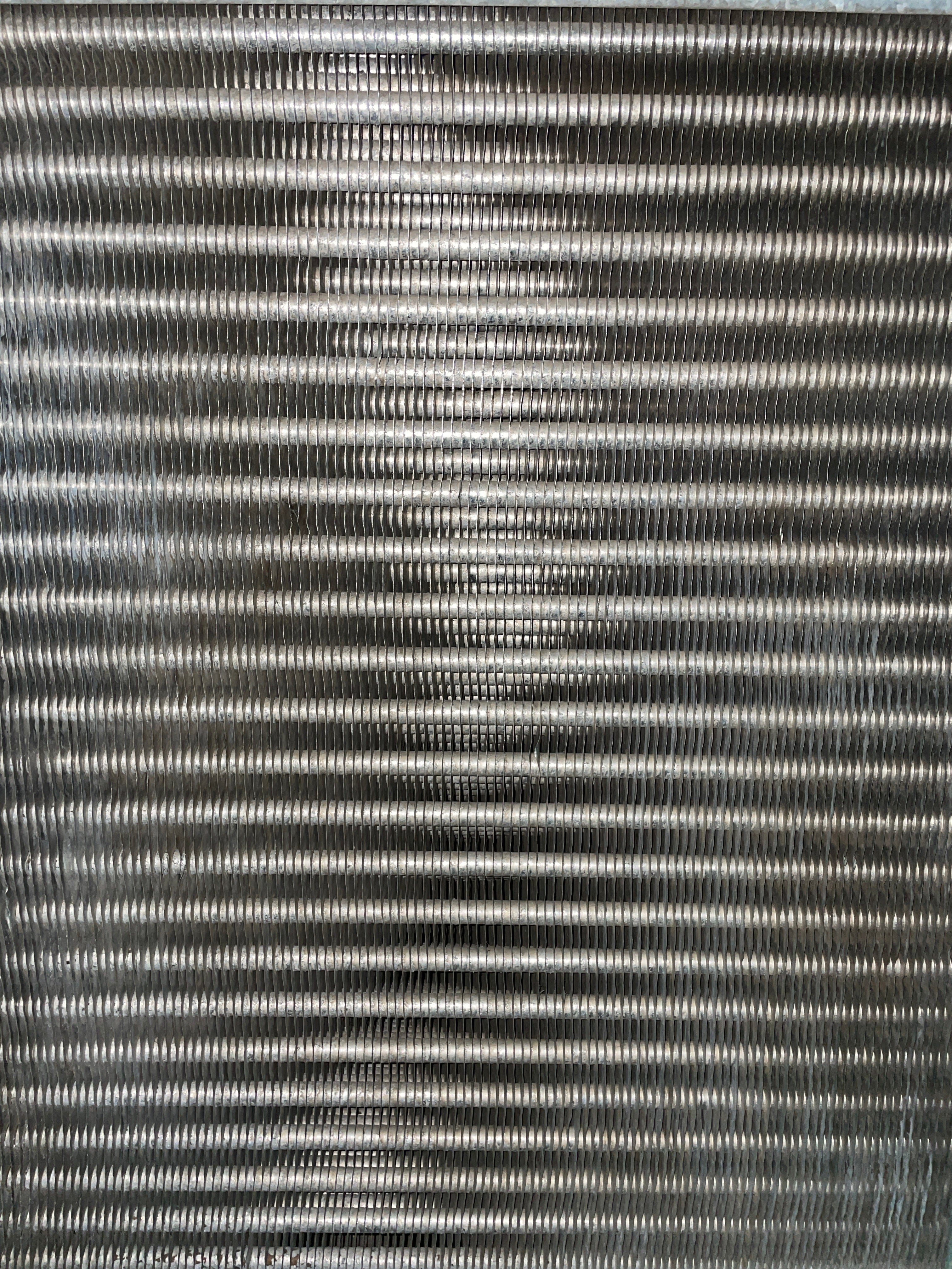 Frigid Coil Direct Expansion 6-Fan Evaporator Coil. Series 300 HTC-T 684 (29427 B). Serial 25002. Date 8/86. Motors: (6) 1/3 HP, 230V, 1.6 amps each, 1140 RPM, 3-phase, 60 Hz. 23,277 CFM. Refrigerant: R-22 (freon). Test pressure: 350 PSI. 4 FPI. Coil dimensions: 16.5 ft. L x 3.5 ft. W x 4 ft. H.