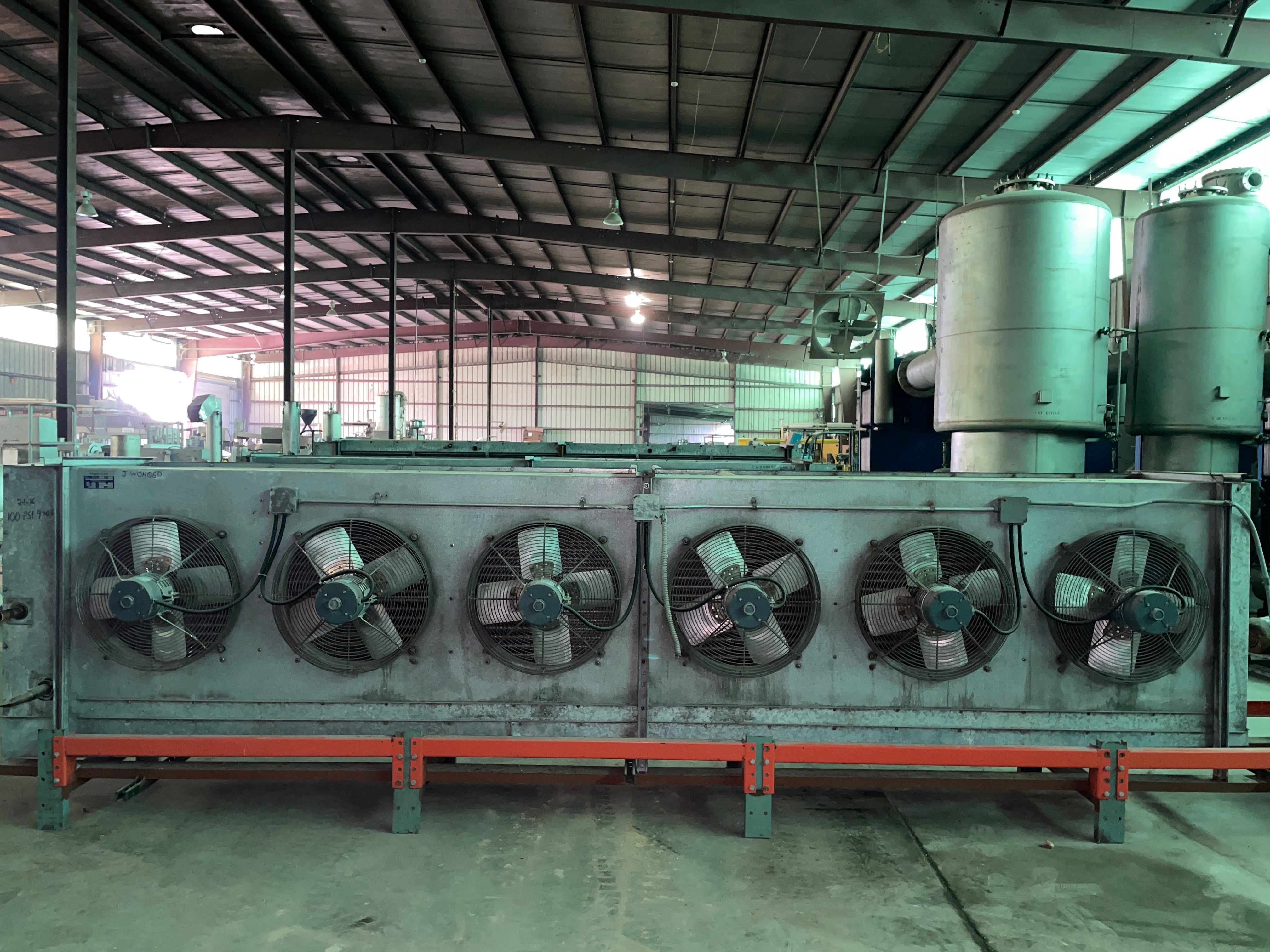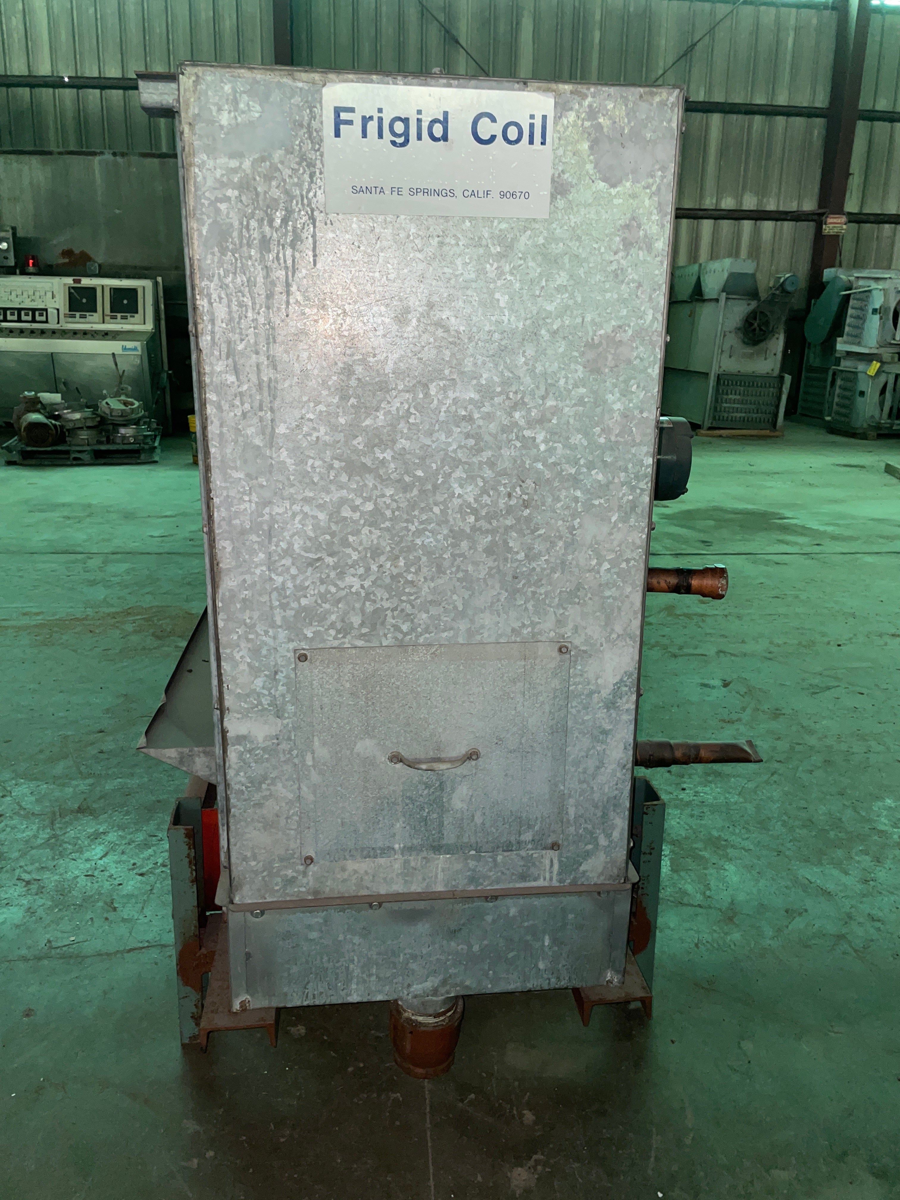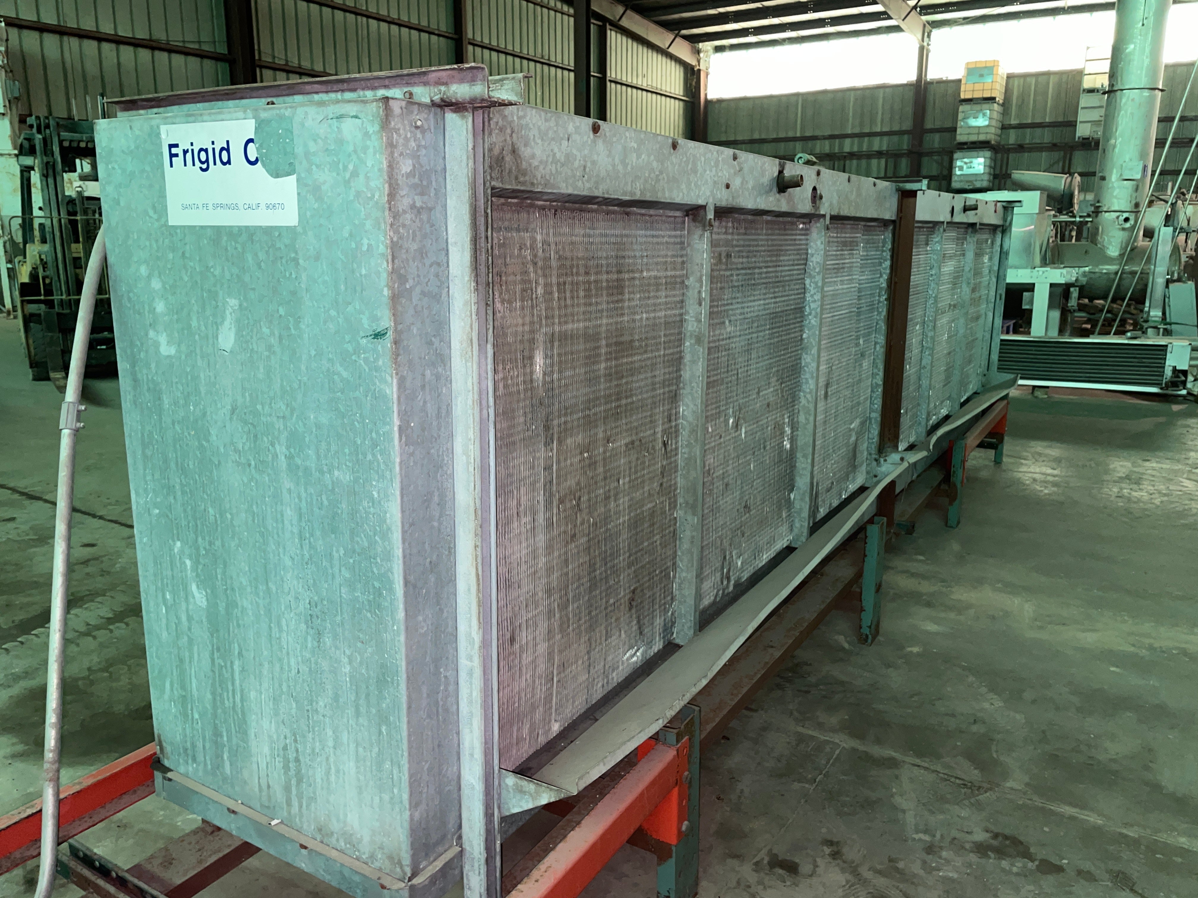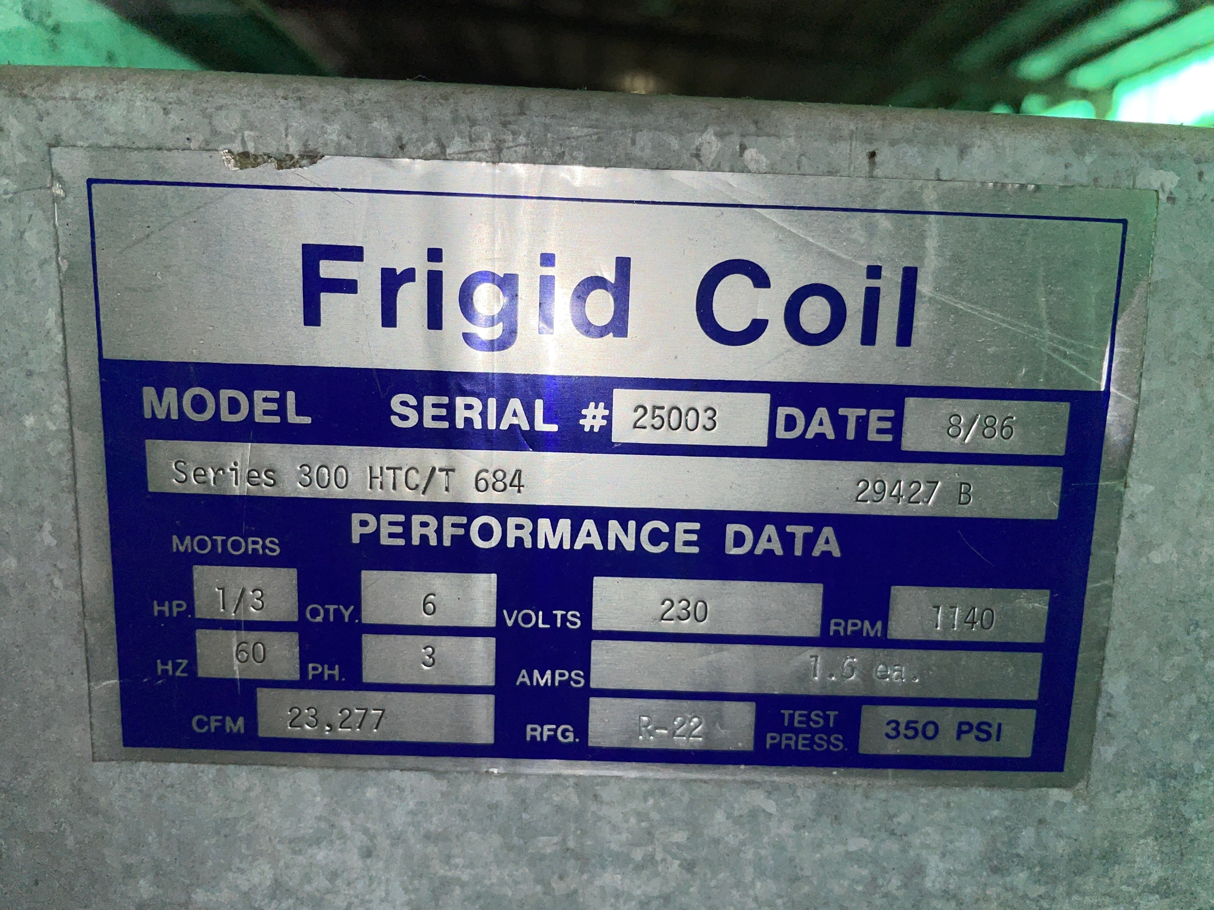 Frigid Coil Direct Expansion 6-Fan Evaporator Coil. Series 300 HTC-T 684 (29427 B). Serial 25003. Date 8/86. Motors: (6) 1/3 HP, 230V, 1.6 amps each, 1140 RPM, 3-phase, 60 Hz. 23,277 CFM. Refrigerant: R-22 (freon). Test pressure: 350 PSI. 4 FPI. Coil dimensions: 16.5 ft. L x 3.5 ft. W x 4 ft. H.