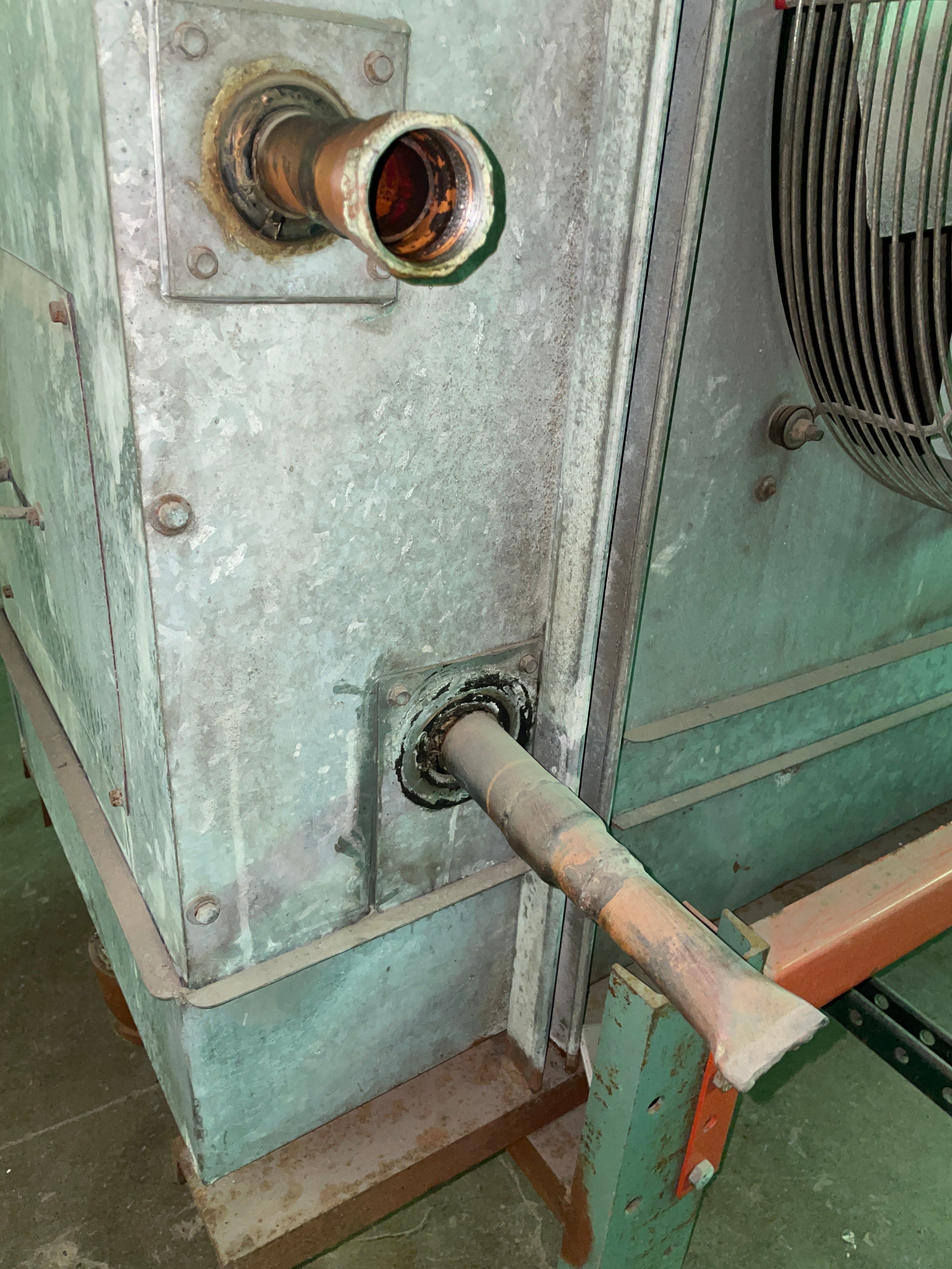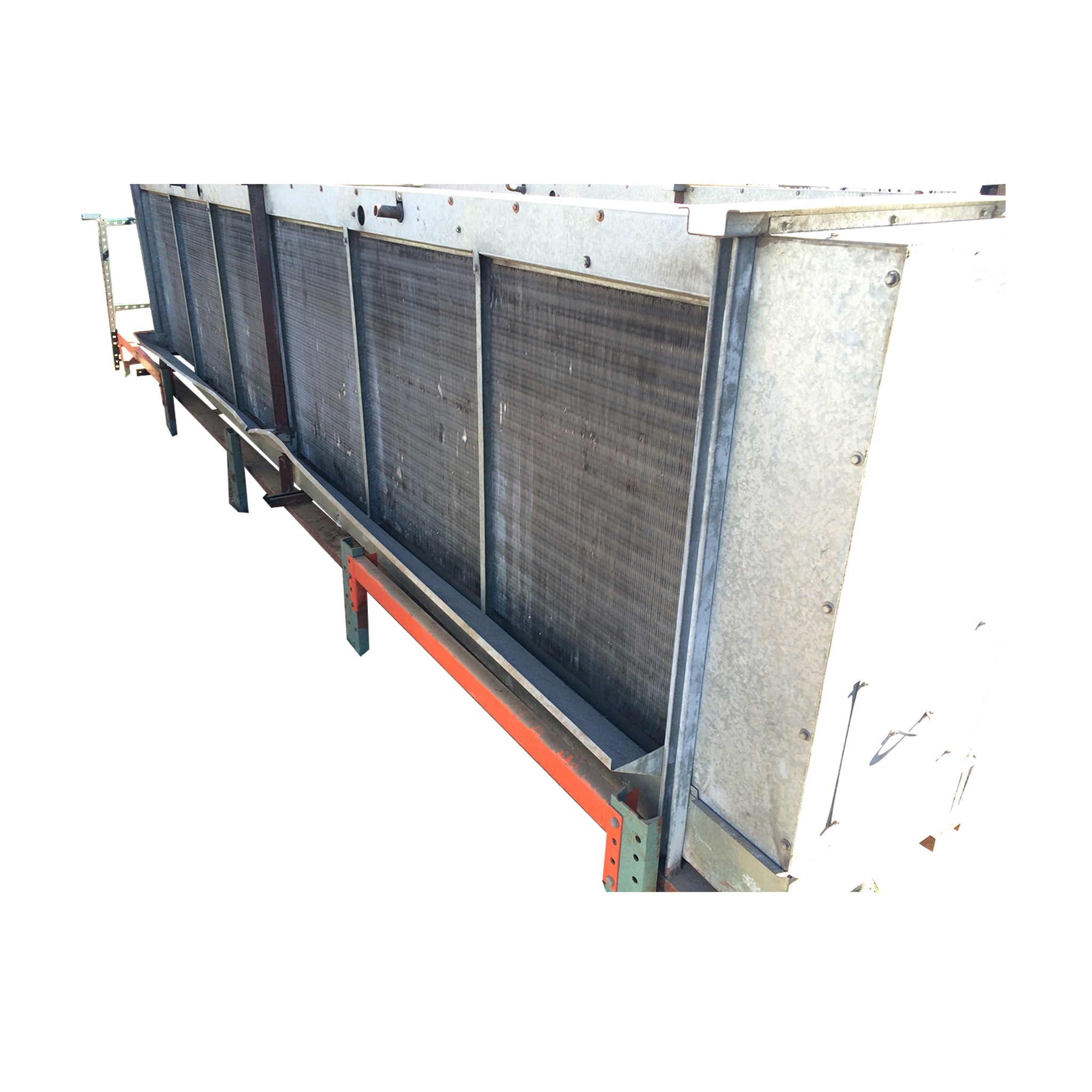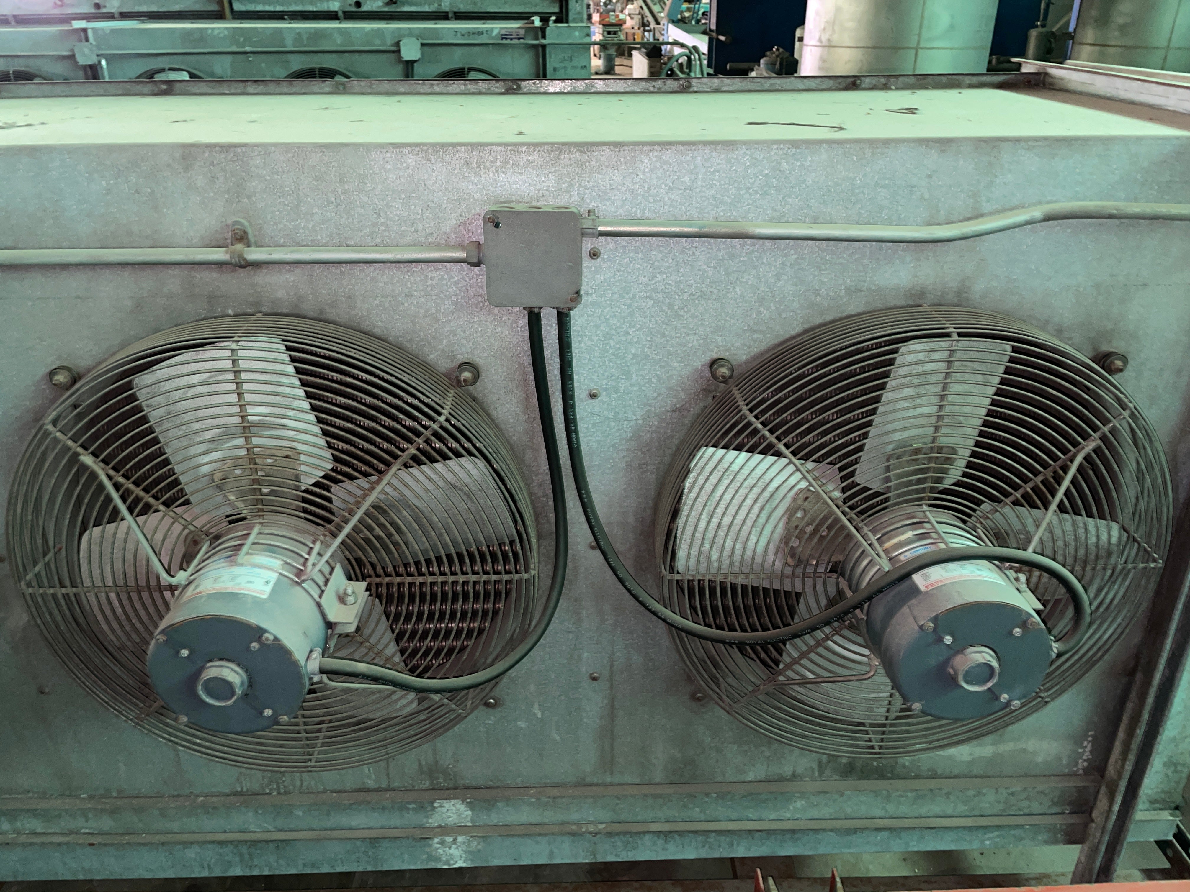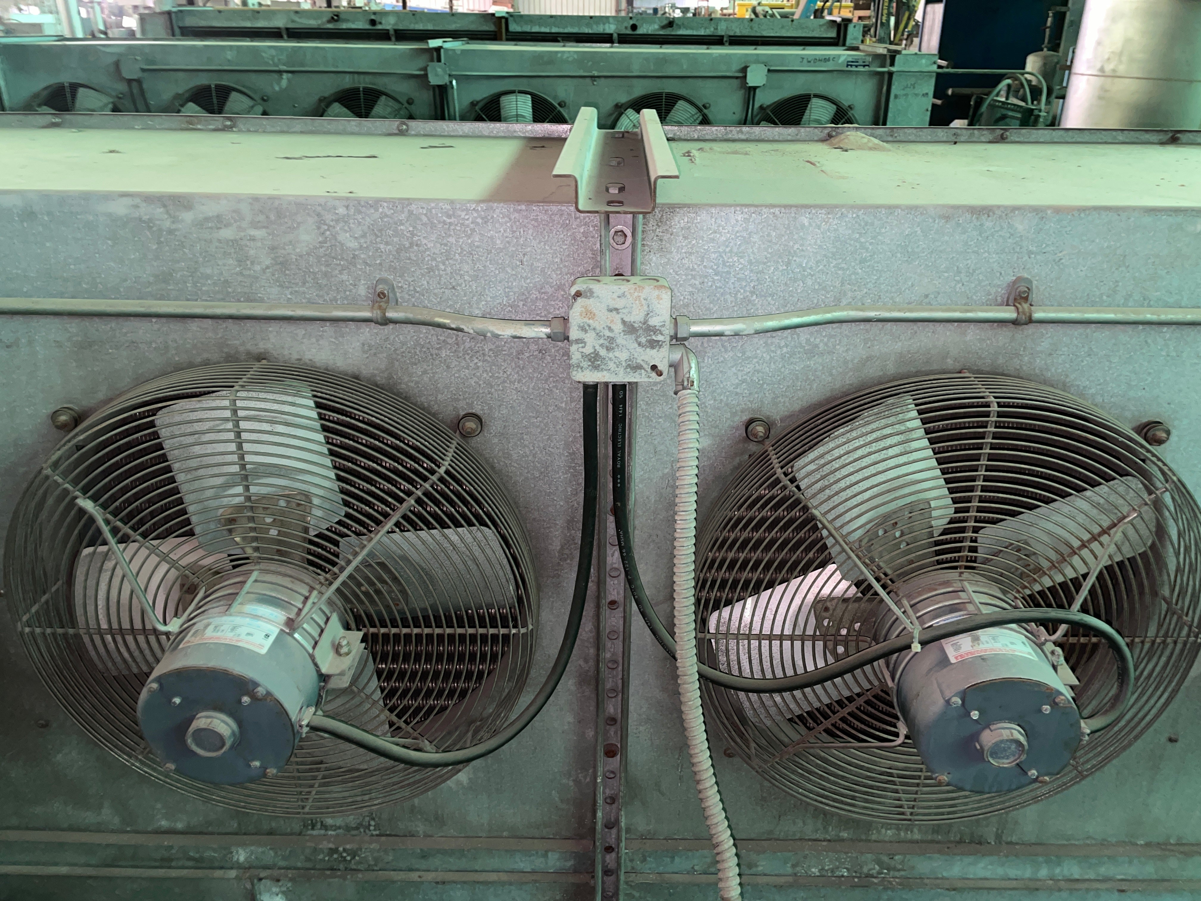 Frigid Coil Direct Expansion 6-Fan Evaporator Coil. Series 300 HTC-T 684 (29427 B). Serial 25003. Date 8/86. Motors: (6) 1/3 HP, 230V, 1.6 amps each, 1140 RPM, 3-phase, 60 Hz. 23,277 CFM. Refrigerant: R-22 (freon). Test pressure: 350 PSI. 4 FPI. Coil dimensions: 16.5 ft. L x 3.5 ft. W x 4 ft. H.
