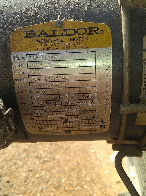 Frigid Coil Ammonia Evaporator. Model: HTC-184-1/3-C.W. Serial: 27995. Year: 1988. Test pressure: 350 PSI. Refrigerant H20. Baldor Industrial Motor: 1/3 HP, 208-230/460V, 1.7-1.6/0.8 amps, 1140 RPM, 3-phase, 60 Hz. Dimensions: 48 x 35 x 32 inches.