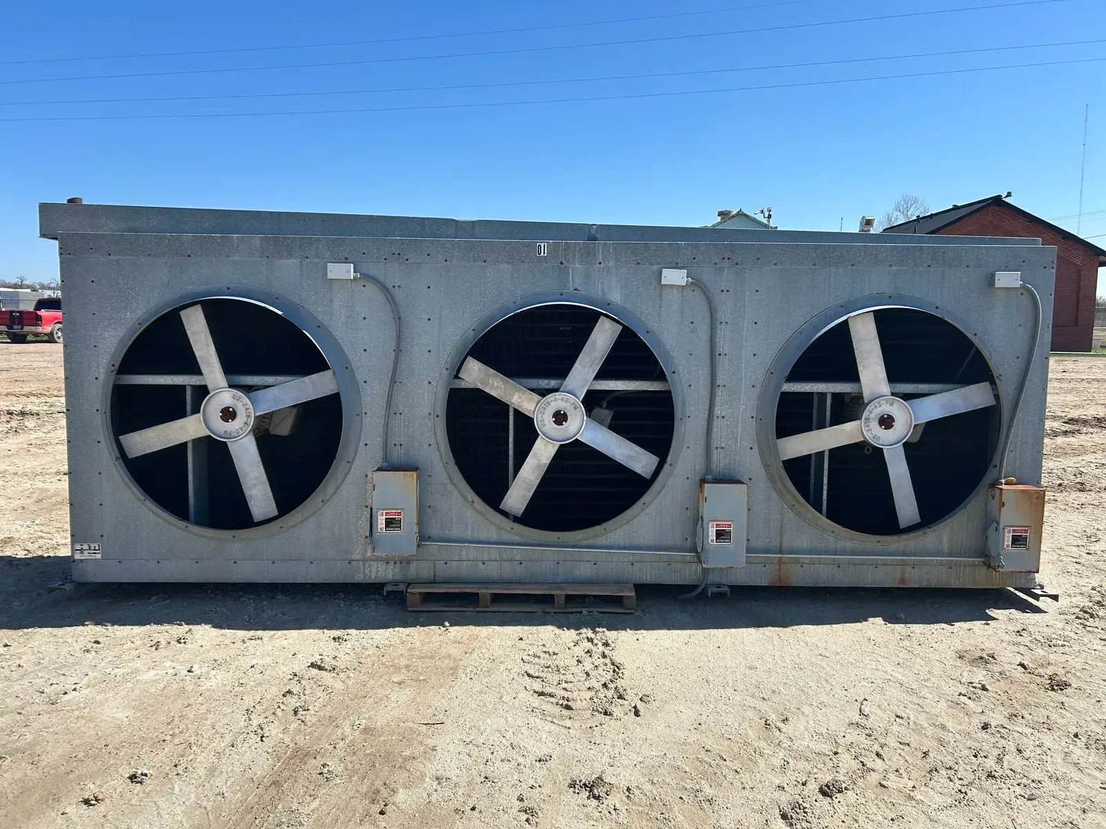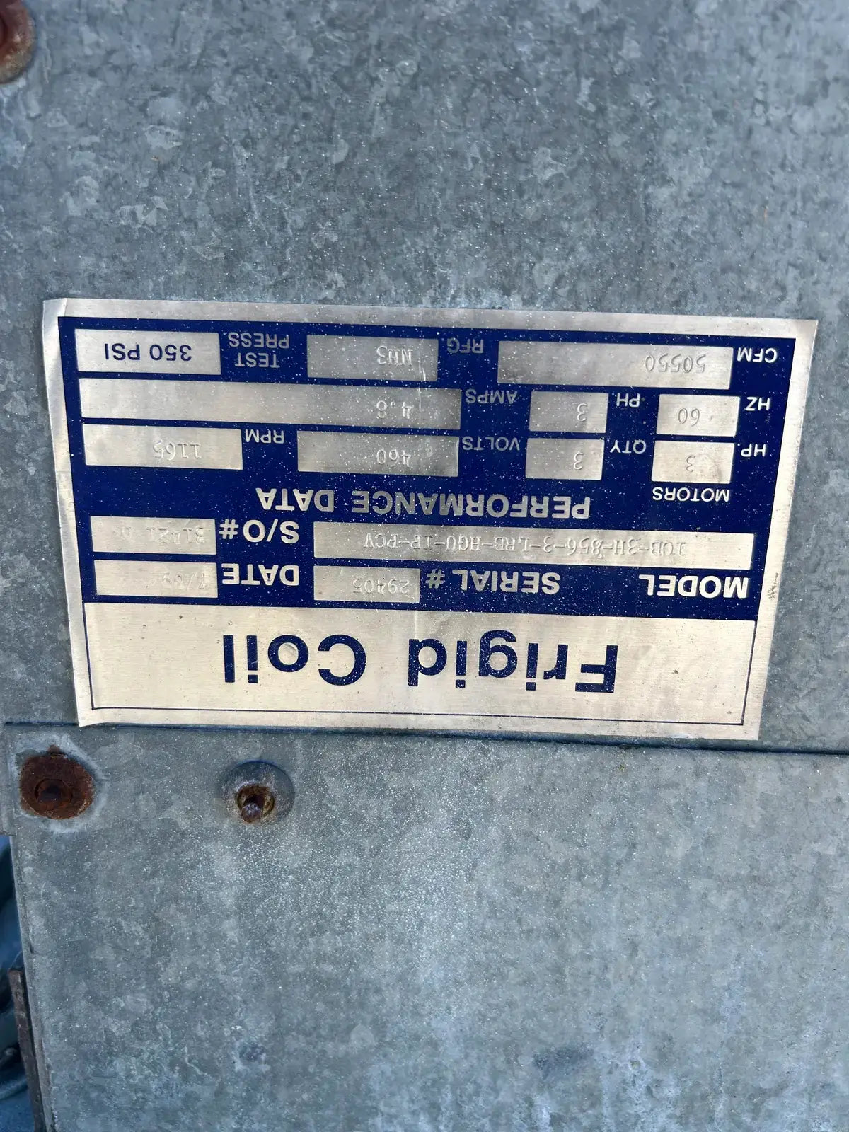 Frigid Coil ICB-3H-856-3-LRB-HGU-IP-PCV 230/460 Volt, 3 Phase Cooler Evaporator, 25.5 Ton, 3 fans with 3 HP motors. Unit designed for recirculated bottom feed (ammonia).