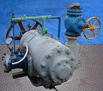 Fuller Rotary Vane Compressor- 100 HP. Model: A175. S/N: 70-20678-103. Speed: 590 rpm. Maximum temperature: 300 °F. Previously used with ammonia refrigerant. The A175 model has these nominal ratings: 103.8 TR (at 40F suction / +10F discharge), 949 ICFM, 108 BHP, 182.9 TR (at 20F suction/+20F discharge). Louis-Allis Motor, S/N: 2359174, 100 hp, 1760 rpm, 220 V, 246 amps, 60 Hz, 3 phase. Inlets: (1) 6 in. dia. port, (1) 1-1/2 in. dia. port. Outlets: (1) 8 in. dia. port. Overall dimensions (motor): 41 in. L x 37 in. W x 30 in. H. Overall dimensions (compressor): 68 in. L x 59 in. W x 57-1/2 in. H.