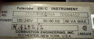 Fulscope Combustion Engineering Chart Recorder. Model: ER/C. S/N: 1912JB00104A. Power supply: 120/240 V, 50/60 Hz, 60 VA MAX. Overall dimensions: 1 ft. 3 in. L x 5 in. W x 1 ft. 3 in. H.