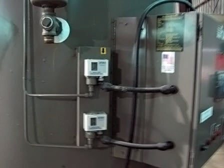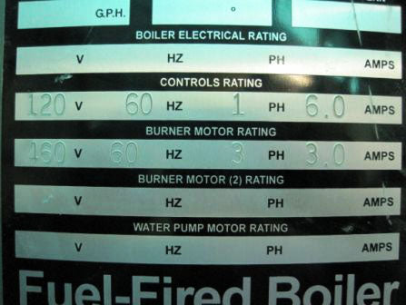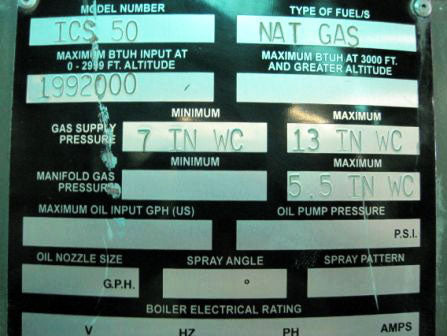 2007 Fulton Thermal Corporation Natural Gas Fired Steam Boiler. Model: ICS 50. Rated at 50 hp with steam output of 1725 lbs./hr. Maximum input: 1992000 BTUH. MWP: 15 psi. Heating surface area: 150 sq. ft. ACME Transformer. Catalog no. T 2-53009-S. Primary volts: 240x480V, secondary volts: 120/240V, 0.75KVA 50/60 Hz, 1 phase. Features a vertical, tubeless design and top-mounted, down-fired, power burner that fires down the full length of the furnace sending a flame of cyclonic action down the center furnace chamber. Convection fins help to transmit remaining heat they encounter from upward moving hot gases on to the outer side of the water vessel as those gases move towards exhaust ports. The result is uniform heat distribution for maximum efficiency. A unique fast-moving, fuel and air “premix” design also ensures decreased residence time of reactants within the flame zone, thus reducing emissions. Overall dimensions: 5 ft. 7 in. L x 4 ft. 7 in. W x 8 ft. 8 in. H.(H15)(ACN450).