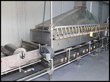 Gas Fired Tunnel Oven with 24 burners mounted above the belt. Belt width: 24 inches. Product clearance in oven area: 2.75 in. Conveyor belt gap: 0.5 in. Burner specs: Asia Infra-Red Burner Type A-1601 (Taiwan). Gas consumption rates (per burner): 0.45 kg/hr with LPG / 0.49 m^3/hr NGV. Heat: 5,400 kcal/hr (per burner). Tunnel has stainless steel construction. There is no nameplate or brand name listed on the tunnel. Previously installed in a fish cooking application in Texas. One end of conveyor features an air-knife blower, conveyor dip with roller, and second air blower. Features a cleaning dip tank for conveyor. Mechanical vari-speed drive is adjustable. Motor: Dayton model 3N297A, 0.5 HP, 230/460V, 3-phase, 60Hz. Includes a Square D Company Telemechanique model Altivar 16 motor controller, which will ship loose without an enclosure. Oven area is approximately 11 ft. 9 in. L. Overall length: 17 feet.