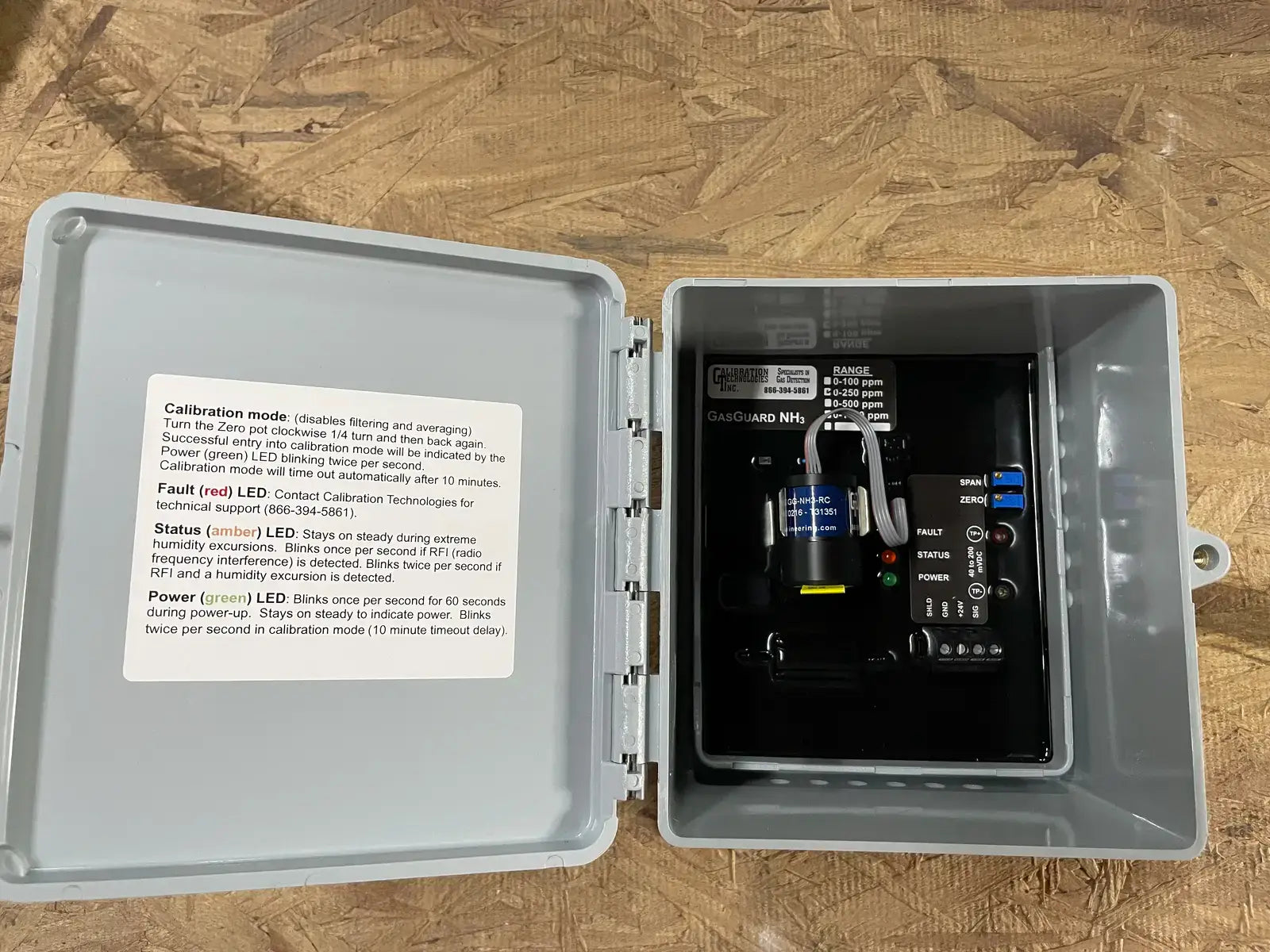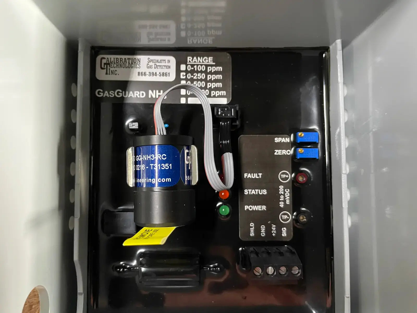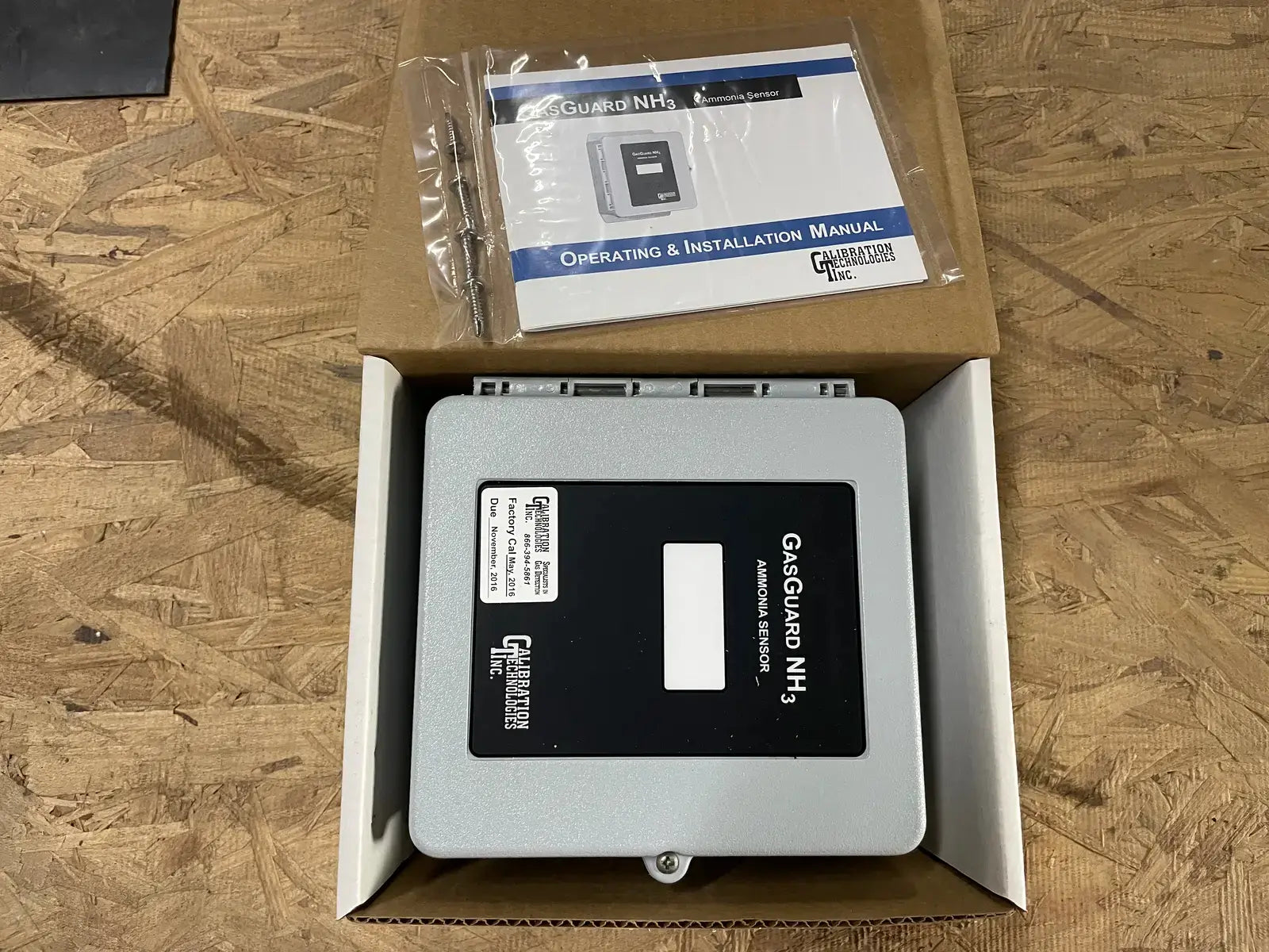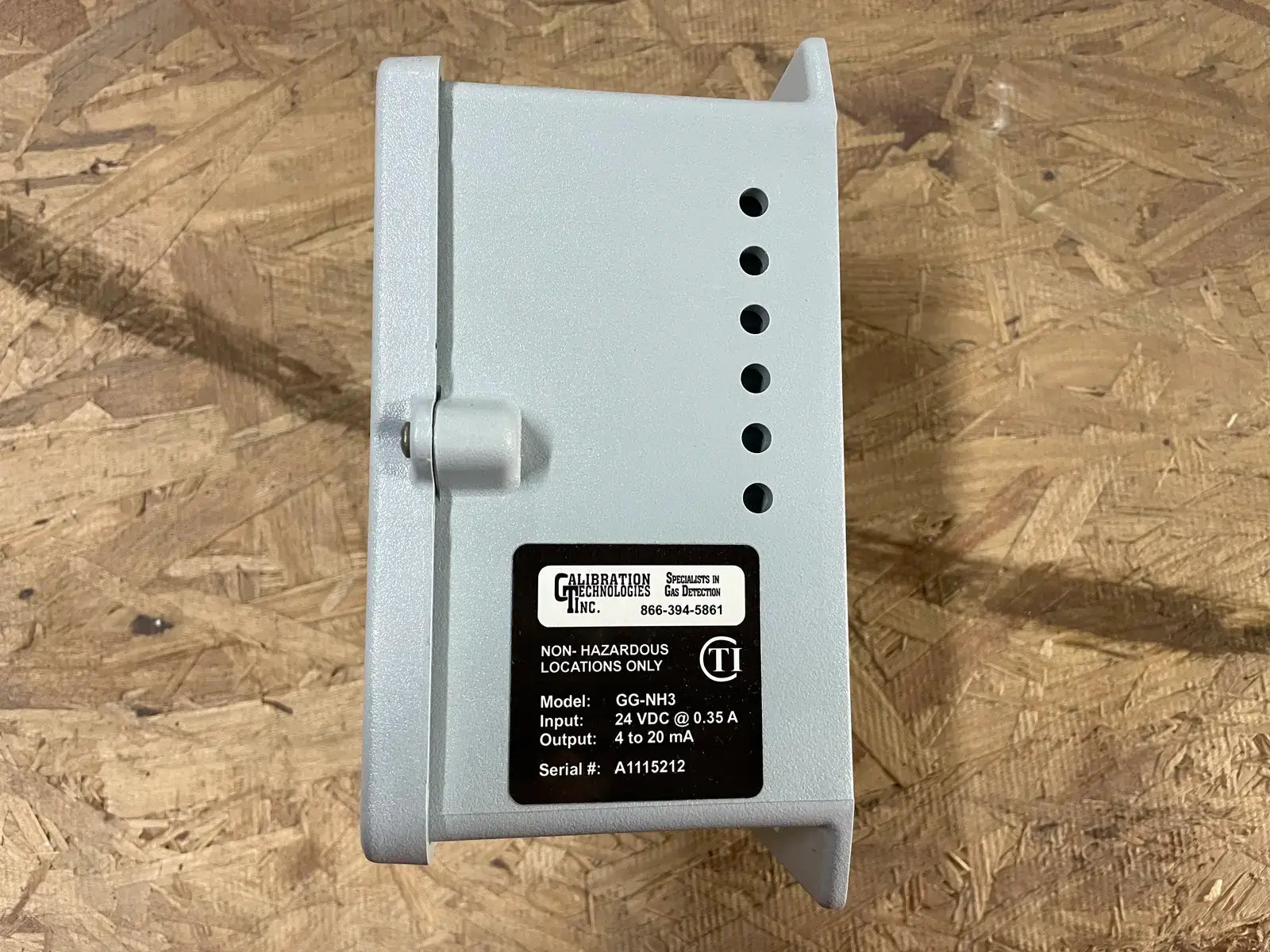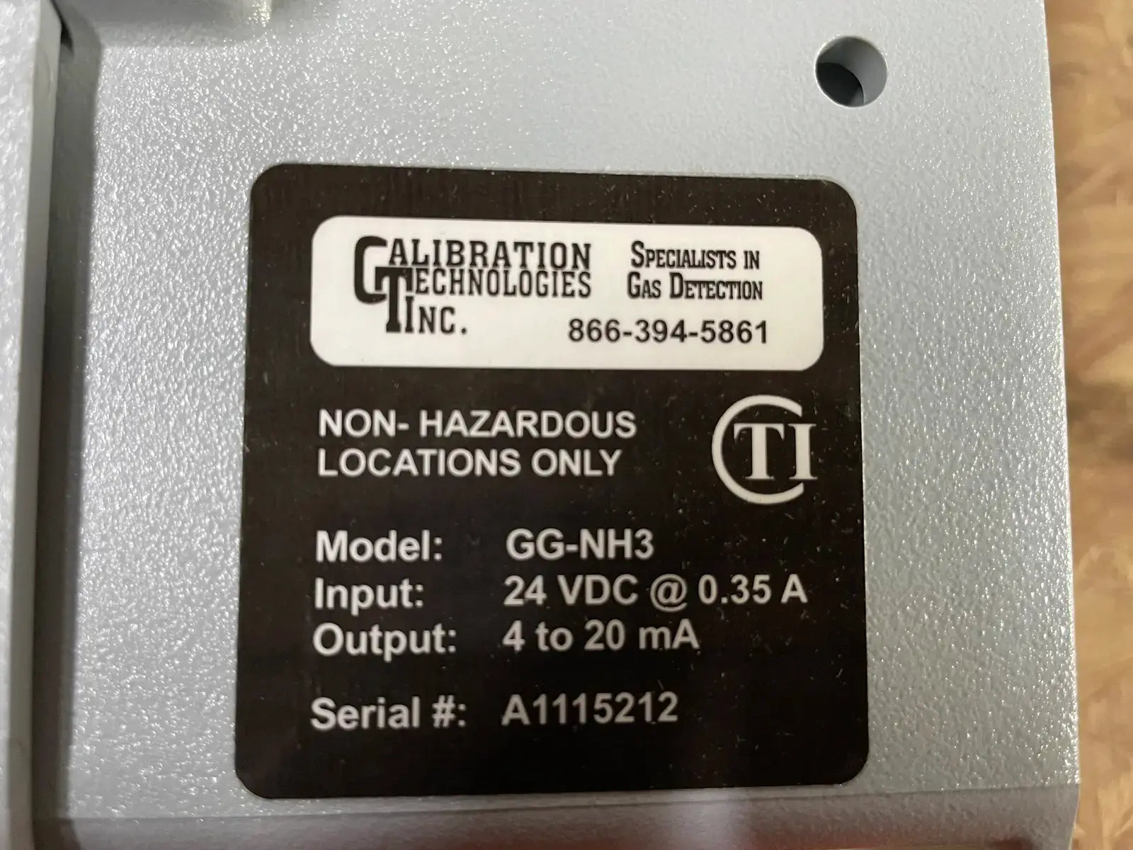 Gas Guard Ammonia Sensor. NH3. Model: GG-NH3. Serial No. A1115212. Input: 24VDC @ 0.35 A. Output: 4-20mA. Range: 0-250ppm.