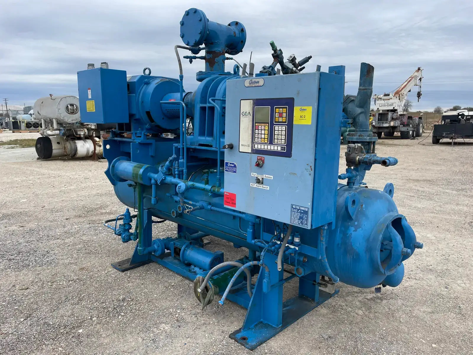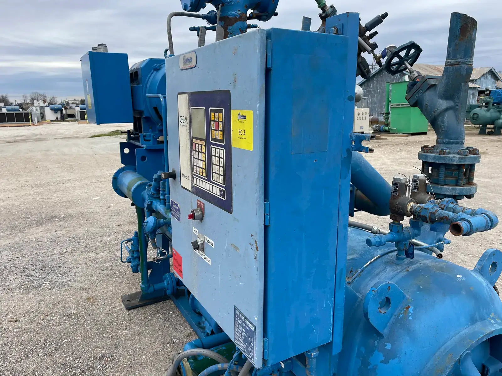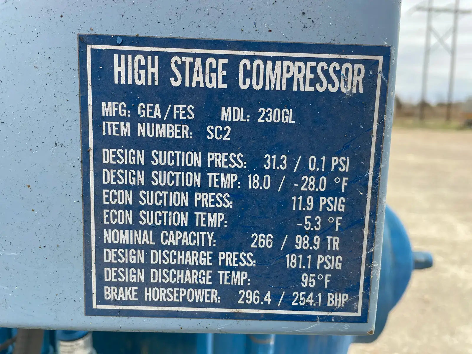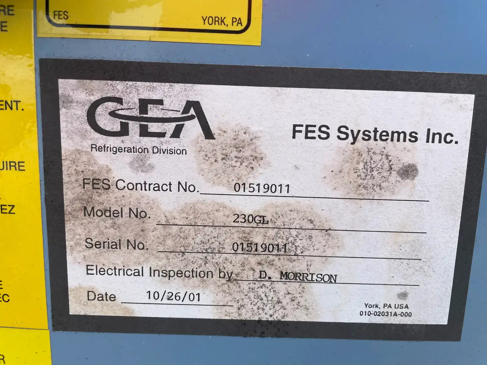 GEA FES Rotary Screw Compressor Package: FES Contract No: 01519011, Model No: 230GL, Serial No: 01519011. GEA Bare Screw Compressor: Model No: R-52, Serial No: R0479, Year of Mfg: 2001. Hydraulic Test Pressure: 620 PSIG. Max Design Working Pressure: 406 PSIG. Geometric Swept Volume @ 3550 RPM: 739 CFM. Max Input Speed: 3800 RPM. Refrigerant: R-717. Ram Industries High-Efficiency Refrigeration Duty Motor: HP: 300, Volts: 460, RPM: 3570, PH: 3, Hz: 60, Frame: 445TS. Certified by FES Oil Separator: National Board: 12395, Serial: 010467. MAWP: 300 PSI @ 500 F. MDMT: -20 F @ 300 PSI. Year 2001. Micro III GEA FES Control Panel. Previously ran with ammonia refrigerant.