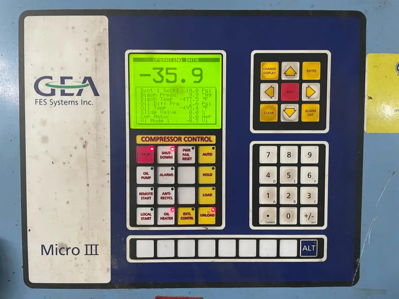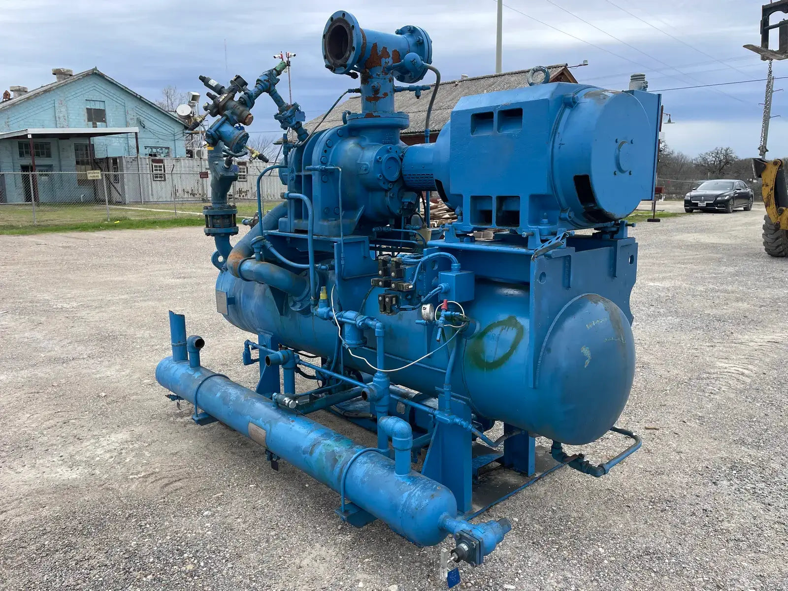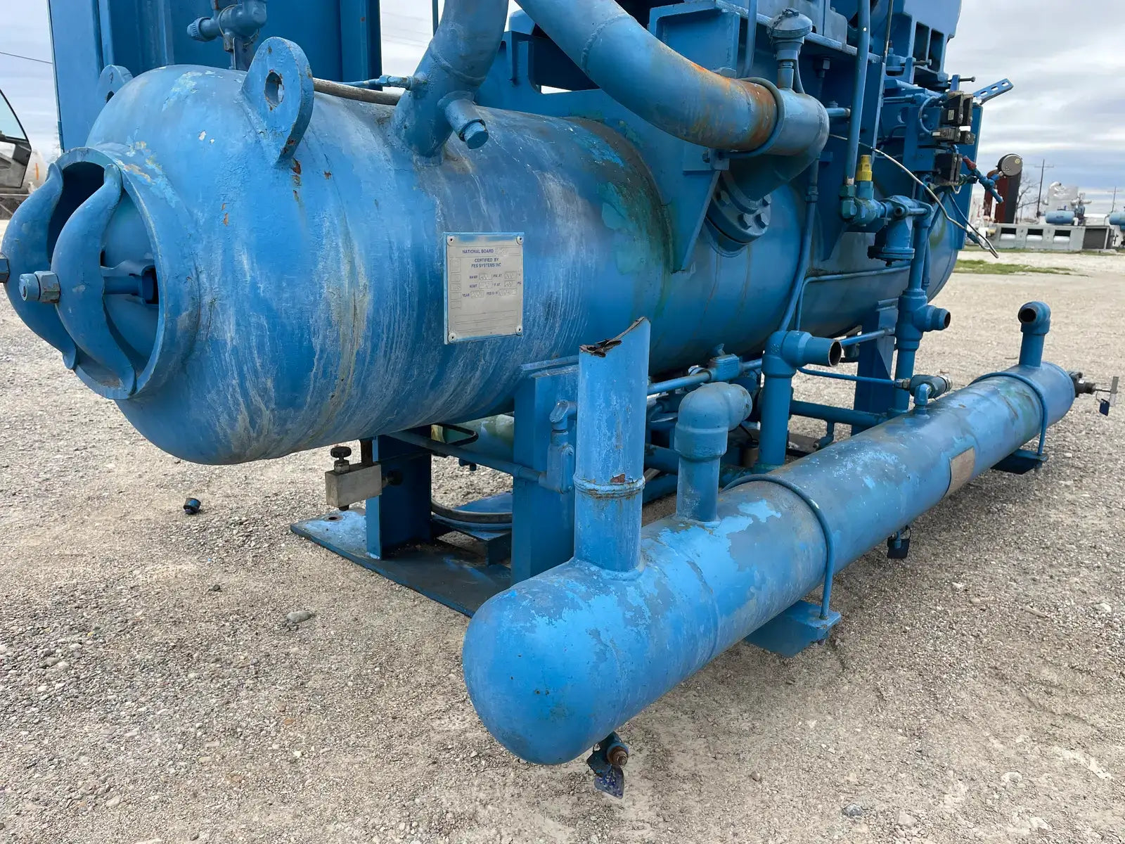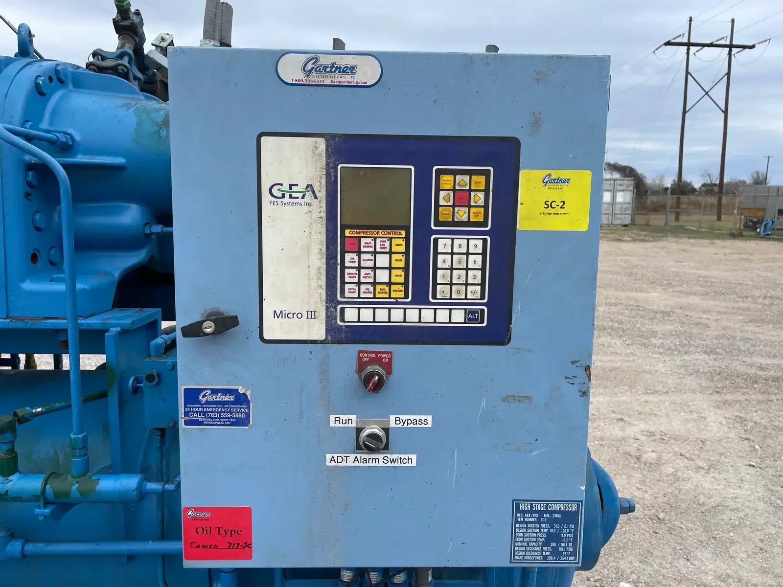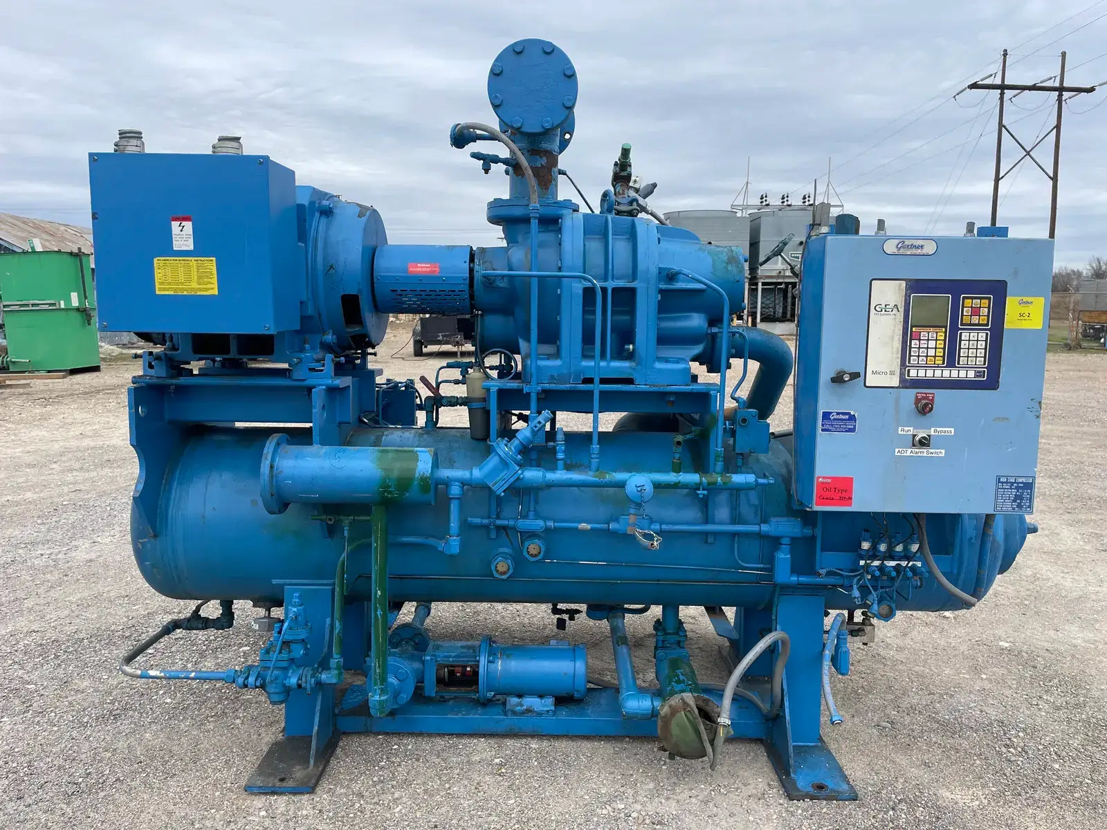 GEA FES Rotary Screw Compressor Package: FES Contract No: 01519011, Model No: 230GL, Serial No: 01519011. GEA Bare Screw Compressor: Model No: R-52, Serial No: R0479, Year of Mfg: 2001. Hydraulic Test Pressure: 620 PSIG. Max Design Working Pressure: 406 PSIG. Geometric Swept Volume @ 3550 RPM: 739 CFM. Max Input Speed: 3800 RPM. Refrigerant: R-717. Ram Industries High-Efficiency Refrigeration Duty Motor: HP: 300, Volts: 460, RPM: 3570, PH: 3, Hz: 60, Frame: 445TS. Certified by FES Oil Separator: National Board: 12395, Serial: 010467. MAWP: 300 PSI @ 500 F. MDMT: -20 F @ 300 PSI. Year 2001. Micro III GEA FES Control Panel. Previously ran with ammonia refrigerant.