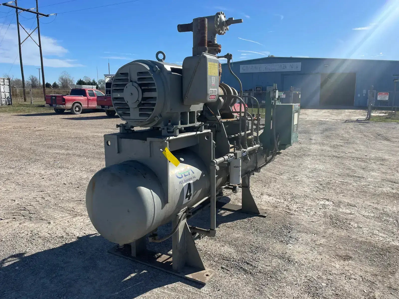 GEA N-5 screw compressor powered by a 250 HP, 460 Volts Toshiba 3-phase induction motor. The package also includes a Frick Quantum LX Series control panel as well an FES Certified oil separator.