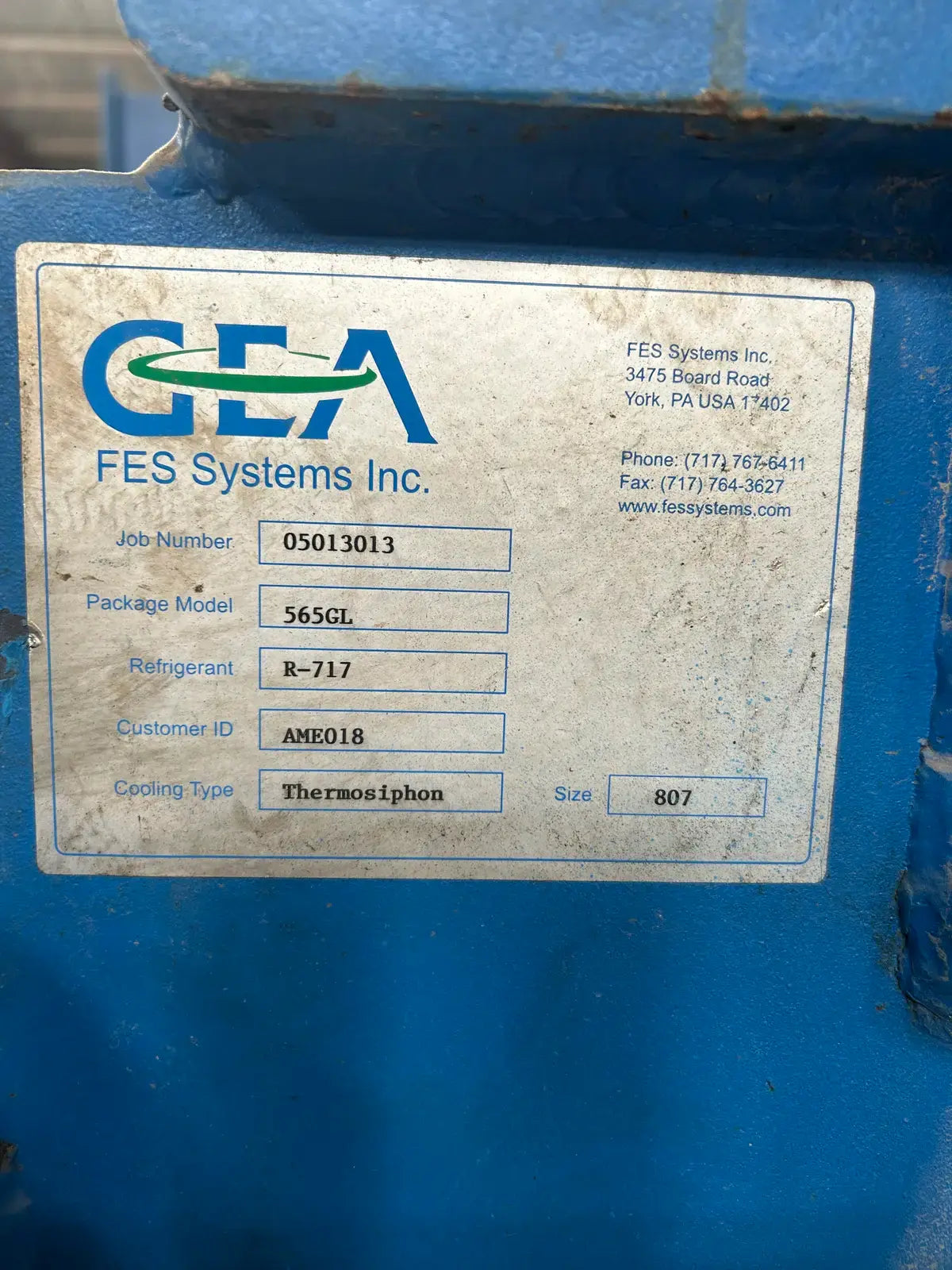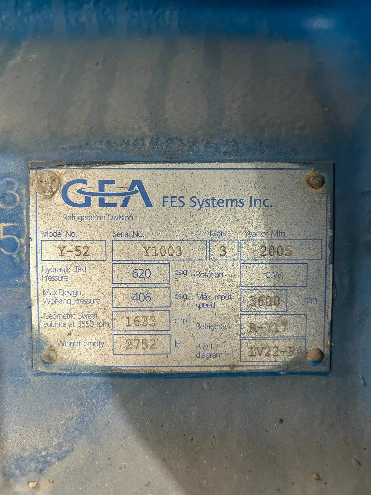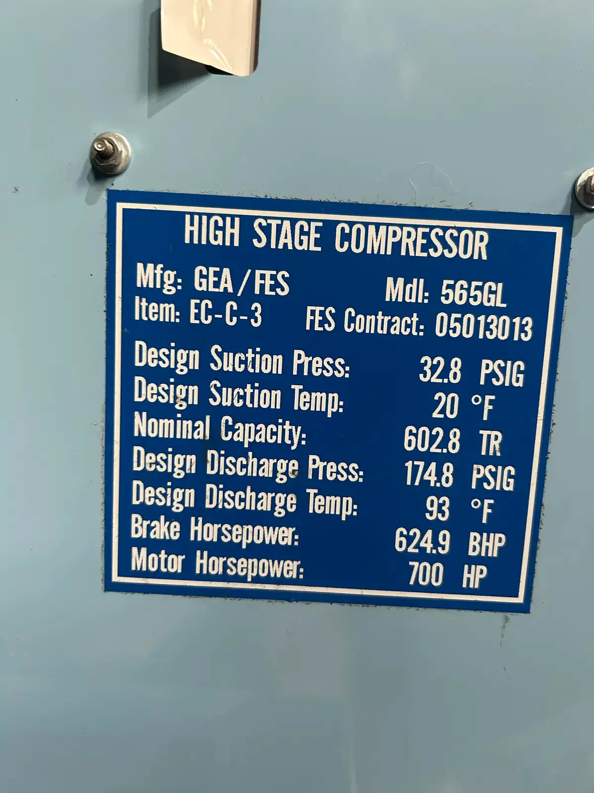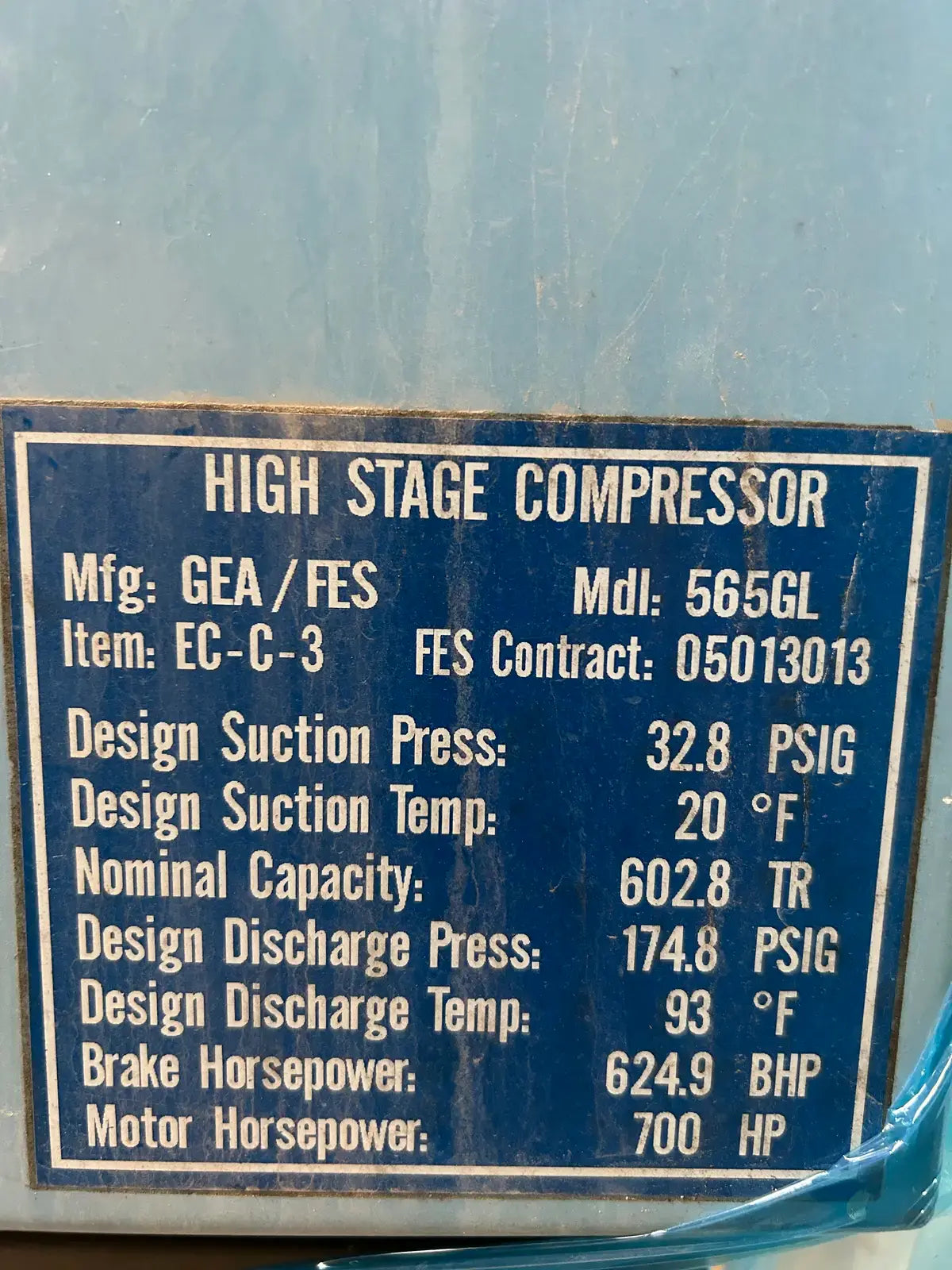 GEA / FES Rotary Screw Compressor Package. Model 565GL High Stage. Year: 2005. Item EC-C-3. FES Contract 05013013. Design suction: 32.8 PSIG / 20F. Nominal capacity: 602.8 TR. Design Discharge: 174.8 PSIG / 93F. Brake HP: 624.9. Includes GEA micro. Refrigerant: ammonia. Removed from operation in January/February 2014. Unit has been stored indoors. Package is equipped with: Grasso brand compressor, Thermosyphon Oil Coolers, Shell and Plate style, Oversized Oil Separators, Dual Oil Filters, Motor Temperature and Vibration Sensors, Benshaw motor starter, and Ram Industries motor. Compressor specs: model Y-52, serial R1003, Mark 3, year 2005, 406 PSIG MDWP, 1633 CFM, R-717. The Grasso Y has a throughput of 1703 CFM. Cooling capacity (NH3 ammonia): 608 KW at -35C/+35C and 2321 KW at 0C/+35C (172.88 TR at -31F/+95F and 660 TR at +32F/+95F). Motor specs: 700 HP, 460V, 756 FLA, 3570 RPM, 60 Hz, 3-phase, 5010S Frame. Hours runtime: 23,080. Weight: 17,000 lbs. Overall dimensions: 77 in. W x 175 in. L x 120 in. H.